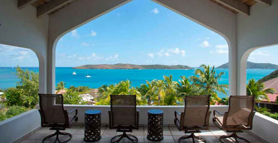 Spyglass Villa's panoramic terrace is perched fifty feet above Leverick Bay overlooking North Sound, only a one minute walk to a private beach and three minutes to the Leverick Bay Resort.
