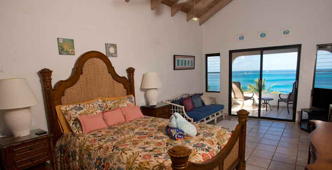 Spyglass Villa includes two master bedrooms on the main level, each with bathroom en-suite. The East bedroom includes a king-sized bed, desk and chair and overlooks the East side of North Sound from its covered patio.