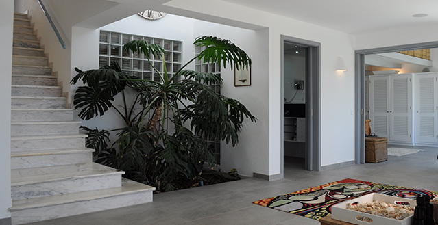 On the upper floor (entrance level) is a family suite which has its own living/dining room with fire place, including kitchenette and en-suite bathroom. An extensive terrace offers wonderful views on a cactus garden and the sea with the Martinhal island on the horizon. A staircase leads from the living to a mezzanine level with two double beds. Also on the upper floor is a double bedroom with en-suite bathroom and terrace with sea view. This lay-out makes the villa ideal for two families holidaying together (or one family plus parents / children who will have their own section in the villa).