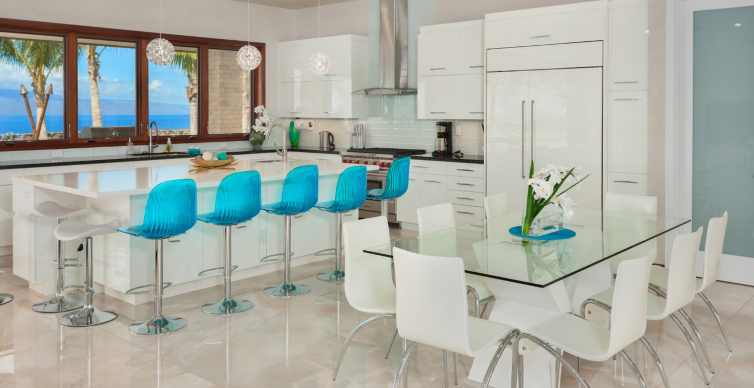 Nothing is an afterthought at Seaside Oasis. Five bedrooms and six bathrooms are situated throughout the sprawling 4,300 square-foot villa, providing ample room for up to 10 guests. The spacious and open floor plan provides an effortless flow, with views from virtually every room in the house. Glass doors lead to the covered patio where guests can enjoy a peaceful breakfast, afternoon cocktails or an al fresco dinner. Be sure to light the tiki torches for the quintessential Hawaiian backdrop.
