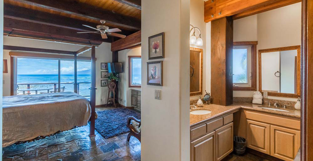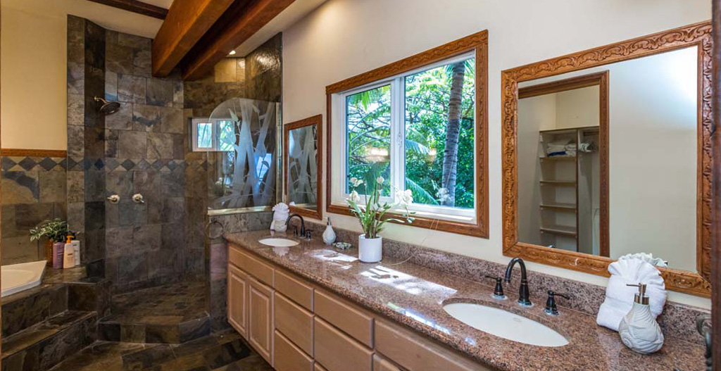The home features 4 Beautiful Suites all with amazing layout and views. Each room is decorated to feel as if you are living within a part of Hawaii vs. a hotel or simple accommodation, you are connected by the feel of the woods, the inspirational decor and the wonderful views. Each Suite Features a King Bed, with 2 bedrooms for guests featuring twins. The house easily sleeps 12 guests and up to 12 comfortably.