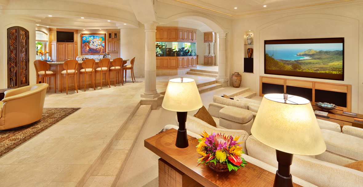 Need a break from Maui's gorgeous sunshine and warmer mid-day temps? Plop down on the sunken living room sofa and watch a movie or tv show on the 9.5 foot HD screen. Press a button to drop the sun shades. Before you know it, you might just be in slumber-land. We will let you figure out how to best enjoy "Pete's Bar". There's plenty of entertainment waiting for you there, just follow one of the drink recipe books, run one of the many blenders, toss in a paper umbrella (stocked - of course!), grab a custom printed Waterfalls Estates napkin and gulp down your favorite tropical refreshment. How about a drink mixing competition too?