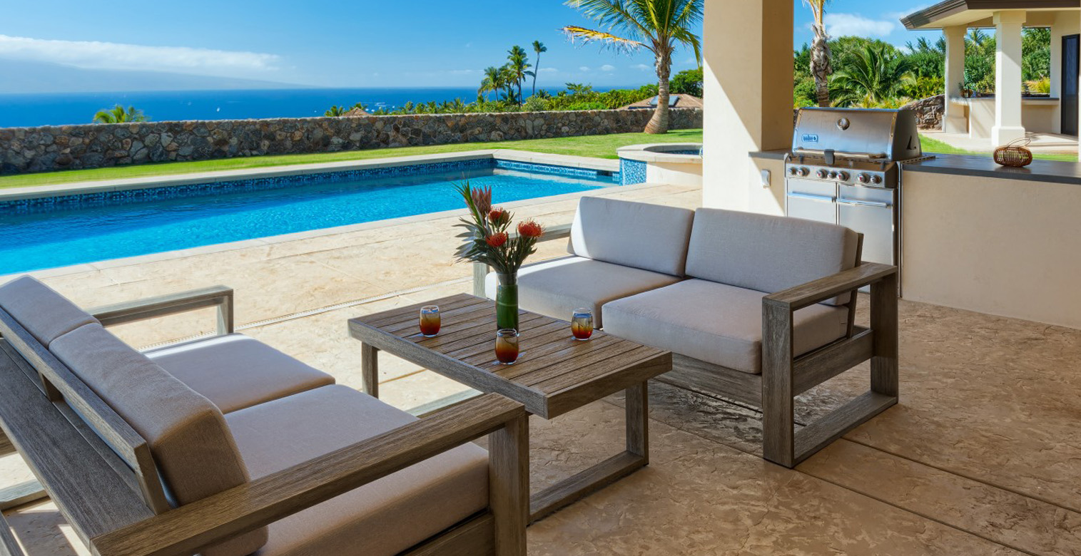 The rectangular pool and spa are the centerpiece of the terraced backyard and offer day and nighttime enjoyment. A built-in barbecue conveniently positioned under the shade of the lanai invites guests to embrace outdoor Hawaiian villa living and grill up some of Maui’s fresh ocean bounty.