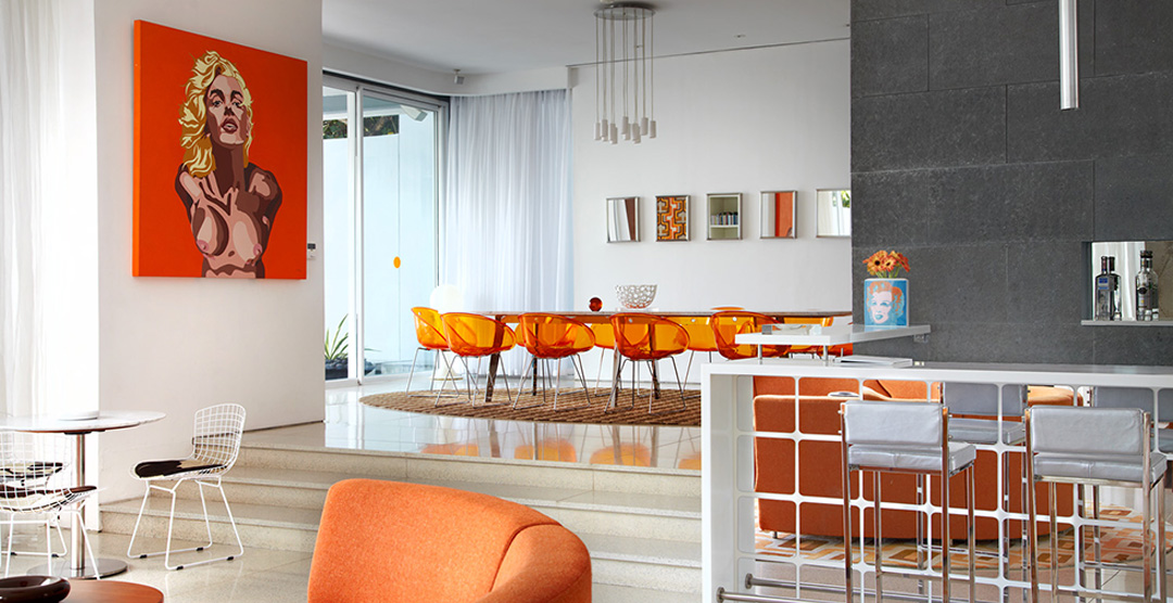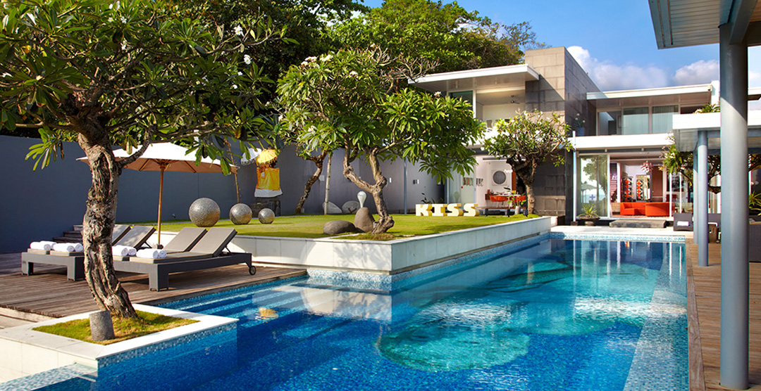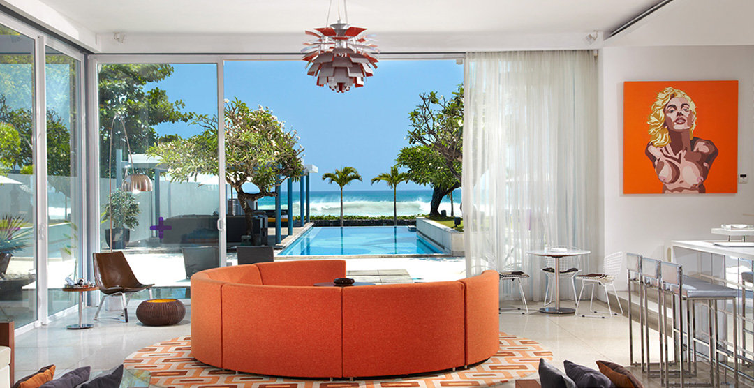 Architect David Wahl and interior designer Melanie Hall, have seamlessly fashioned a five-bedroom residence with private terraces and gardens, a 20m pool styled with Marilyn Monroe mosaics all superbly positioned beachfront and overlooking the Indian Ocean. This is a serious celebration or party villa with direct access onto the renowned sands and surf-break of Seminyak Beach. With the ocean literally on your doorstep the open air balé adds the finishing touch to outdoor dining and your private chef is ever on hand to produce the ultimate in gourmet feasts. Despite every temptation to stay put, those wanting to explore will soon discover themselves bang in the heart of exciting Seminyak with all the restaurants, cafes, bars and boutiques at your feet. In the two-levelled living areas the ultra-modern, minimalist style is reminiscent of the great modernism of the past and all the furniture, carpets and fabrics have been custom designed.