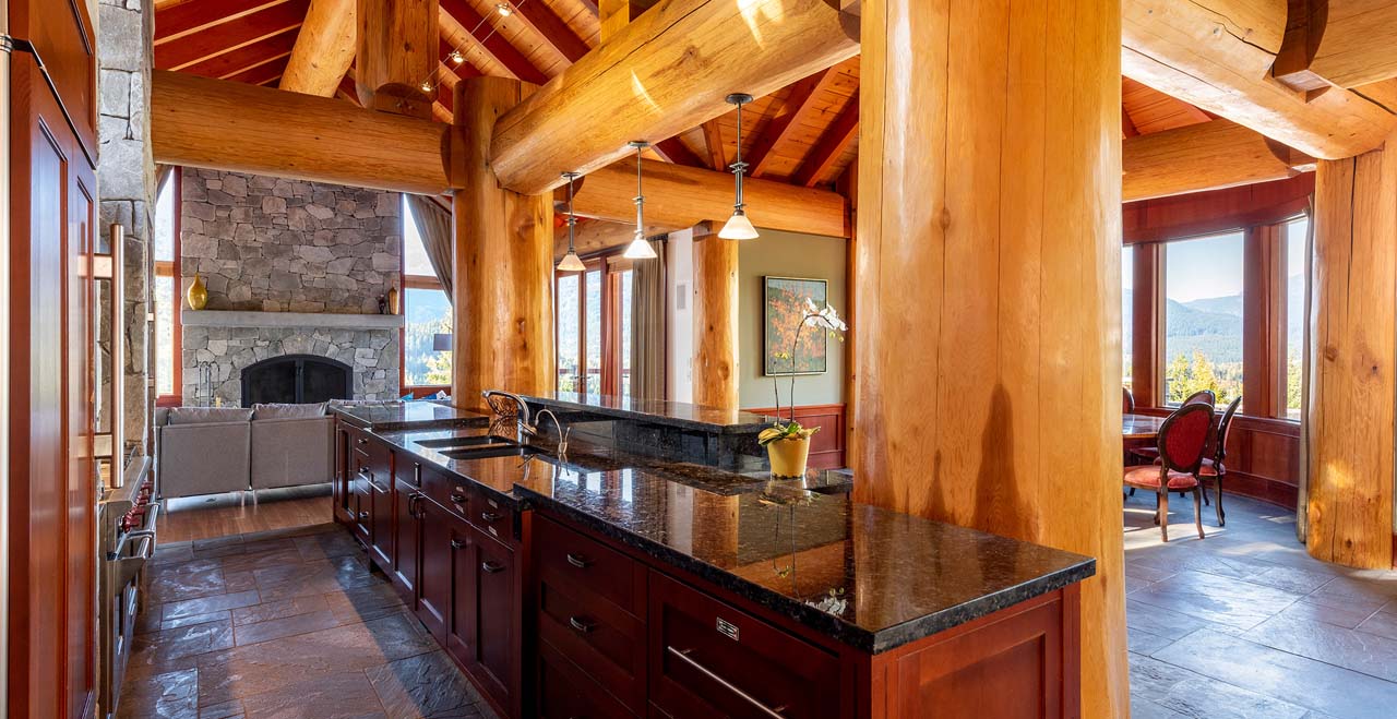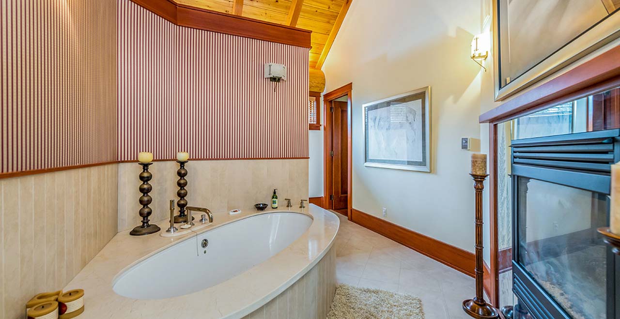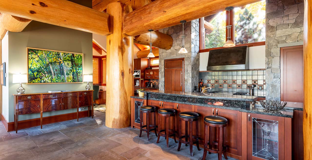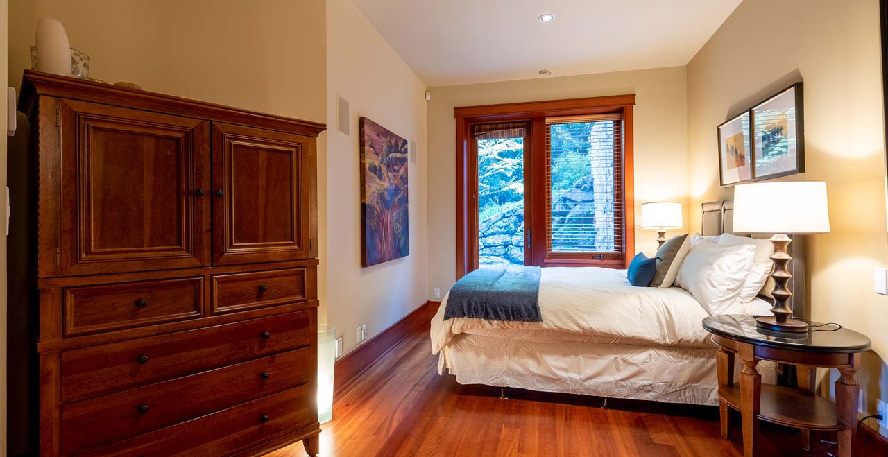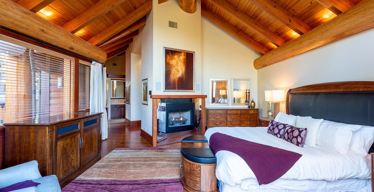 Main Floor (Entrance Level): 3 bay garage and spacious foyer leading to a gorgeous open-plan kitchen, dining and living area. Gourmet kitchen with high-end gas appliances and all the accouterments, with pass-thru to adjacent dining area seating 10 around a circular table. The kitchen-dining area flows to the living area with ultra comfy seating around a huge rock, wood-burning fireplace. Large wrap-around deck off the entire area. Stunning circular staircase to top floor. Vaulted ceilings, extensive woodworking and large expanses of glass complete the stunning design of this home. One bedroom off the main level with King bed and private ensuite bathroom.