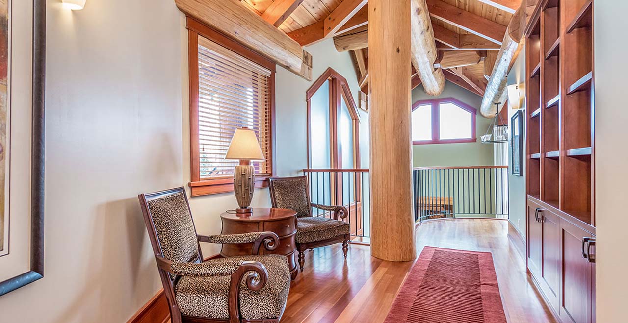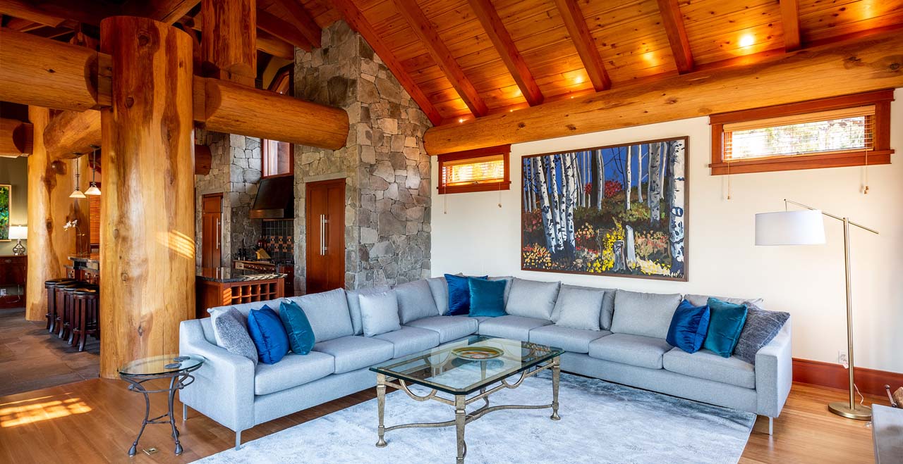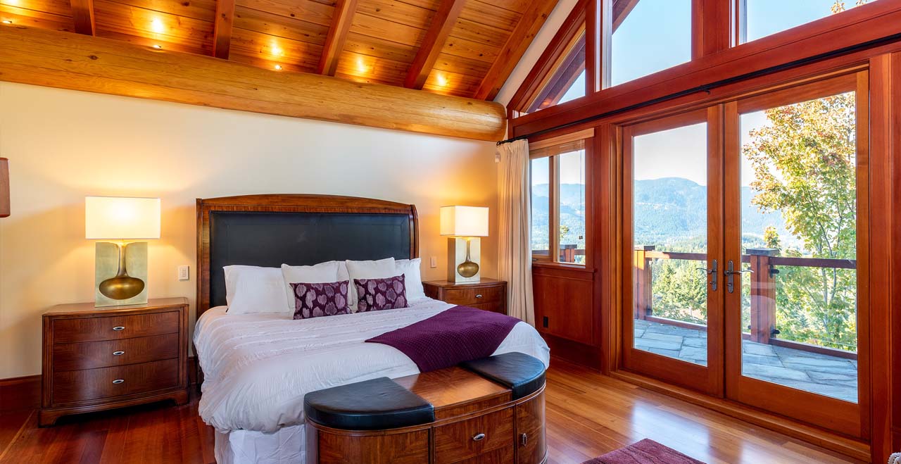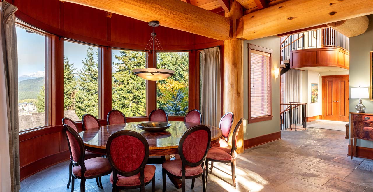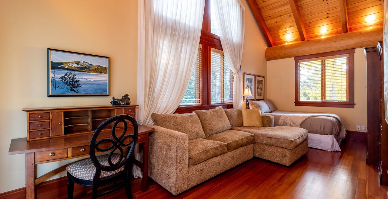 Main Floor (Entrance Level): 3 bay garage and spacious foyer leading to a gorgeous open-plan kitchen, dining and living area. Gourmet kitchen with high-end gas appliances and all the accouterments, with pass-thru to adjacent dining area seating 10 around a circular table. The kitchen-dining area flows to the living area with ultra comfy seating around a huge rock, wood-burning fireplace. Large wrap-around deck off the entire area. Stunning circular staircase to top floor. Vaulted ceilings, extensive woodworking and large expanses of glass complete the stunning design of this home. One bedroom off the main level with King bed and private ensuite bathroom.