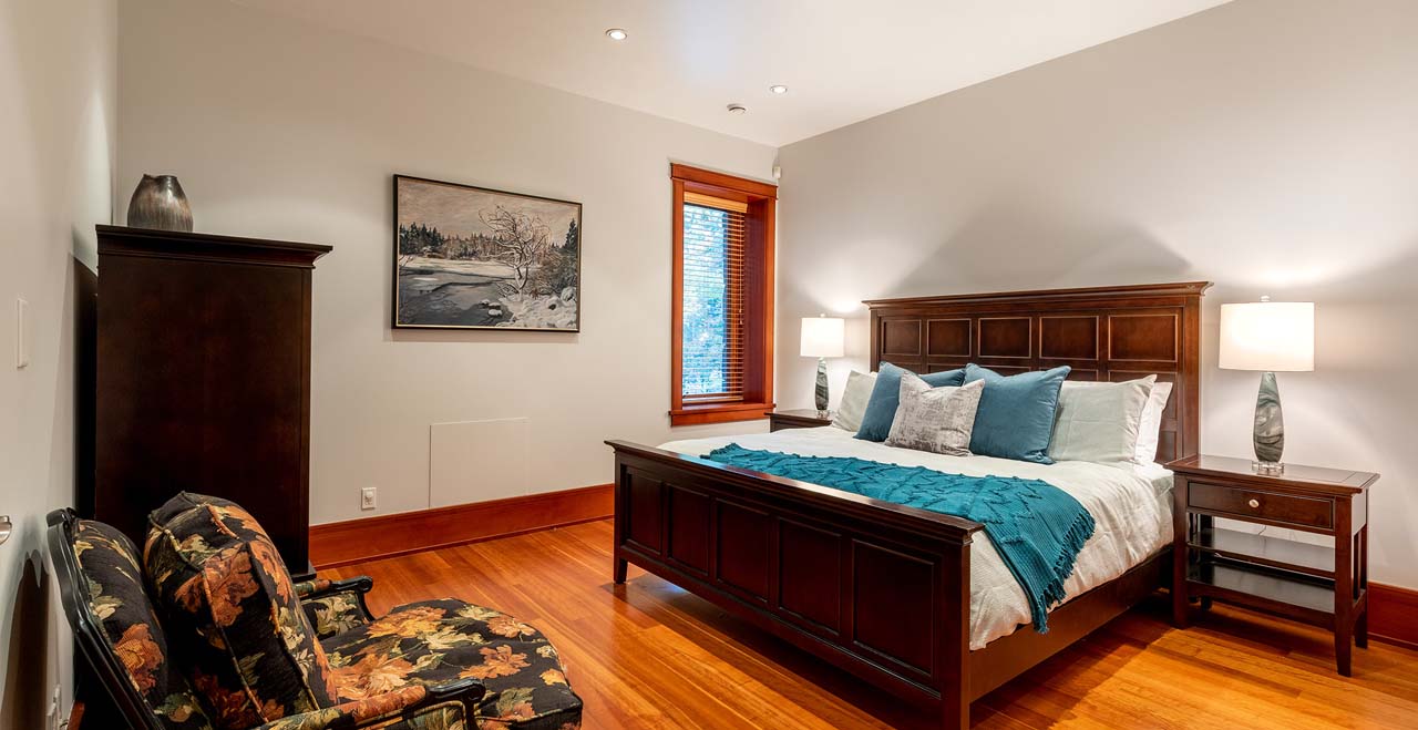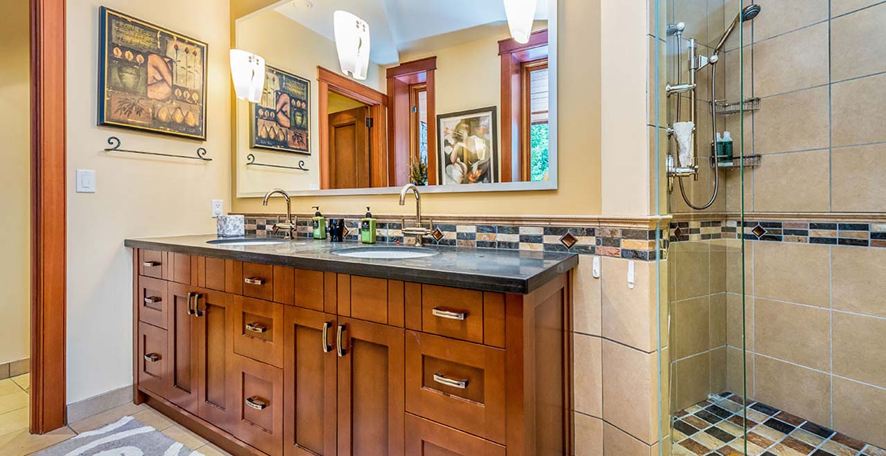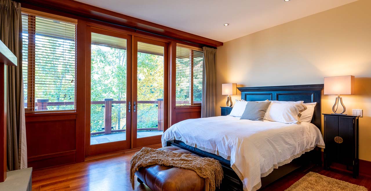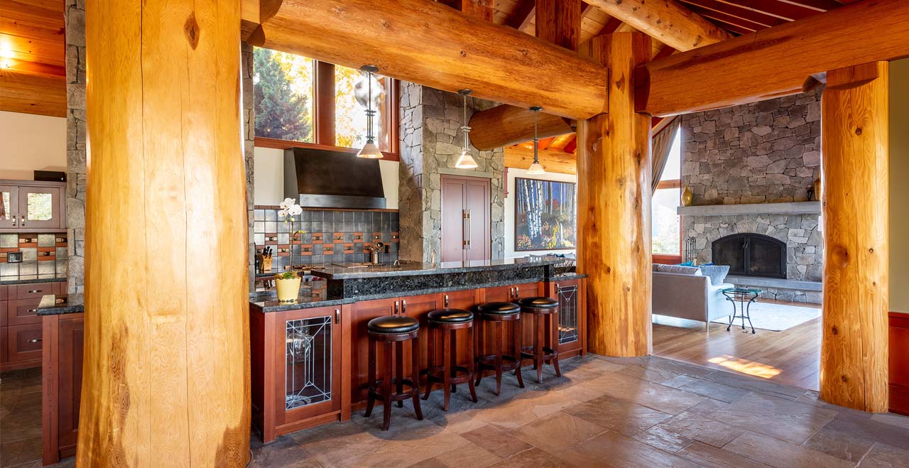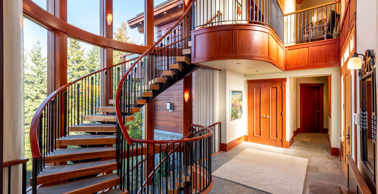 Main Floor (Entrance Level): 3 bay garage and spacious foyer leading to a gorgeous open-plan kitchen, dining and living area. Gourmet kitchen with high-end gas appliances and all the accouterments, with pass-thru to adjacent dining area seating 10 around a circular table. The kitchen-dining area flows to the living area with ultra comfy seating around a huge rock, wood-burning fireplace. Large wrap-around deck off the entire area. Stunning circular staircase to top floor. Vaulted ceilings, extensive woodworking and large expanses of glass complete the stunning design of this home. One bedroom off the main level with King bed and private ensuite bathroom.