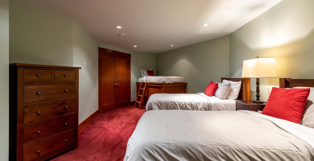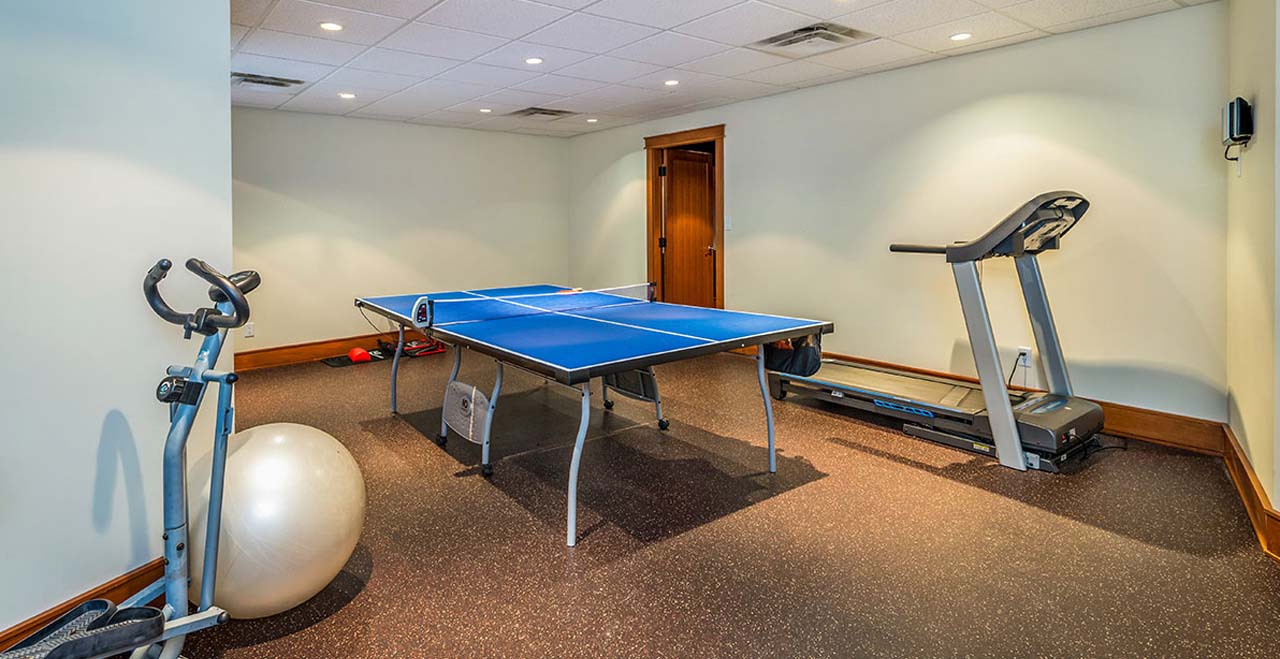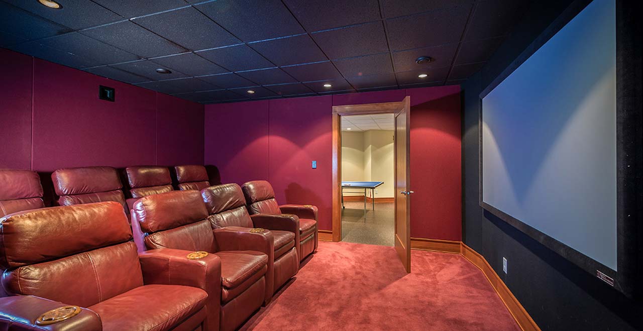Basement (Bottom) Level: 6th bedroom with 3 twins and full en-suite bath. Large stretching/exercise area, plus ping-pong table, running machine. Full home theater media room with 72” screen, 20 leather ascending seats.