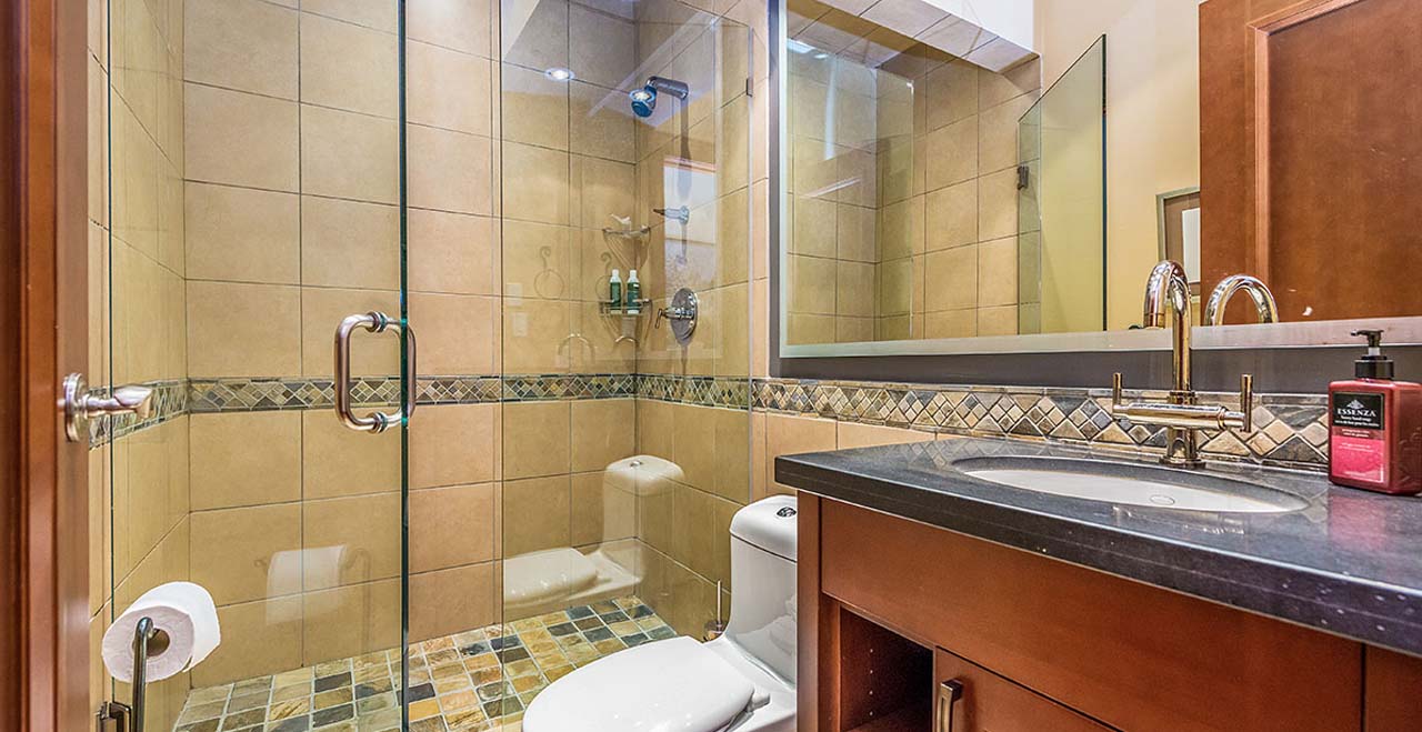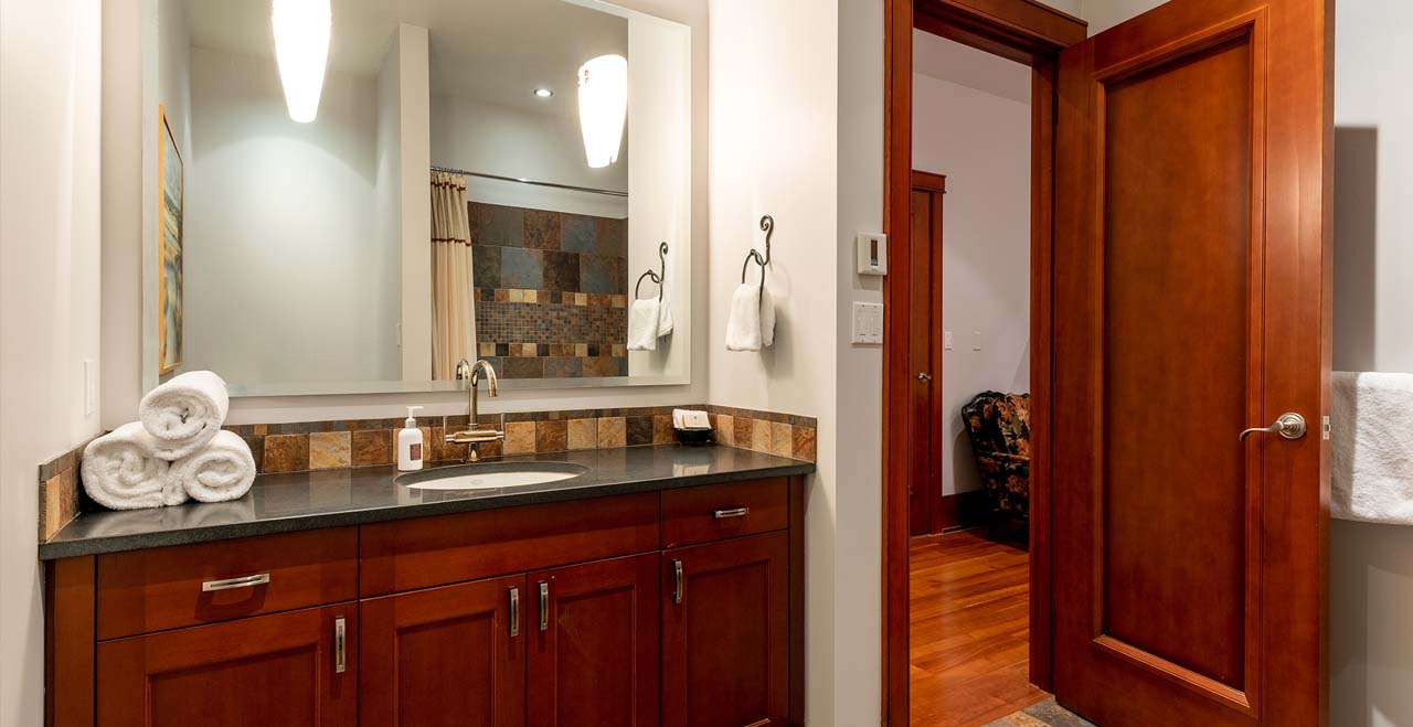 Top Floor (Master Suite): Expansive master bedroom area featuring 2 bedrooms with full en-suite baths. Master has king bed, 42” disappearing flat screen tv, huge soaker tub with gas fireplace, walk-in closets, double vanity.The nanny suite has queen bed and full en-suite bath. Lacks for nothing to pamper you on your vacation.