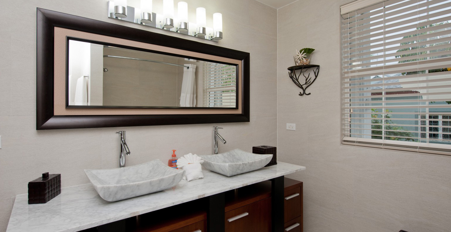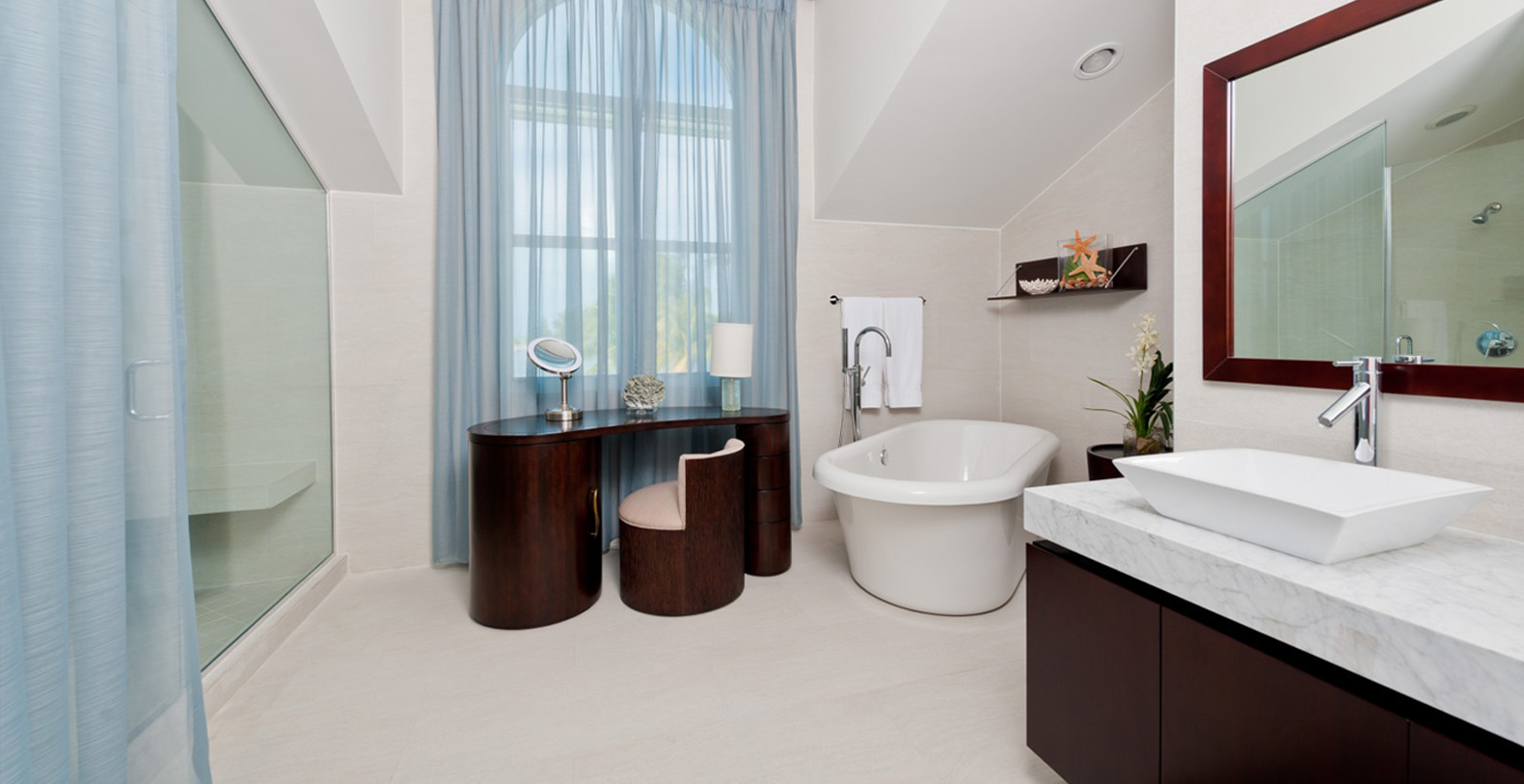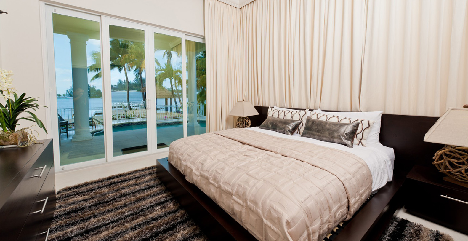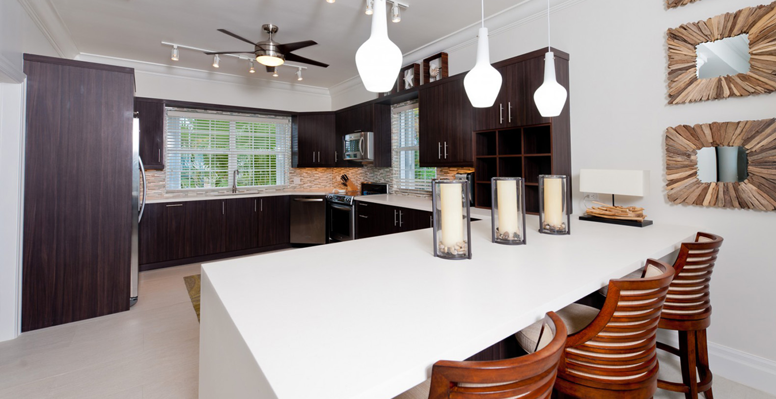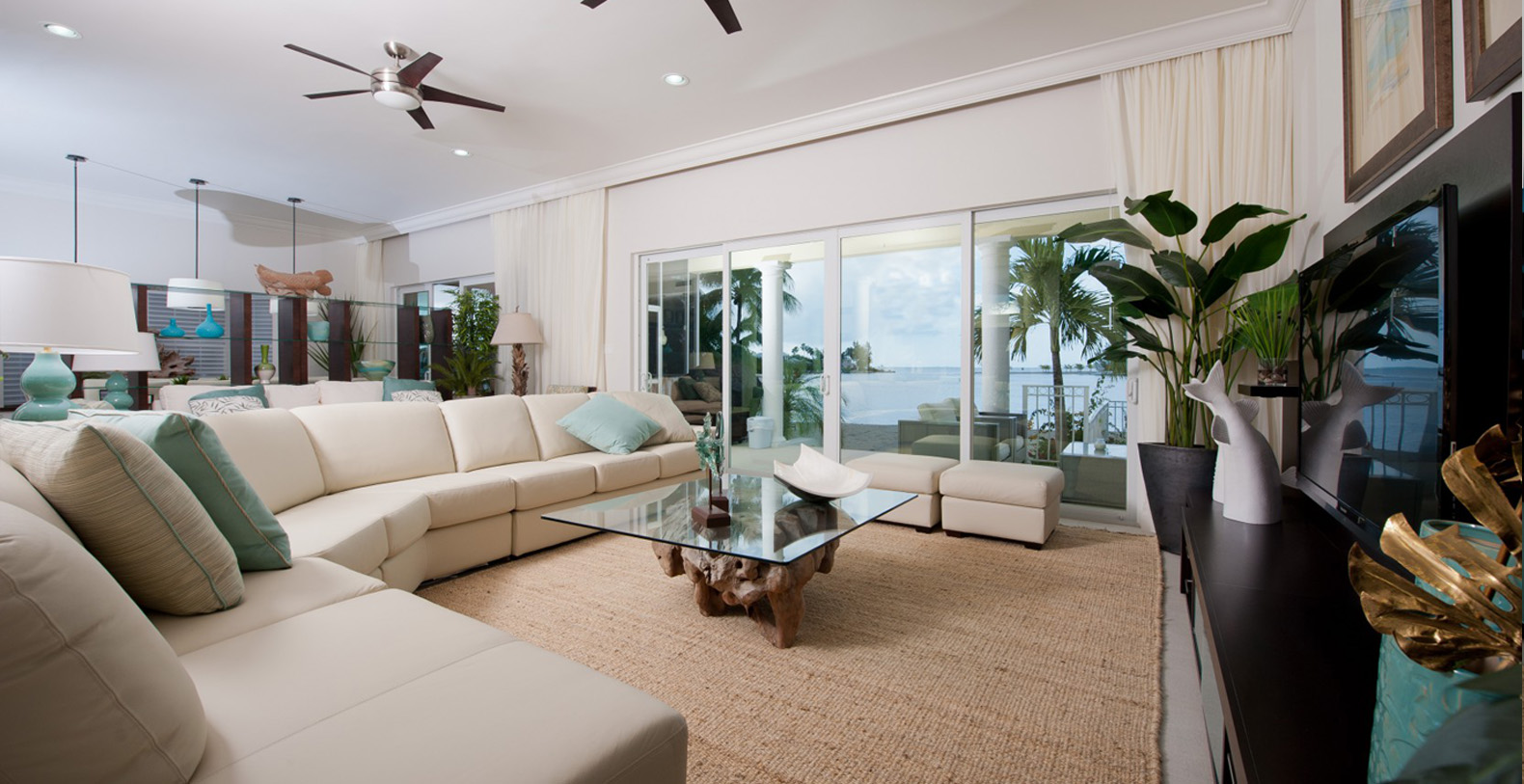 The light-filled, professionally decorated interior of Treasure Cove is a striking setting for your unforgettable vacation. A 12-person, glass-top dining table with contemporary leather chairs will encourage you to extend dinner well into the night. Several conversation areas comprise the huge living area, including an L-shaped leather couch that invites indulgent afternoon naps. A gleaming gourmet kitchen allows several chefs to work their magic at once.