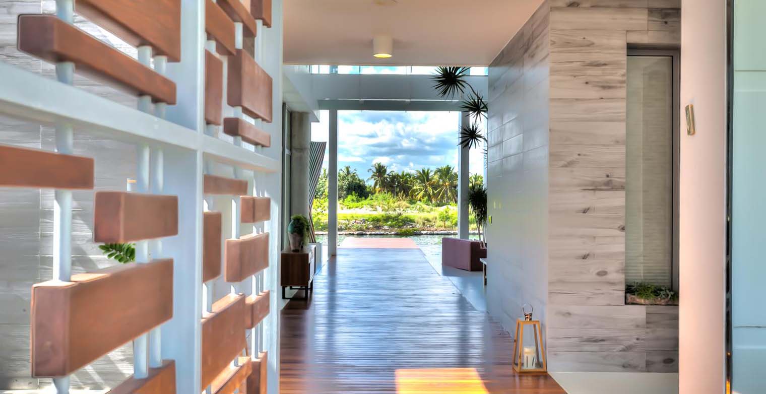 Patrolling and guarding the imponent and cubic shape of this modern enclave, the four palms invite all guests through the main entrance along a large wooden path that guides you to an open concept and wide lake views. At the end of the hall, the air and breeze run freely through the high columns and the hard-wood ceiling. The postcard includes a flashy white spiral staircase, an outdoor living room, cement walls, and the dining area. The infinity pool is escorted by alfresco dining, pergola, and a low relief sitting area.