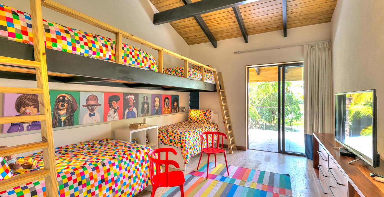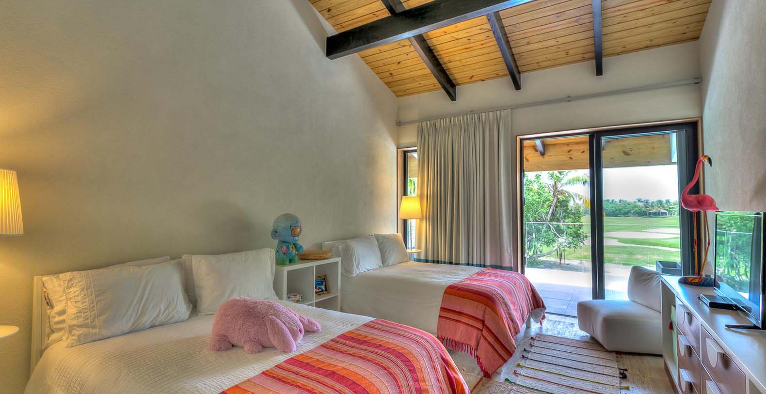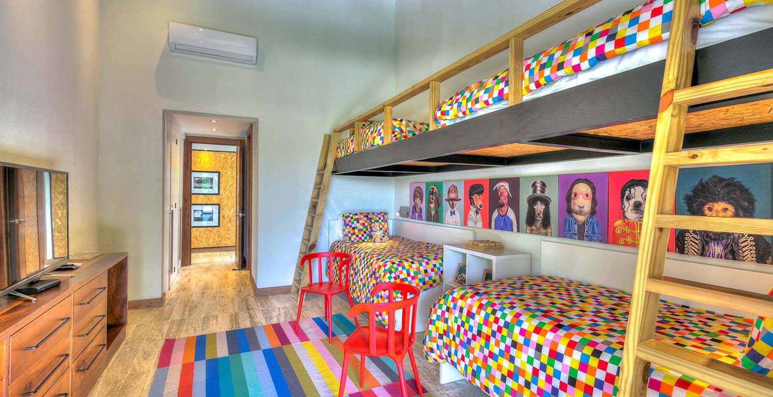 All bedrooms are upstairs and the amazing master bedroom has a king size bed, full bathroom with shower and walk-in closet. As to the second bedroom has also a king size bed, full bathroom with shower and closet. The third bedroom has 2 queen size beds, full bathroom with shower and closet. If you go with kids they will love the forth bedroom which was decorated wisely thinking about making their stay amazing even if they are about to sleep. Four twin beds to make their stay unforgettable, full bathroom with shower and closet.