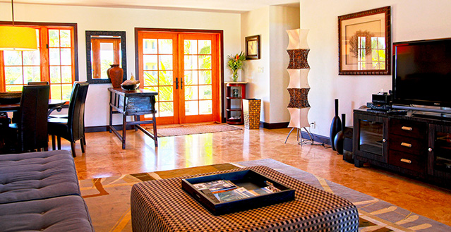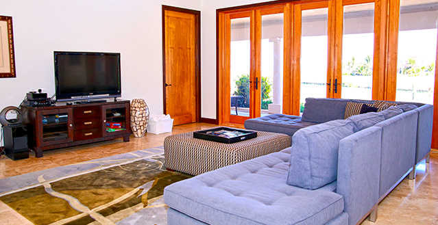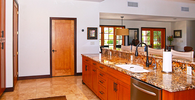 The house offers a blend of modern touches, from the moment you walk in you will feel as if you have arrived. The House opens up to large living area with a wonderful sitting room and views of the pool and water. The feeling is pure luxury from the travertine floors to the soaring ceilings with weaved palm fans set high above. The room is made to be the “Great Room” of the house, giving it a central point for families to spend time together, dine or watch movies.