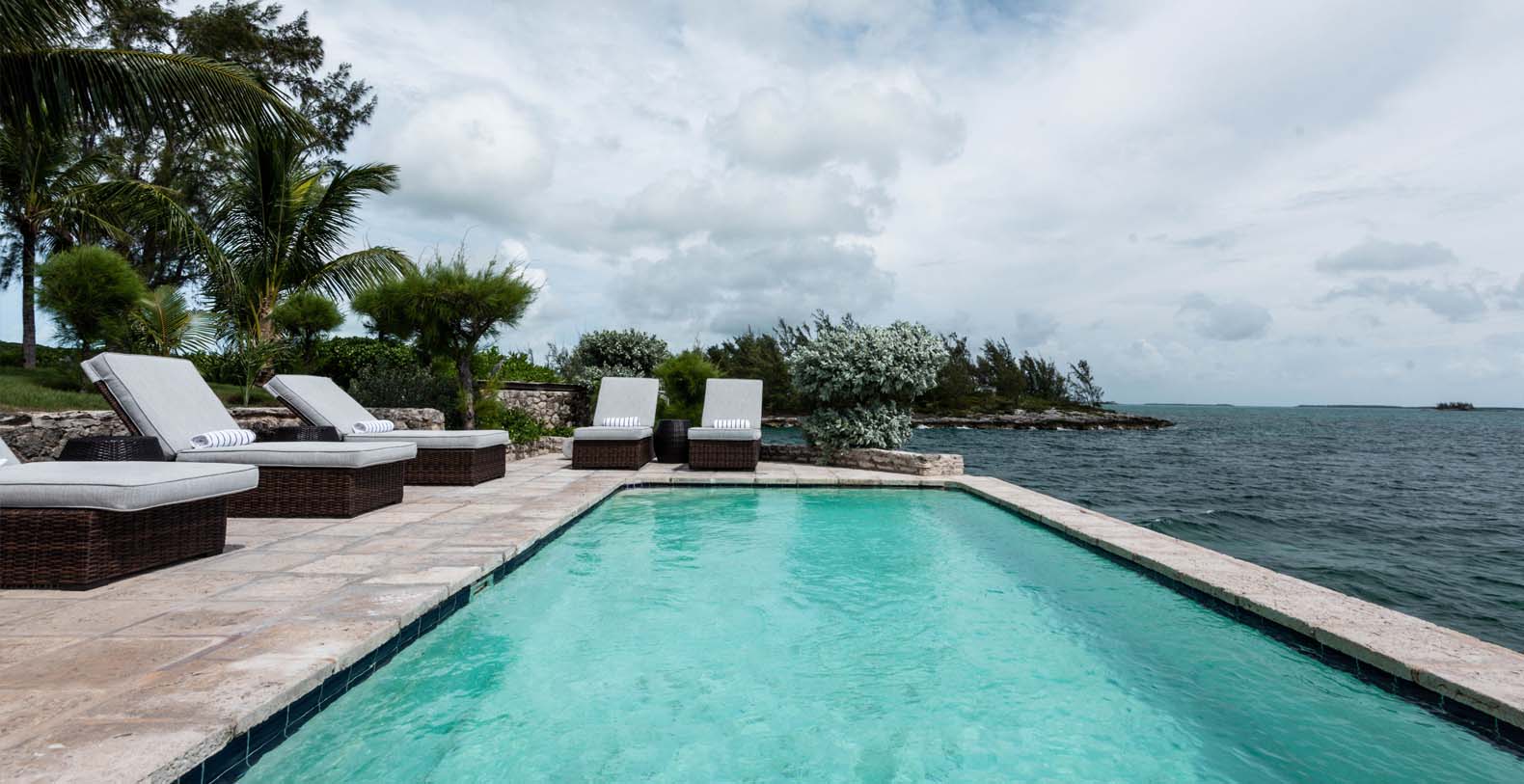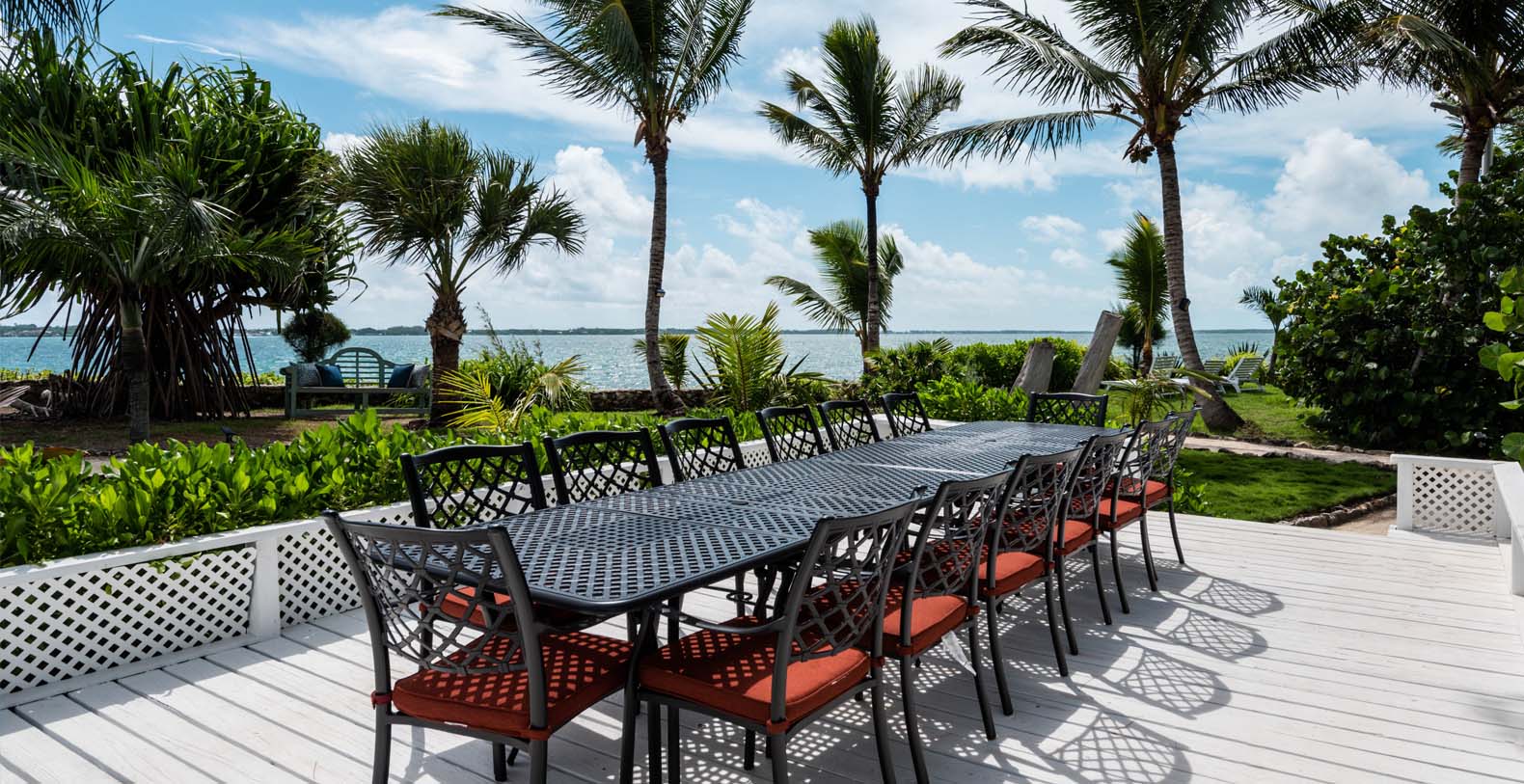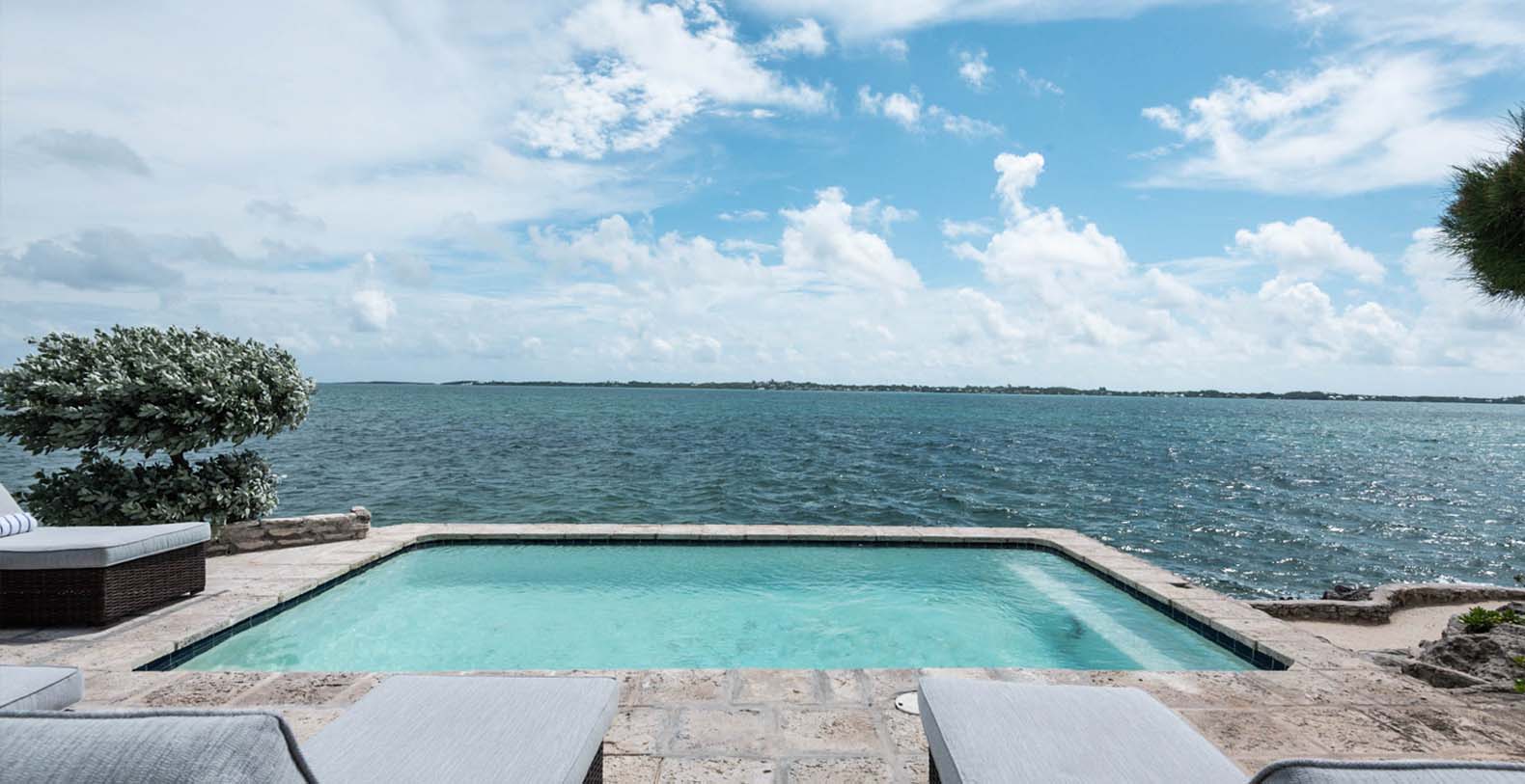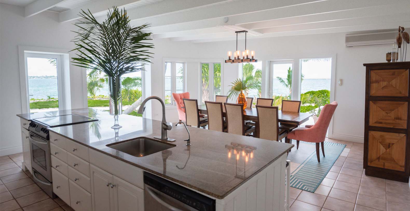 Middle Cay has two homes, and both have WiFi and air-conditioning. The Main House has an open kitchen and dining space with stainless steel appliances, granite countertops, and a dining table that seats 8. Its living room has a flatscreen cable TV and opens to a private patio. Outside, there’s a heated pool and an outdoor shower.