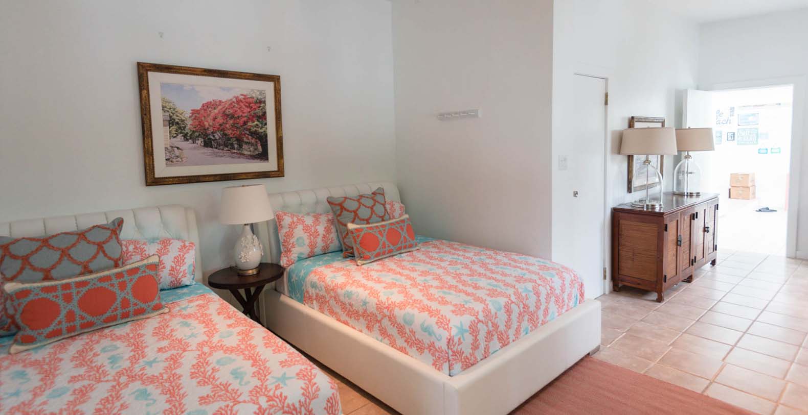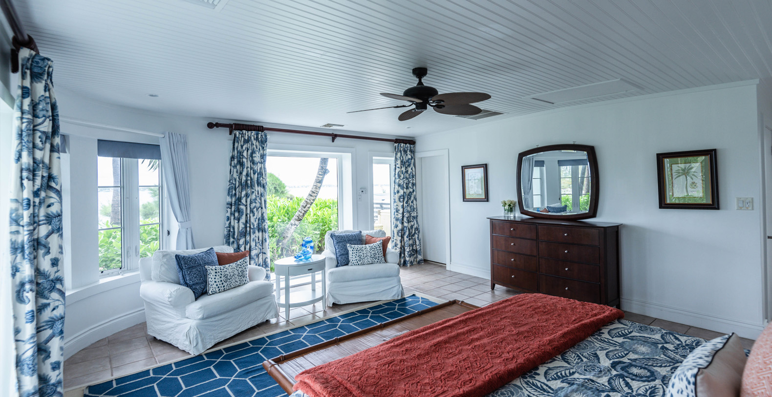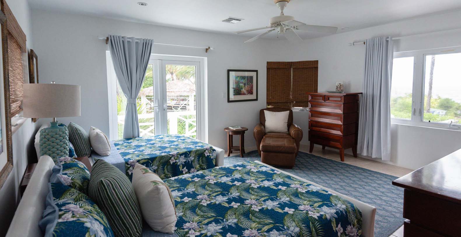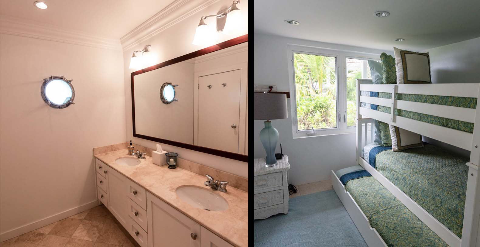 The second suite has two double beds, a window seat, and an ensuite bathroom. The third suite has two twin beds, ocean views, and a hall bath. The fourth suite has a king bed and an ensuite bathroom. In the Cottage, there’s a king suite with exterior access, ocean views, and an ensuite bathroom. The second suite has two double beds, exterior access, and an ensuite bathroom. The third suite is ideal for children, with a twin bunk, trundle bed, and a half bath in the hall.