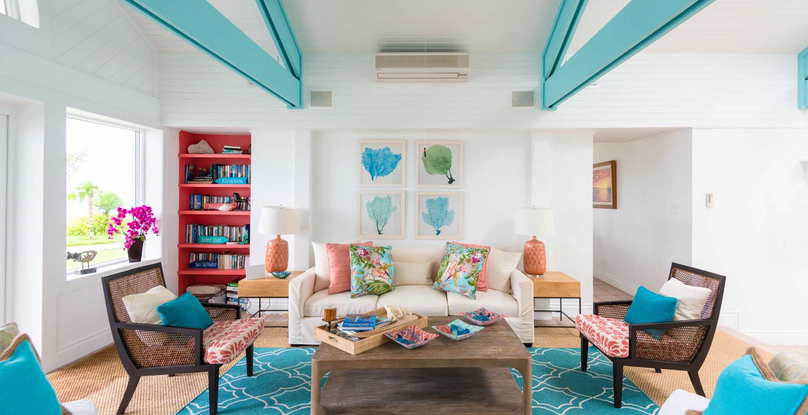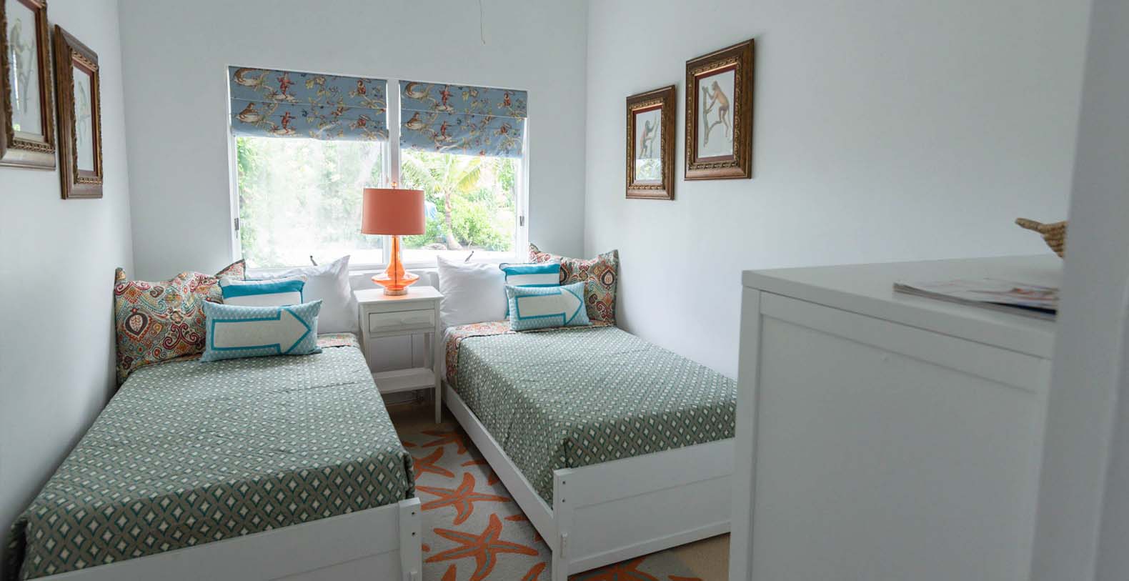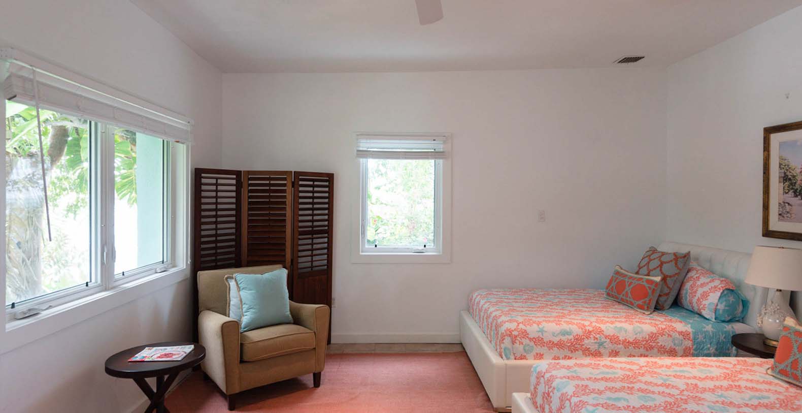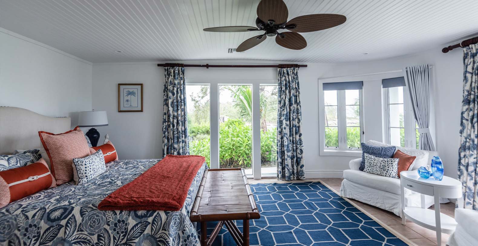 The second suite has two double beds, a window seat, and an ensuite bathroom. The third suite has two twin beds, ocean views, and a hall bath. The fourth suite has a king bed and an ensuite bathroom. In the Cottage, there’s a king suite with exterior access, ocean views, and an ensuite bathroom. The second suite has two double beds, exterior access, and an ensuite bathroom. The third suite is ideal for children, with a twin bunk, trundle bed, and a half bath in the hall.
