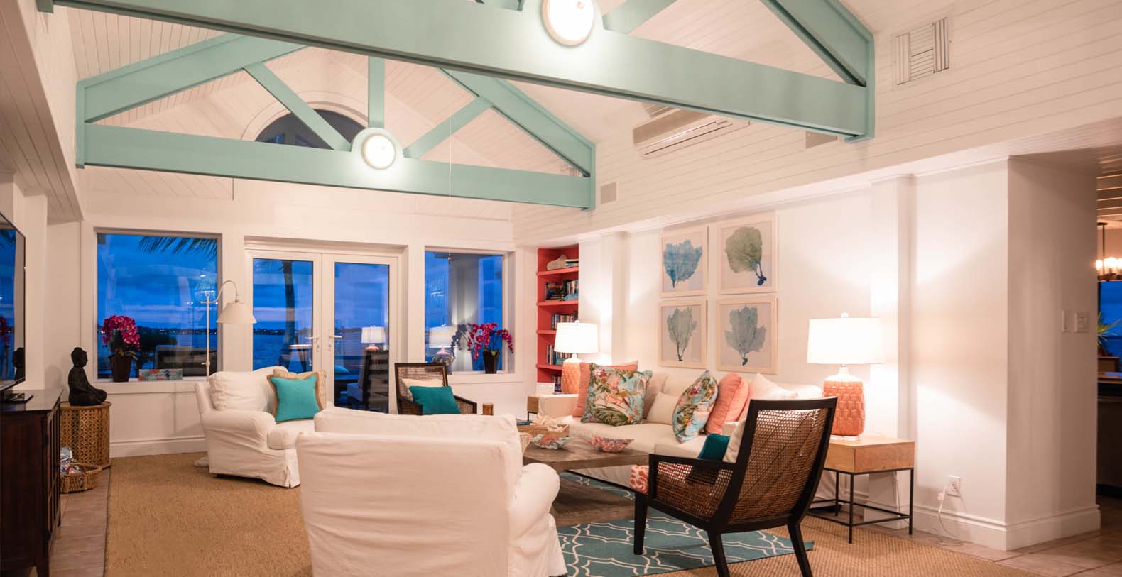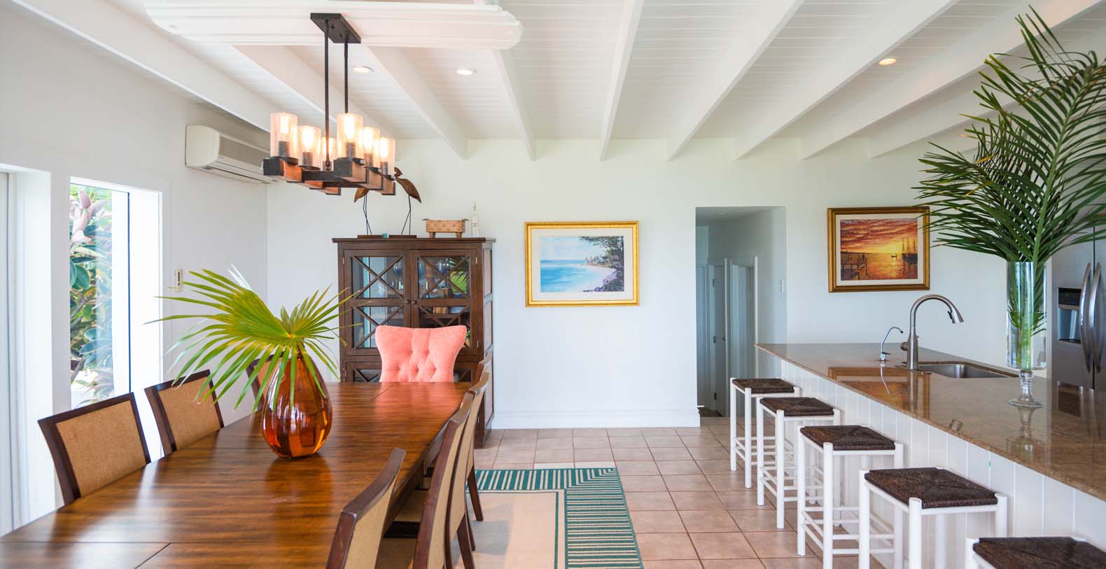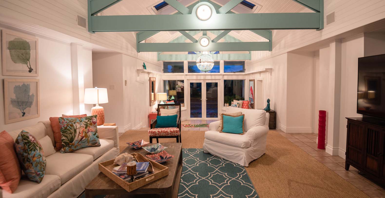 In the Cottage, there’s a common area with beautiful, exposed wooden beams and tile floors. The living room has plush furnishings and a flatscreen cable TV, and there’s dining at the bar and main table. It opens to the patio and has three walls of windows that reveal ocean views. The kitchen has stainless steel appliances, a coffeemaker, and a mixer. The Main House has four bedrooms and the Cottage has three bedrooms. In the Main House, there’s a spacious master suite with a king bed, three walls of ocean views, a private patio, a lounge, and an ensuite bathroom.