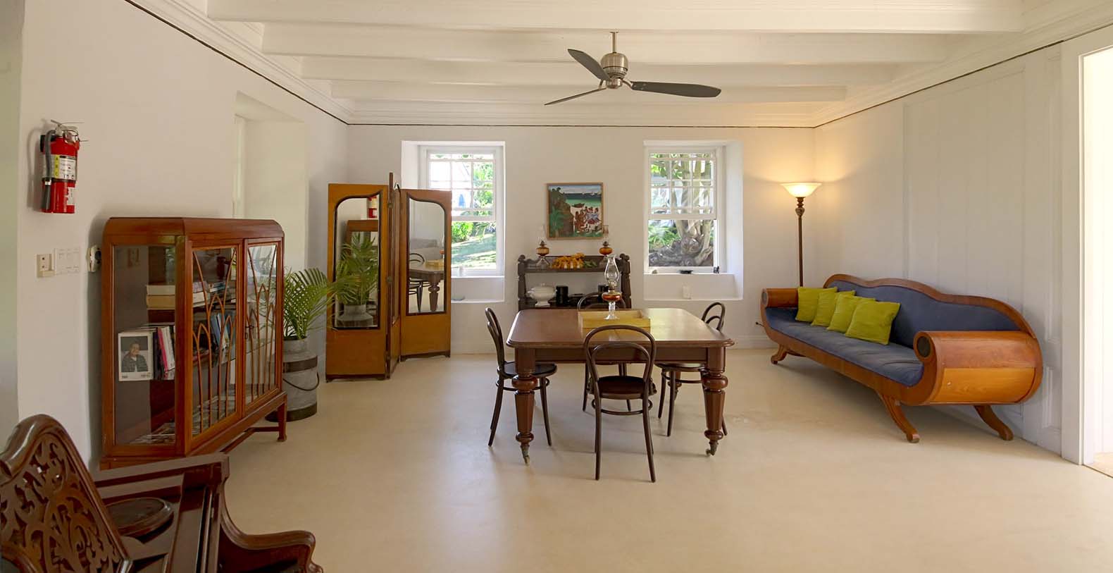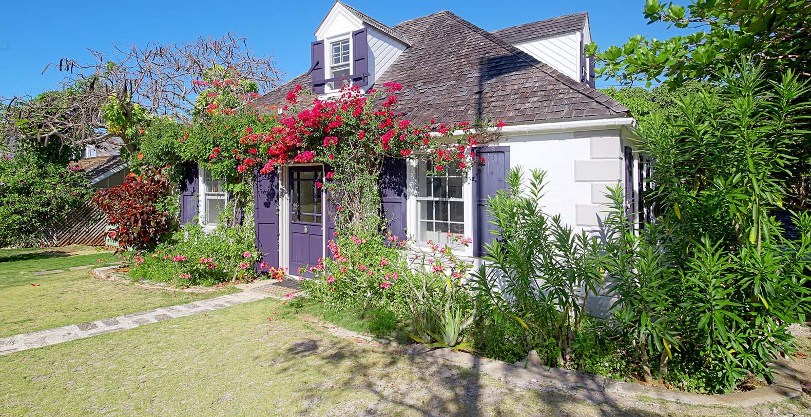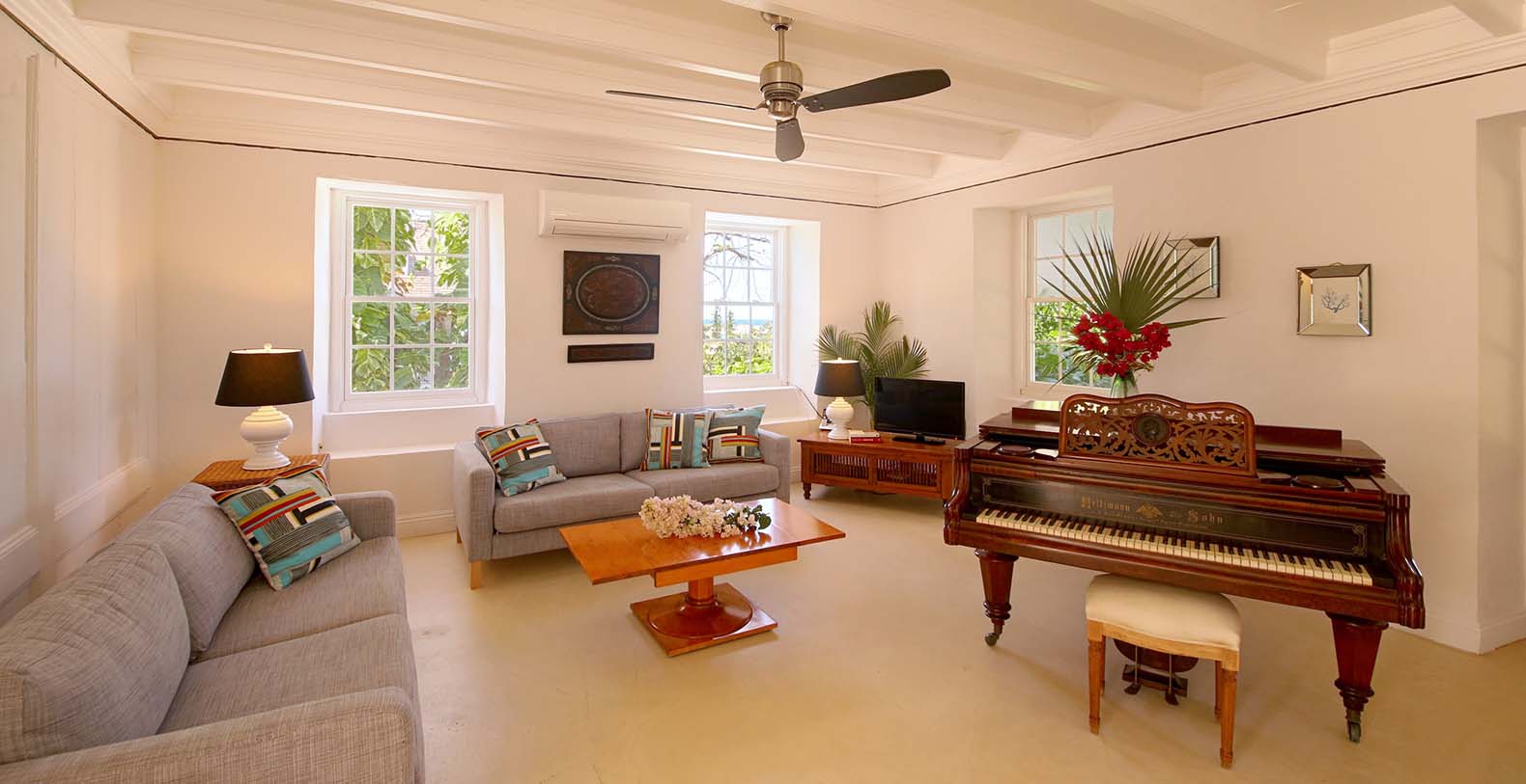This elegant cottage dates to the mid 1800s, and over time has been lovingly restored. Toad Hall is surrounded by a lush garden which is home to many fruit trees, bougainvillea, hibiscus, aloe and coconut palms. Toad Hall features a spacious living room with elegant contemporary and antique furnishings, including a grand piano. The dining area has seating for four at an antique mahogany table. There is also a powder room on this level.