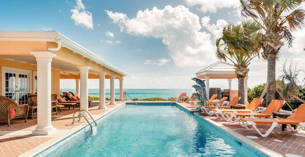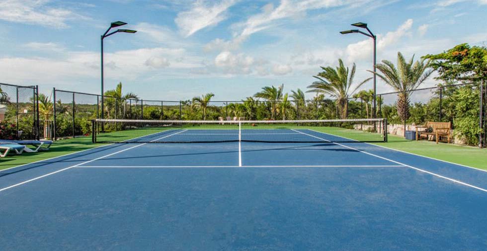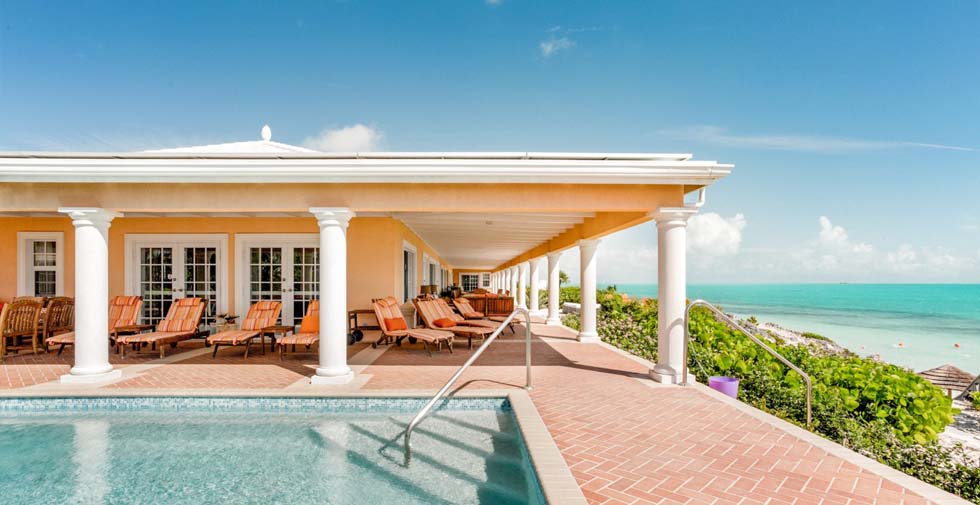 Three Dolphins Villa in the Turks & Caicos is a magnificent beachfront villa located on quiet Long Bay Beach, in Providenciales, Turks & Caicos, Caribbean, accommodates up to 18-22, with 9 Bedrooms, 8 Bathrooms (8 En suite) & Jacuzzi. Marble and granite floors & countertops throughout. Beachfront villa with 42' pool and new private lit tennis court with ocean view. Hot tub overlooking Long Bay beach and ocean. Three Dolphins Villa is wheelchair accessible