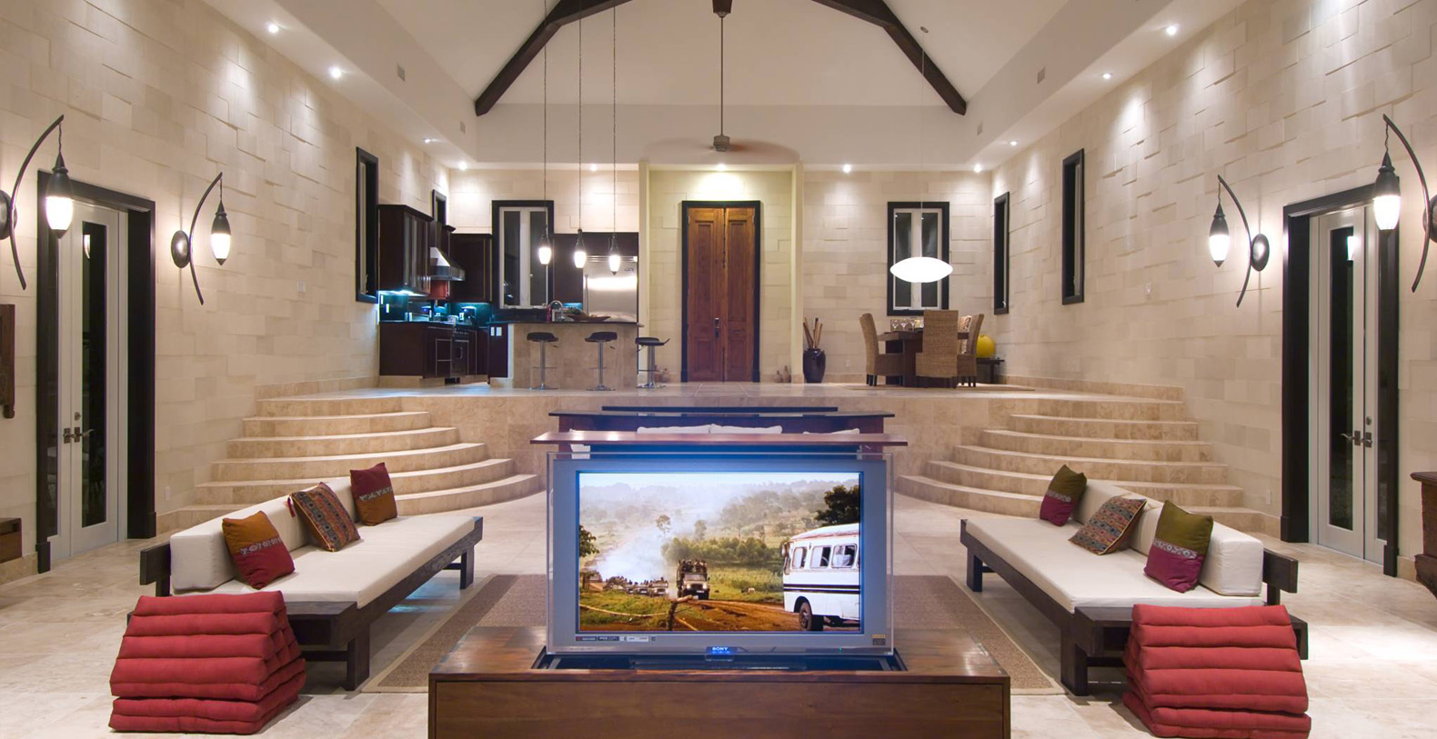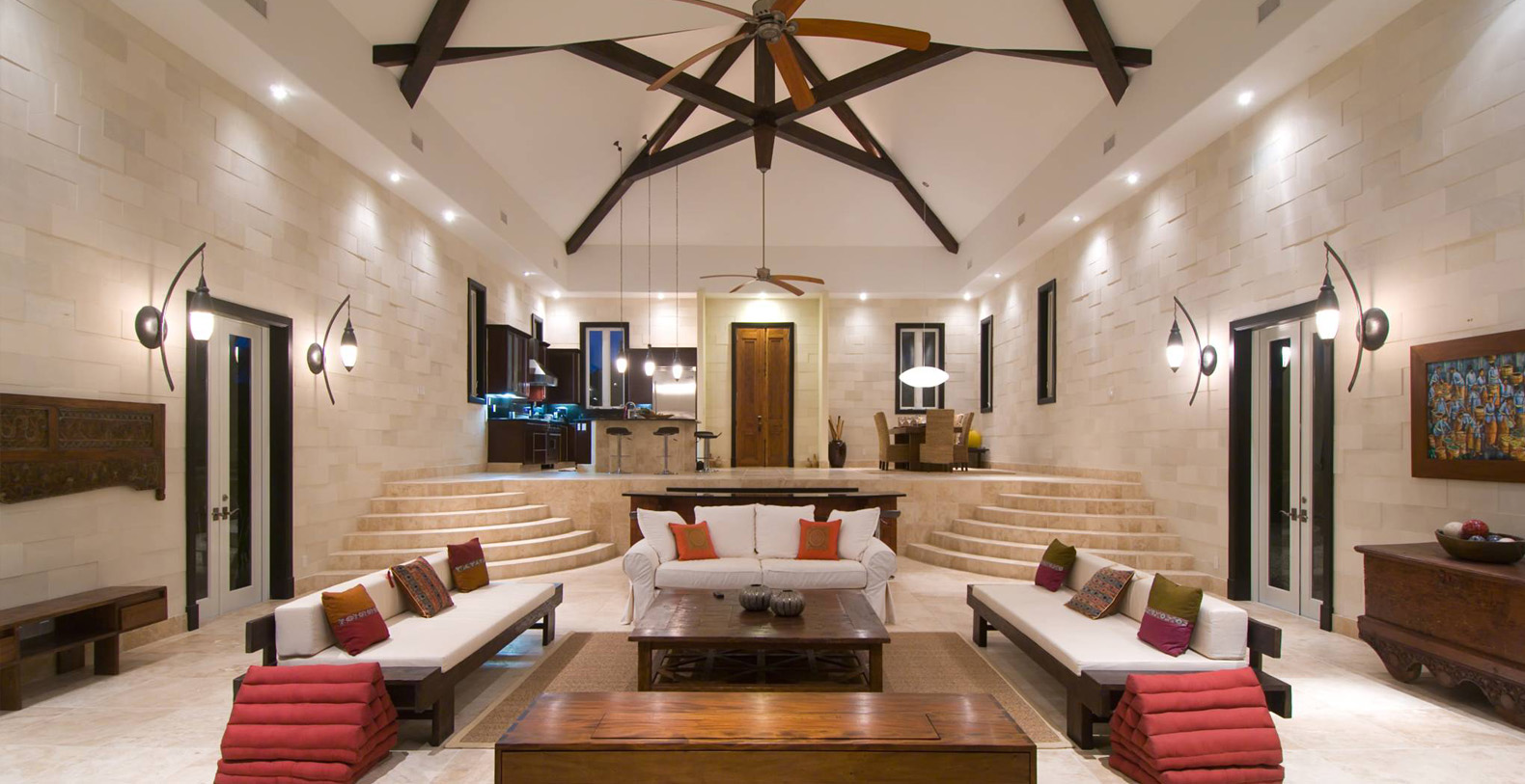 4,200 square feet of interior space begins with a greatroom of vast proportions and bold design. Travertine marble flooring, towering 30' vaulted ceilings of cedar beams, and walls of intricately patterned Asian pearl-stone tiles.