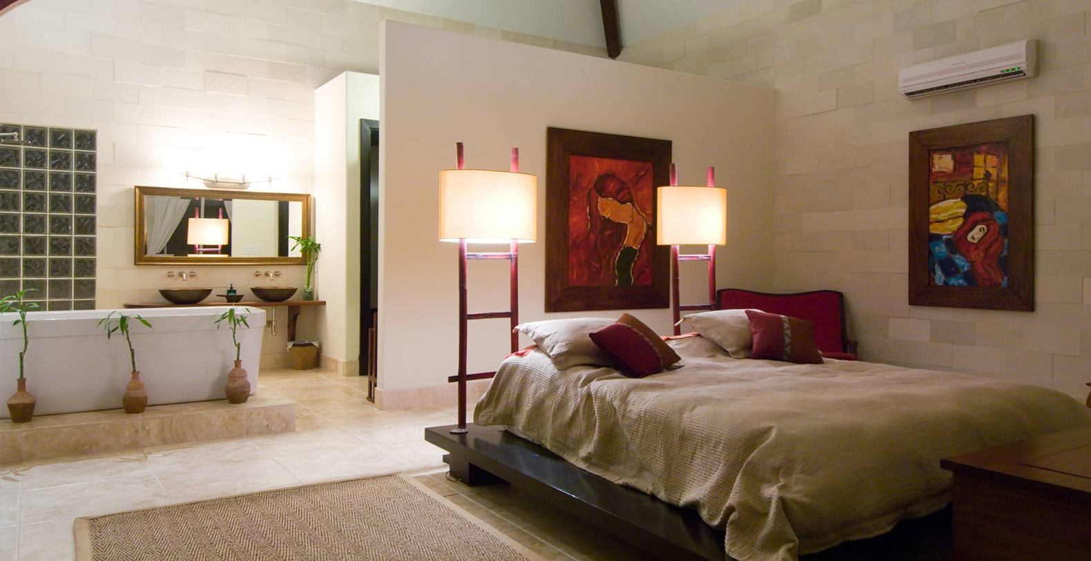 The master bedroom wing adjoins the angular pool and comprises a 35' x 39' suite with 90 degree glass doors looking out to sea, from which one steps directly into the pool. Merged with the suite is a raised bathtub featuring overhead waterfall showerhead, next to a separate shower alcove. Double vanity, vessel copper sinks, separate WC, walk-in closet lined with coconut wood walls, and custom mahogany shelving, complete the arrangement. The suite has its own private courtyard terrace with carved Indonesian day-bed to further indulge in the sensual coastal surroundings and southeastern breezes.