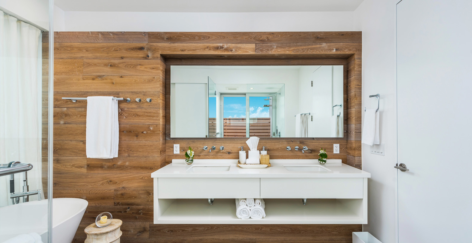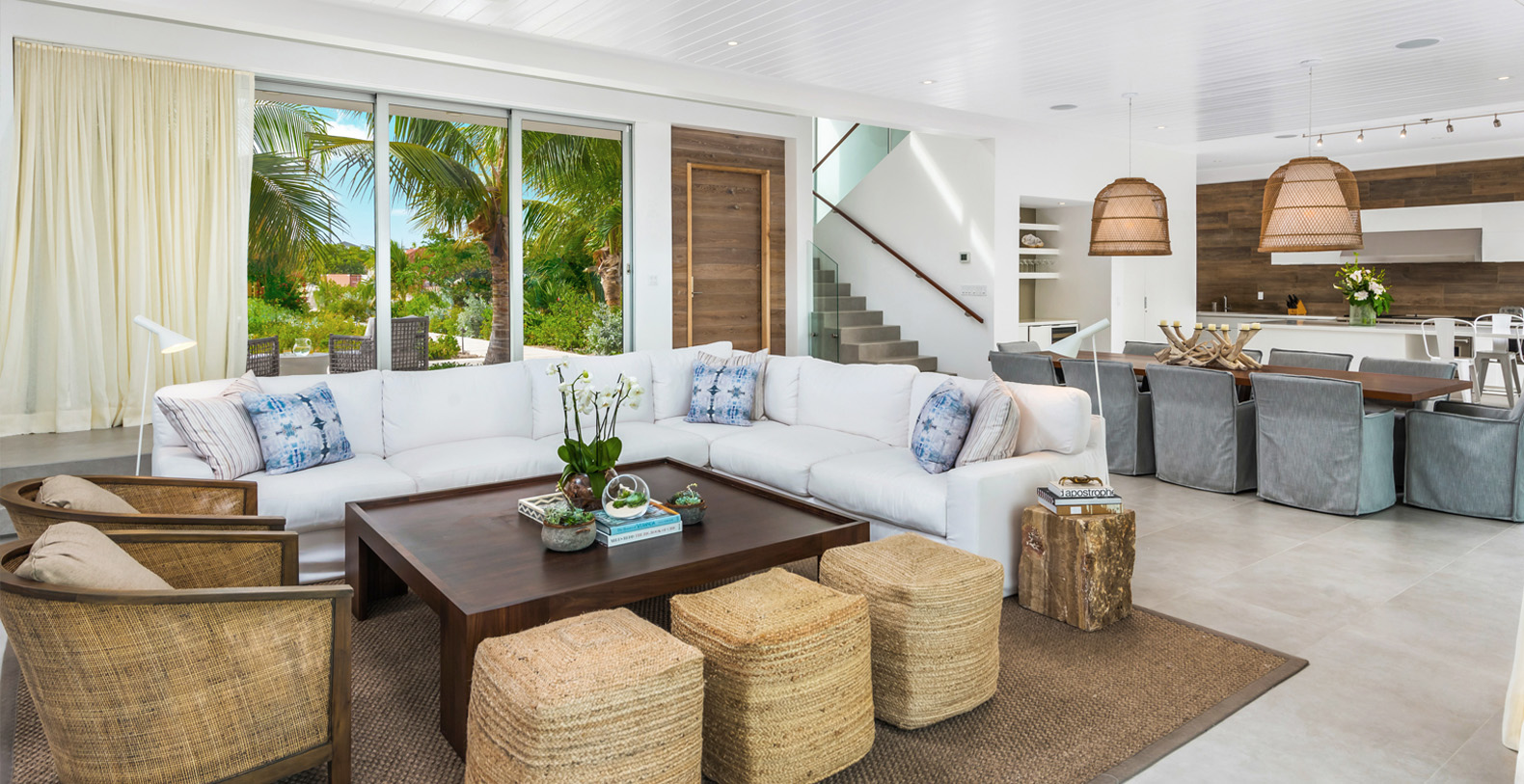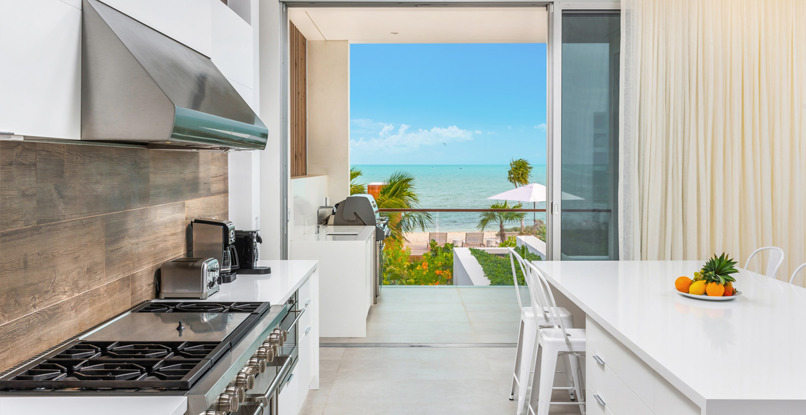 Beach Enclave’s signature design is present throughout this 7,000+ sq ft 5 bedroom villa, including a seamless philosophy of combining indoor and outdoor living, with generous, concealable sliding glass doors, expansive pool and decks, outdoor barbeque, bar and dining area, a beach lounge with shower, open kitchen and outdoor showers. Available with 5 bedrooms in the main villa plus one suite in a separate garden cottage.