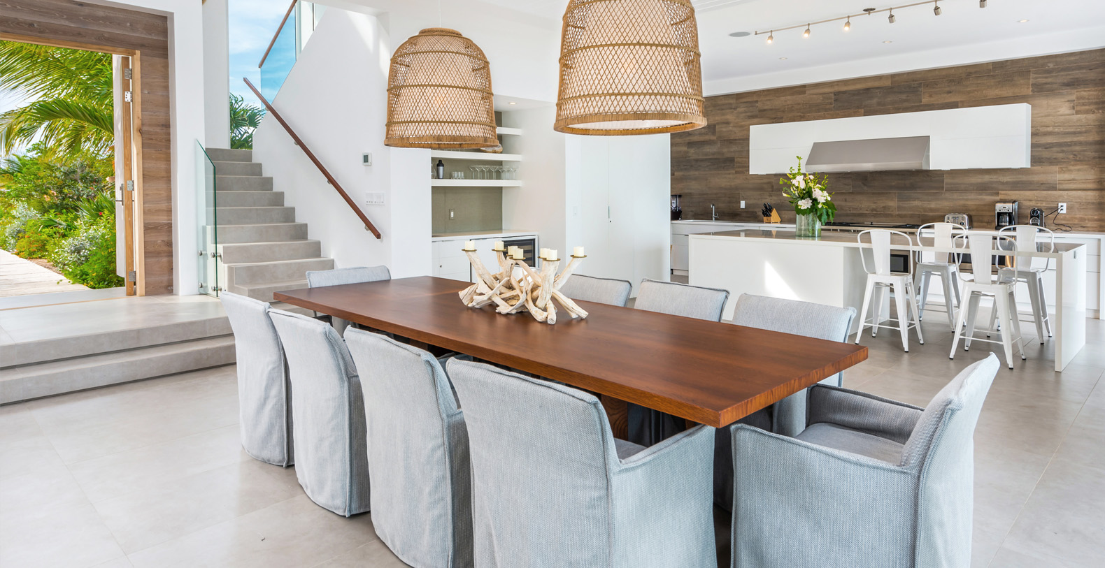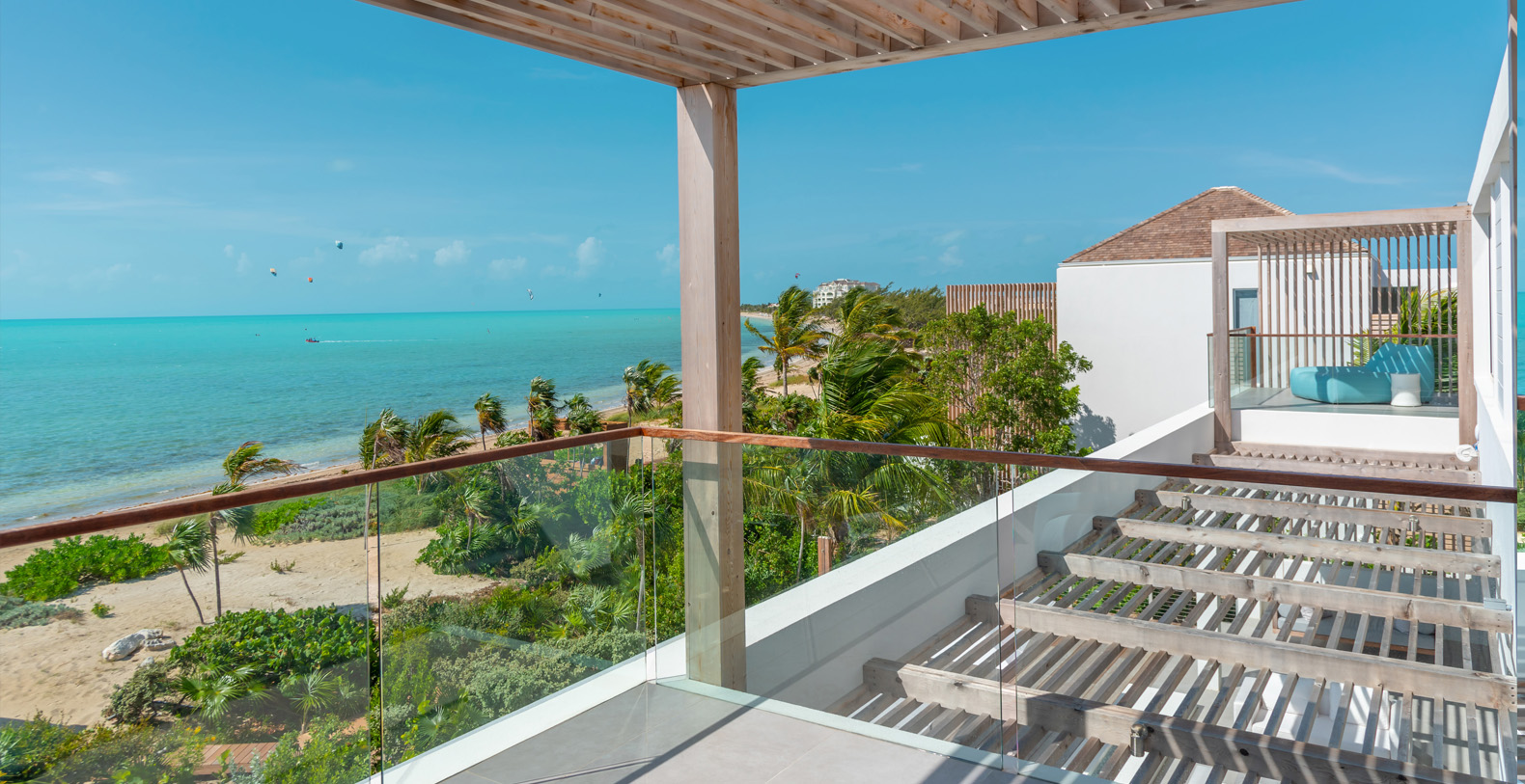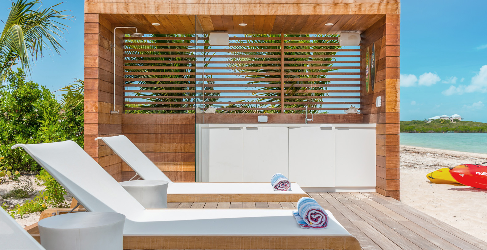 Set on nearly one acre each, these villas have private access to the beach and a dedicated beach deck unique to each home, featuring a summer kitchen, fire pit, outdoor shower, chaise lounges and umbrellas.