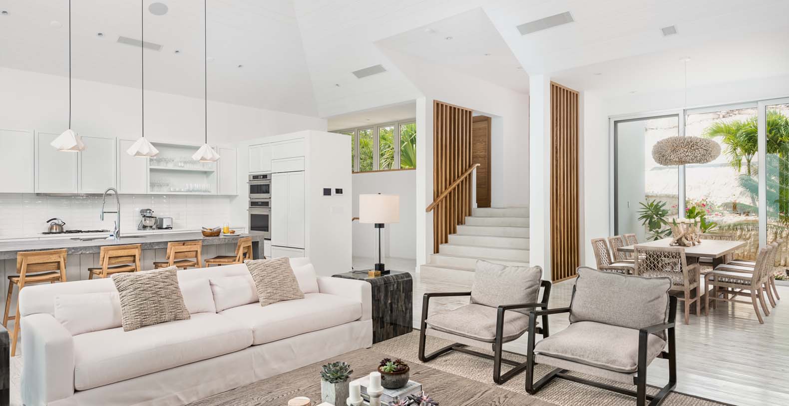 This 3,200 square foot home offers guests four frontal ocean view suites with large ensuite bathrooms all centered around the home's open concept 'Great Room'. The Great Room has a large, well equipped, contemporary kitchen, complete with a full chef's selection of appliances and cooking utensils. Located in the Great Room is also a large interior dining room that accommodates eight comfortably as well as a spacious living room with a large 65" flat screen television. The interior/exterior zoned surround sound system is powered by Sonos and can wirelessly be controlled by phone or tablet by simply downloading an app.