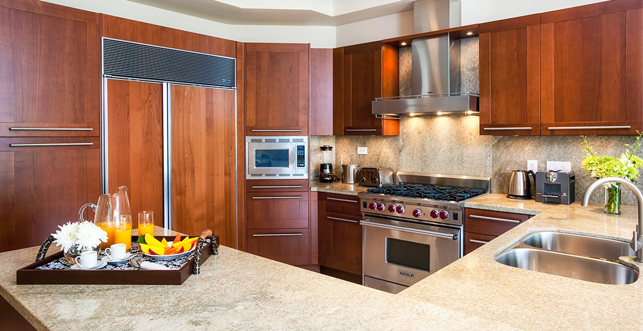 The interiors feature high vaulted ceilings that offer that quintessential Caribbean atmosphere. Furnishings are modern and plush. The open plan dining, kitchen and living area offers an easy and breezy feeling. The kitchen includes a center island breakfast bar for ultimate convenience. The villa also includes a home entertainment system, an office space and Wi-Fi access.