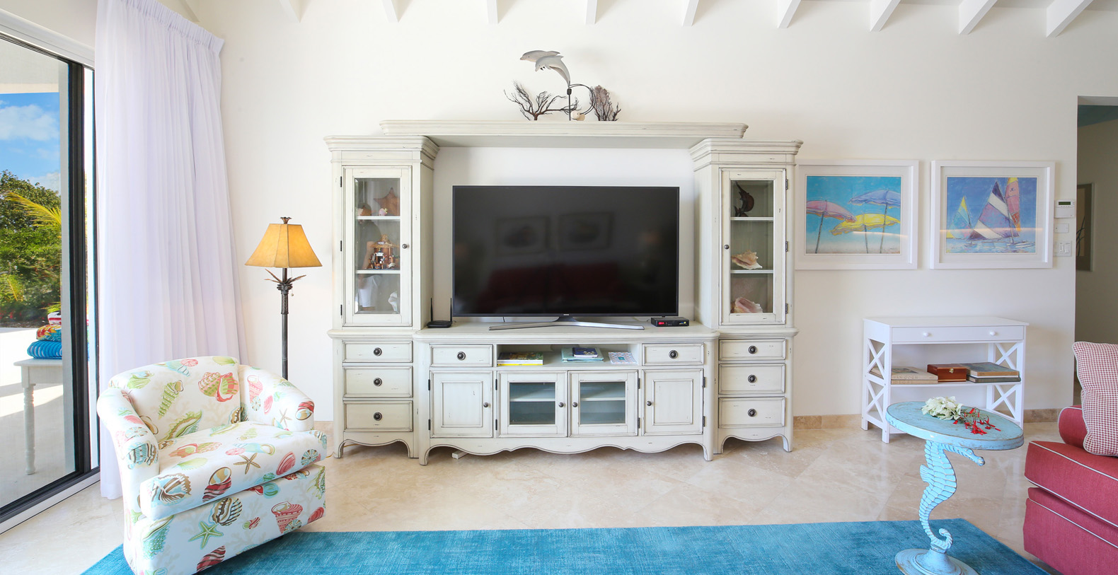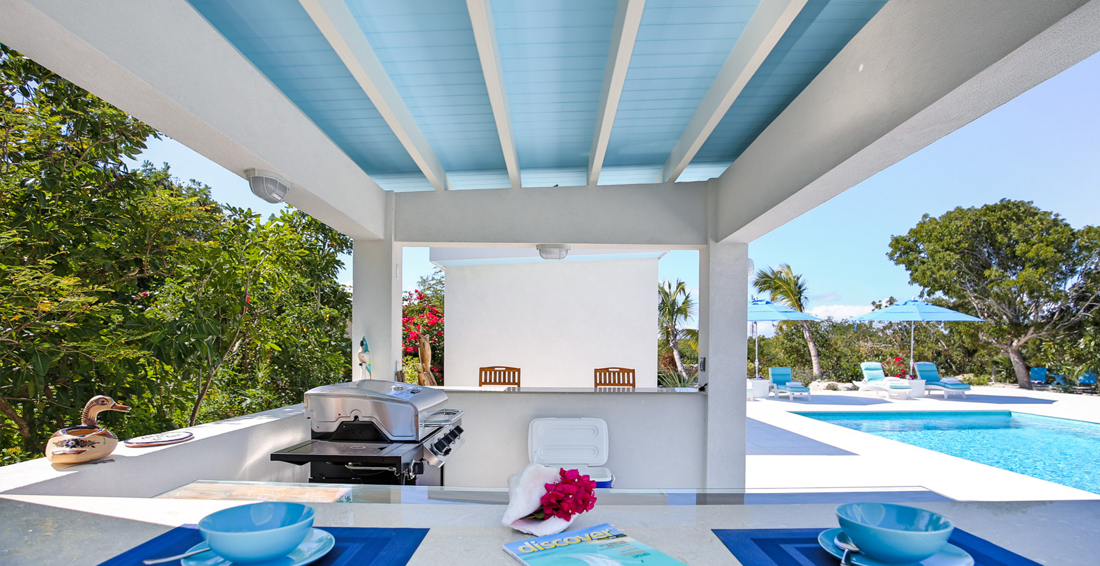 You’ll love getting creative with local seafood and high-end appliances. Interior living spaces feature a color palette, reflecting the tropical brilliance of Turks and Caicos. The open concept floor plan integrates seamlessly from indoor to outdoor living courtesy of sliding glass hurricane windows. Relax in the living room’s cozy turquoise lounge set or feast at an elegant dining table that seats 6. The fully-equipped kitchen is a chef’s dream.