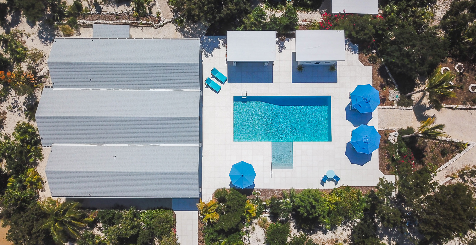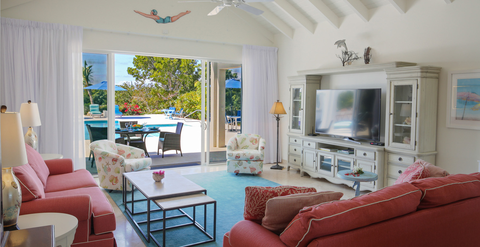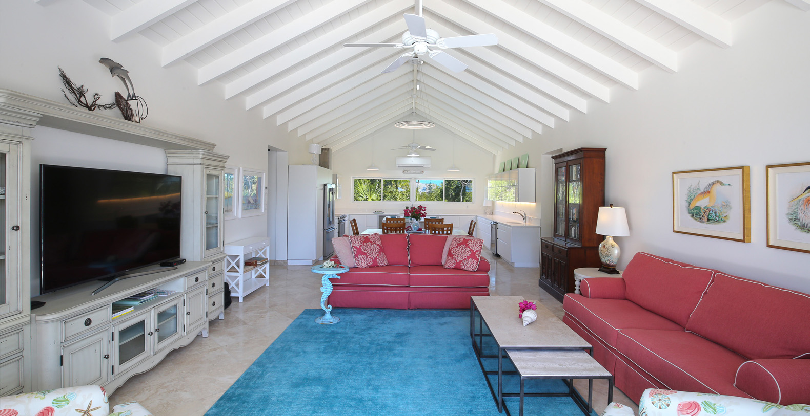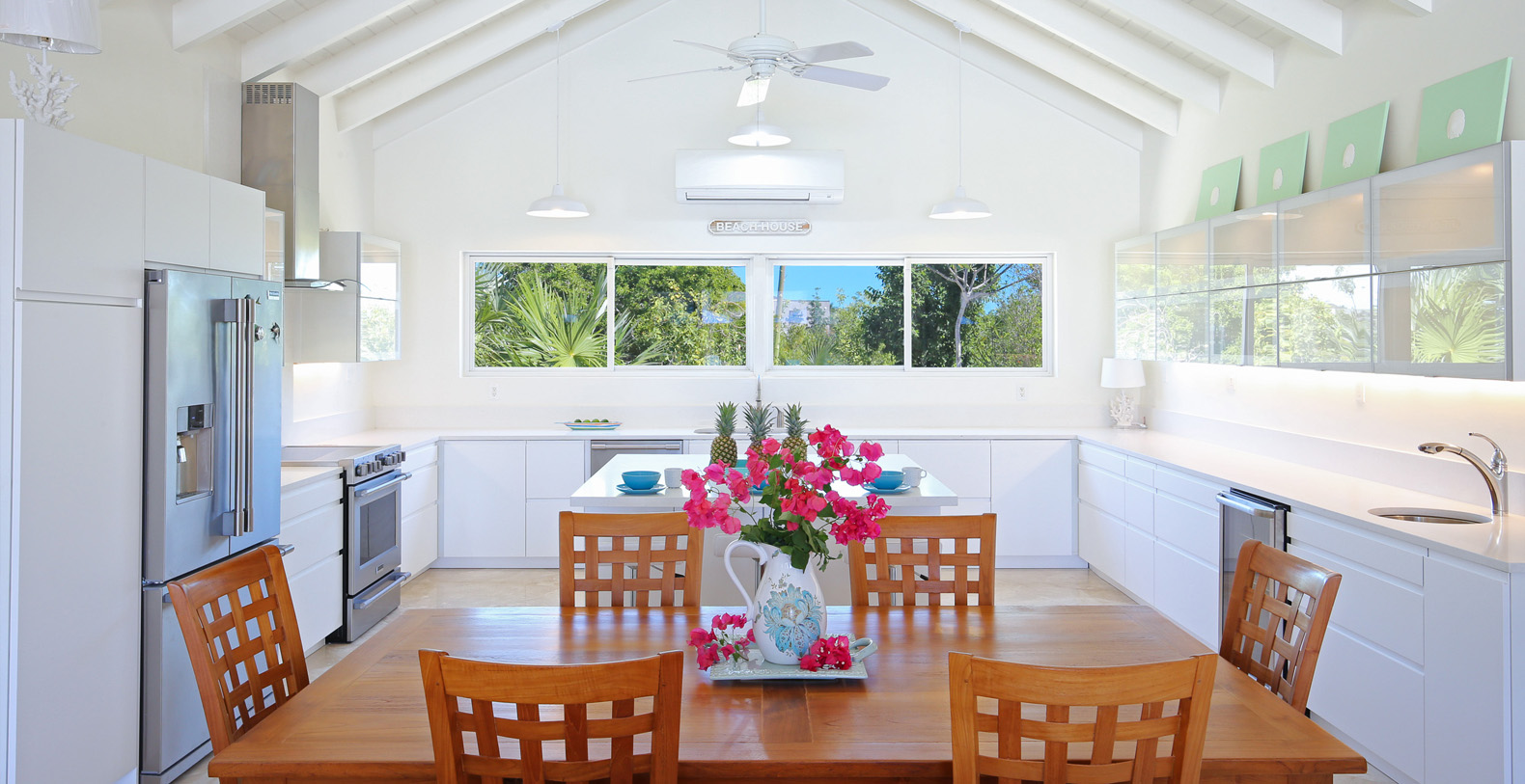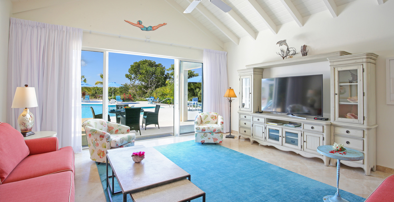 Interior living spaces feature a color palette, reflecting the tropical brilliance of Turks and Caicos. The open concept floor plan integrates seamlessly from indoor to outdoor living courtesy of sliding glass hurricane windows. Relax in the living room’s cozy turquoise lounge set or feast at an elegant dining table that seats 8. The fully-equipped kitchen is a chef’s dream.