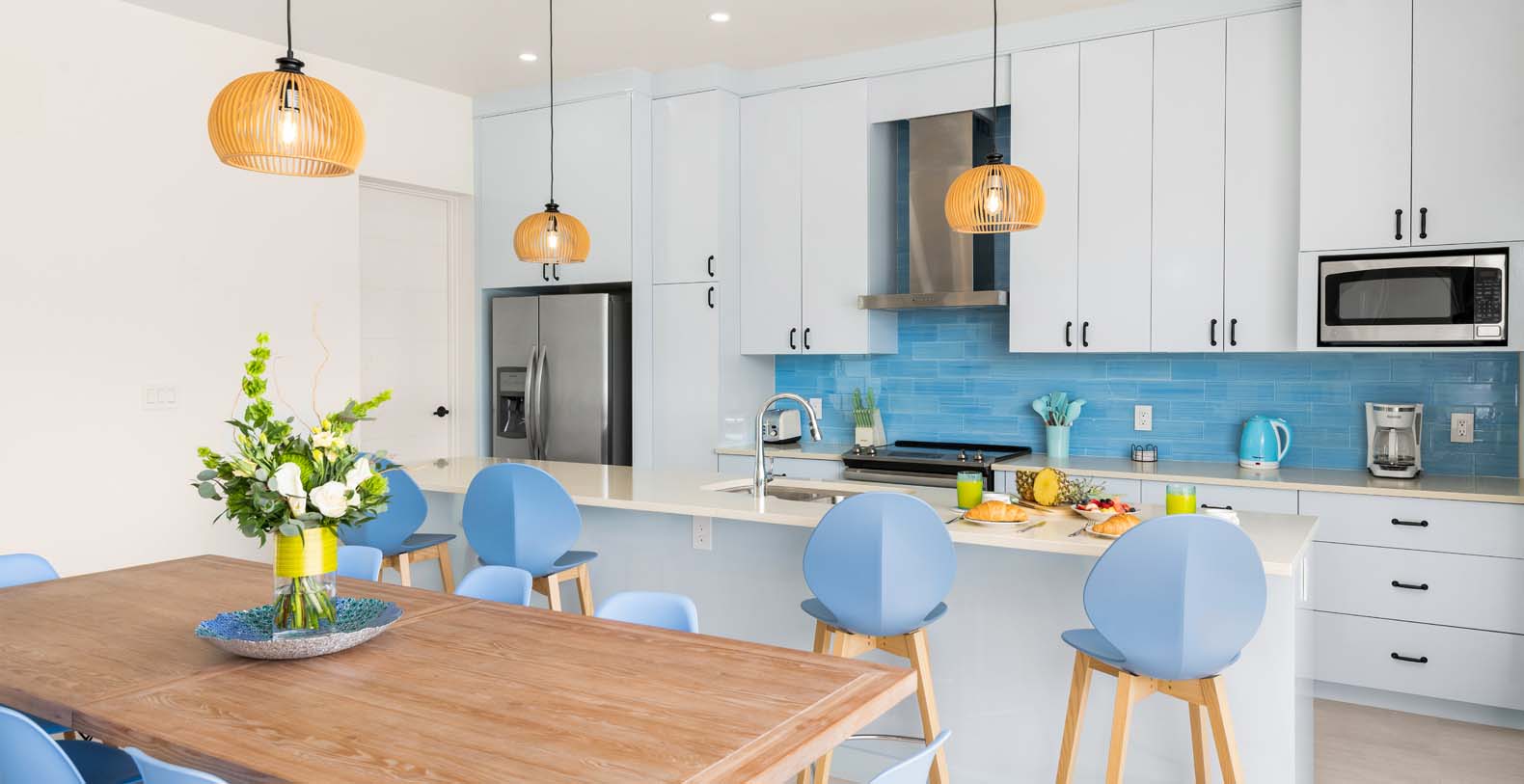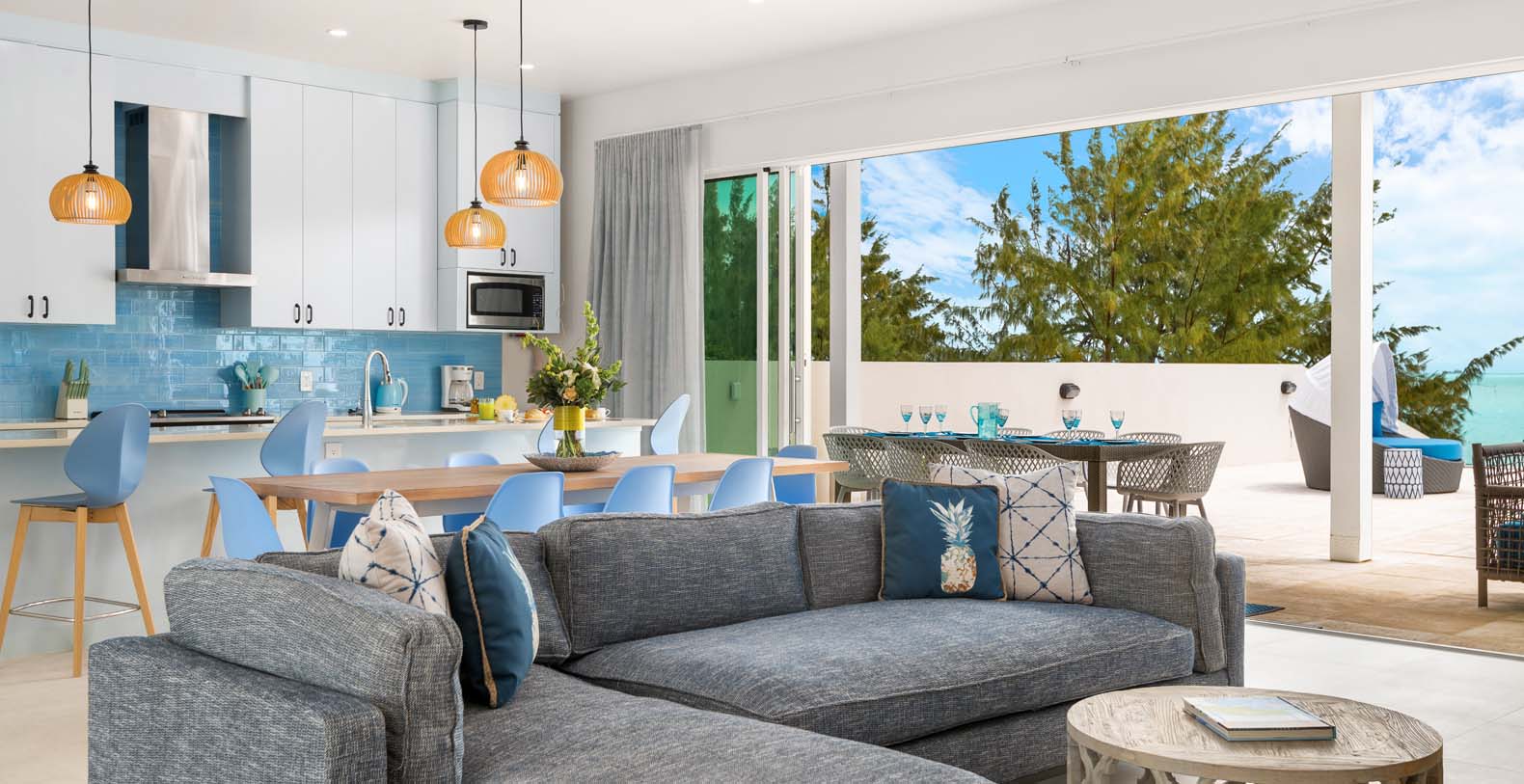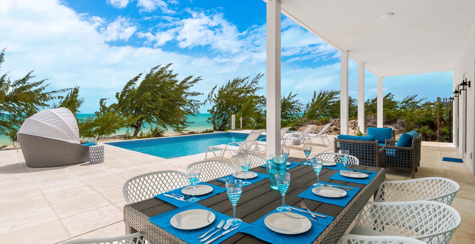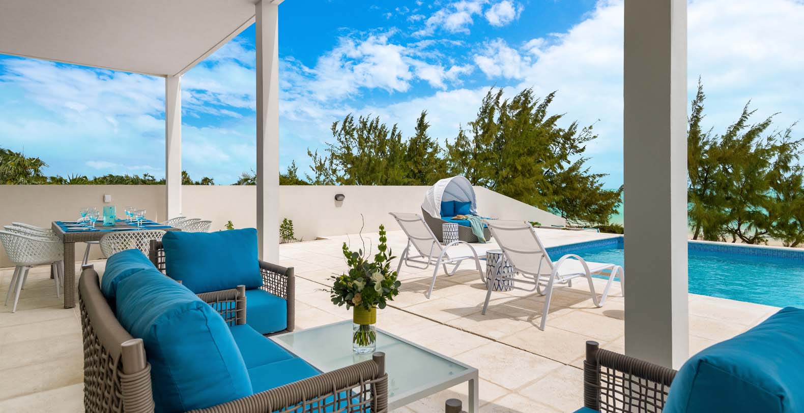 Hura Sea Villas Turks & Caicos newest luxury villas, with a beautiful Caribbean Feel and modern state of the art facility. Built for those looking to experience the sights and sounds of the Caribbean all while enjoying time with their friends and family. This 6 bedroom home features a main house with 1 King Suite and 3 Queen suites and a Guest house with 2 Queen Suites. It's a great place to stay when you want to invite friends or singles to join you but they would like their privacy. It makes for an easy "friends or family" vacation.