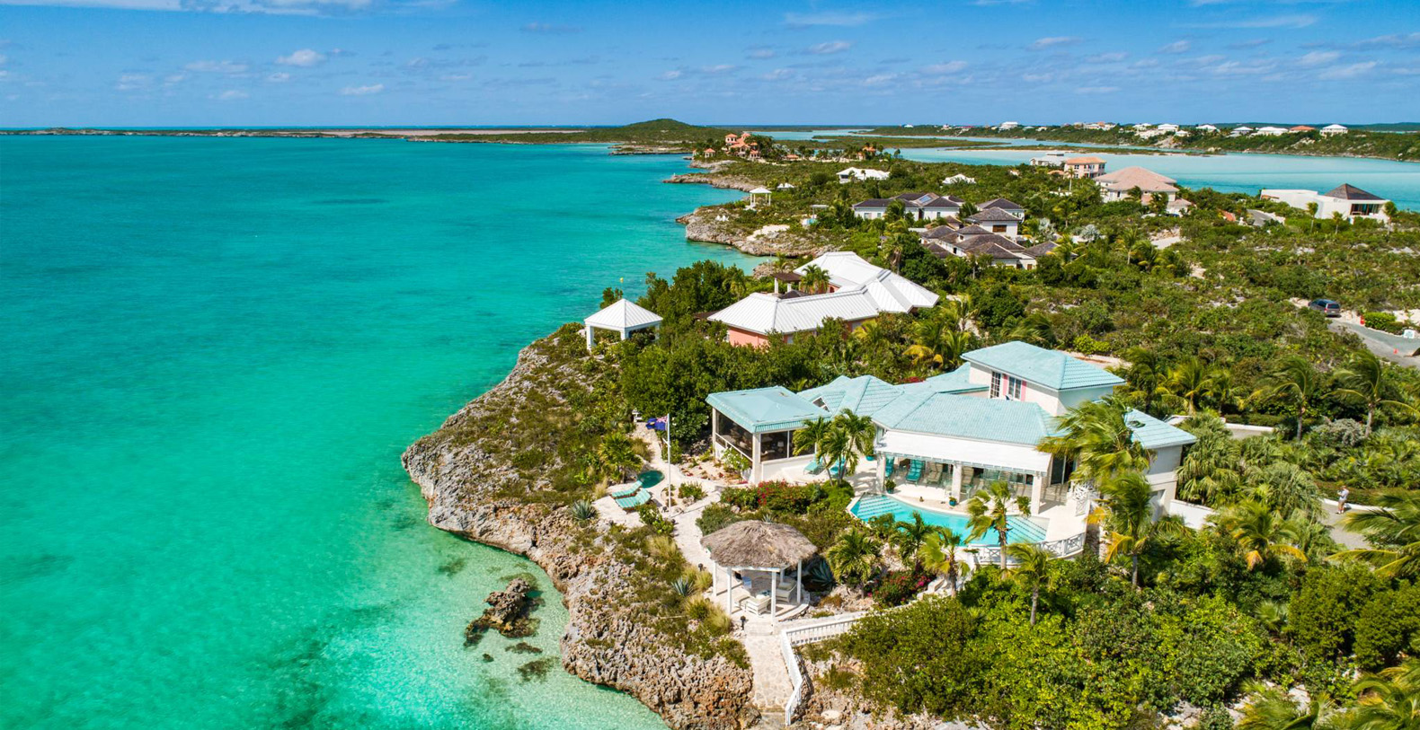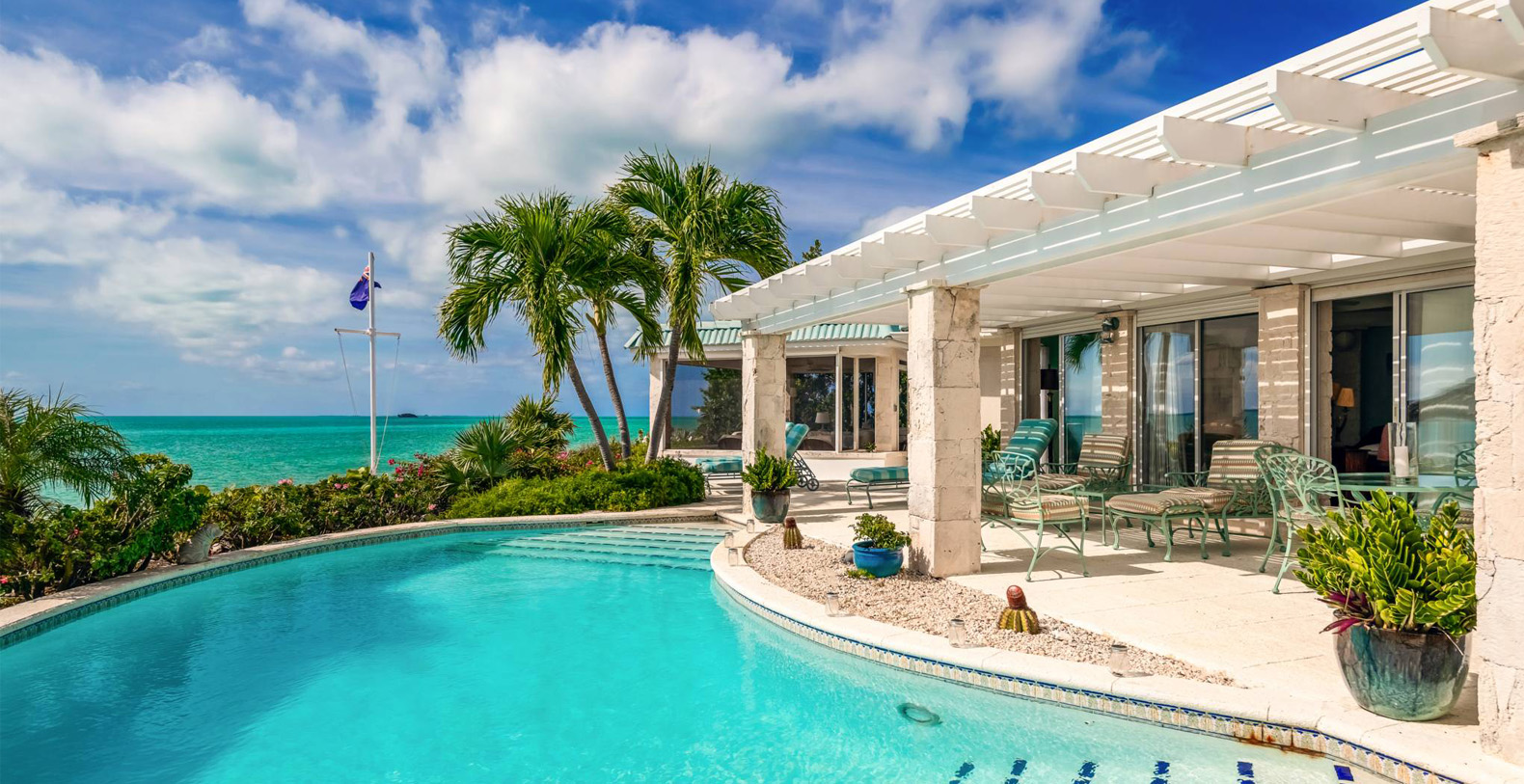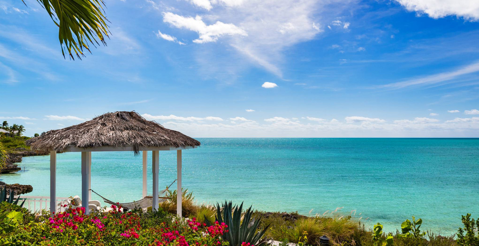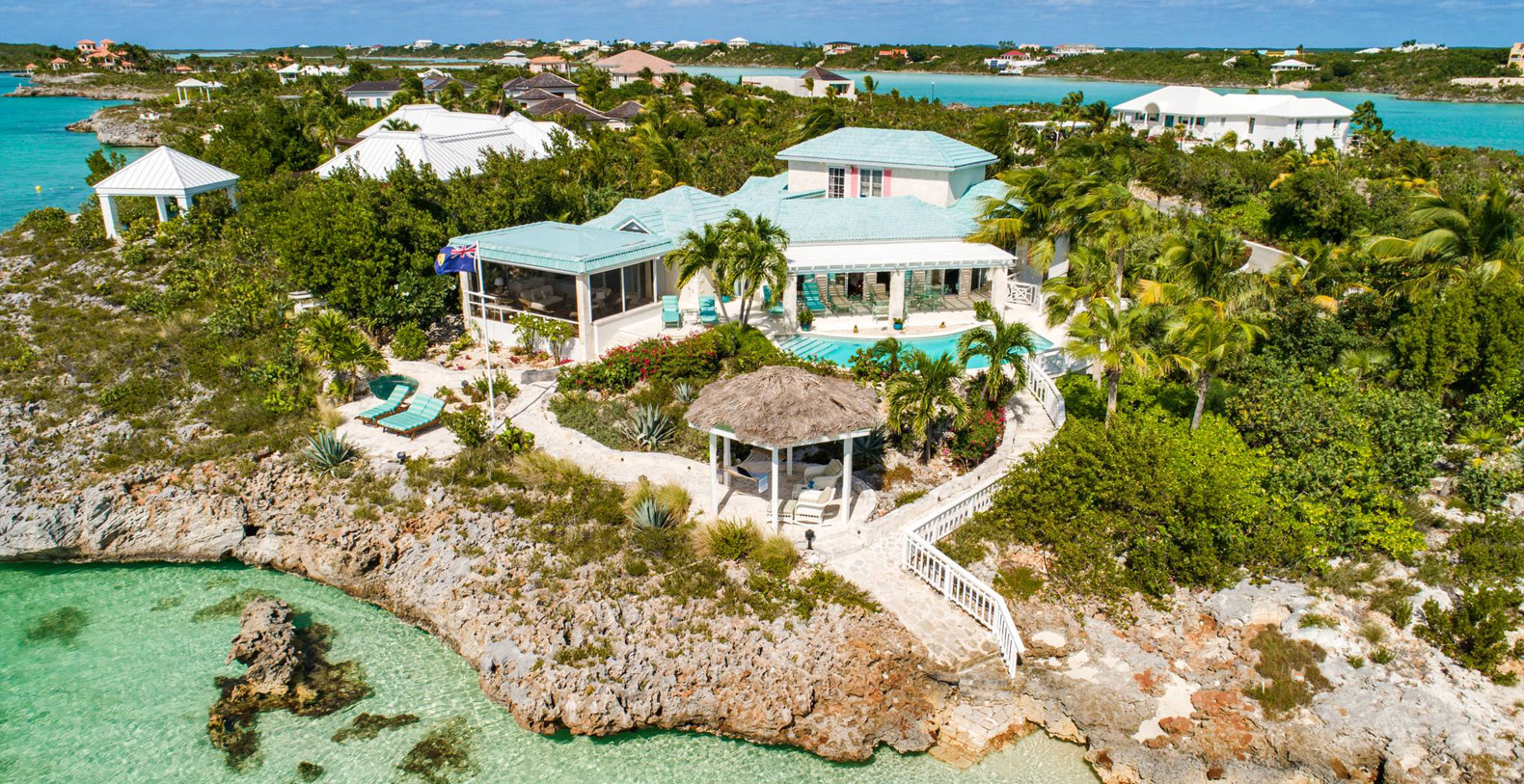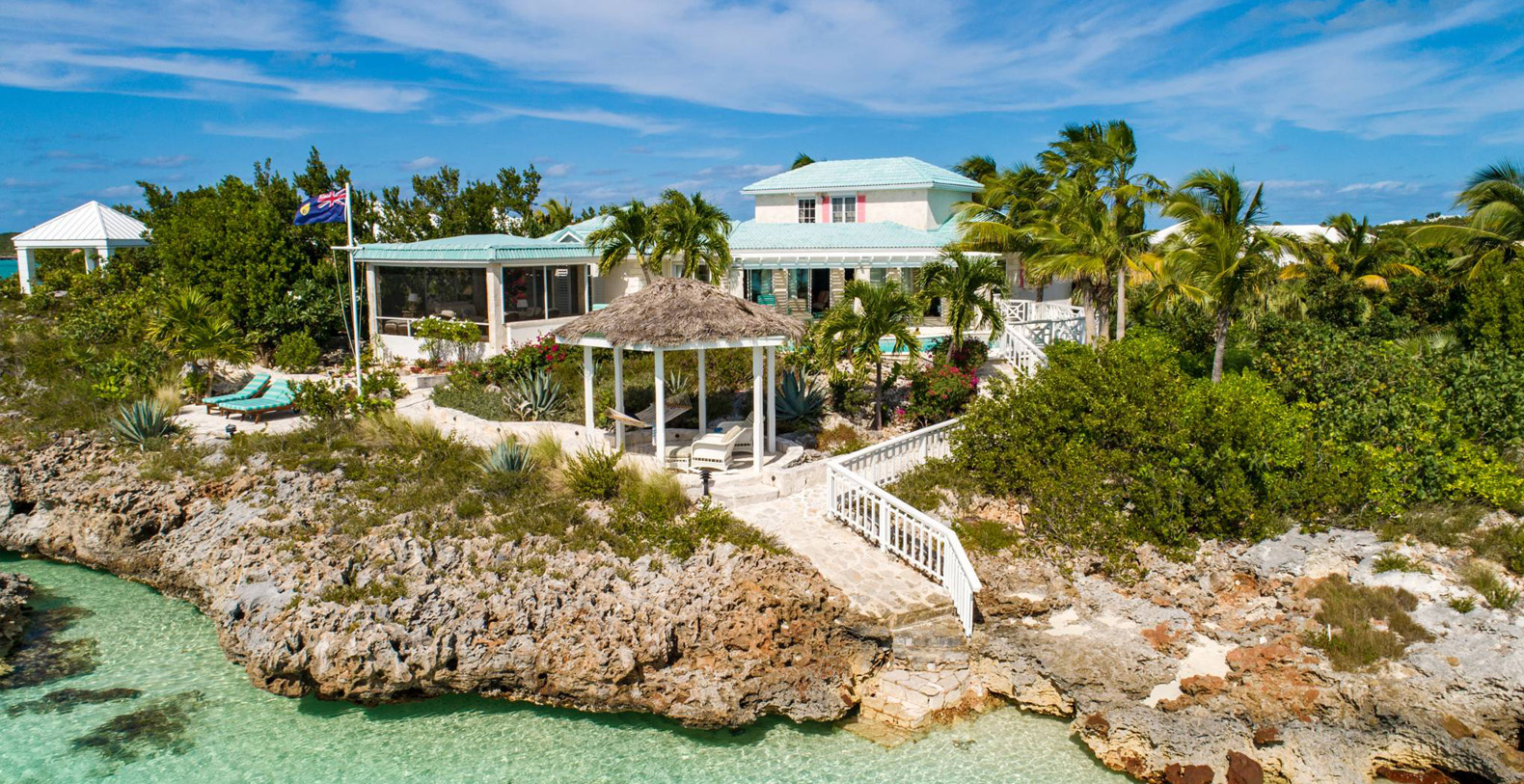 On The Rocks signifies the true Turks and Caicos lifestyle and charm. This three-bedroom luxury waterfront home was designed to be shared and enjoyed by families to relax with your shoes off and forget about time for a bit. The home is a stunning Bermudian styled residence situated on almost two acres located on the sunny southwestern shore on one of the most premiere lots in the exclusive Silly Creek Estates, a private gated community on the edge of Chalk Sound National Park. It faces south with sweeping Caribbean Sea views out to our resident Turtle Rock across the Caicos Banks to Osprey Point and West Caicos in the distance.