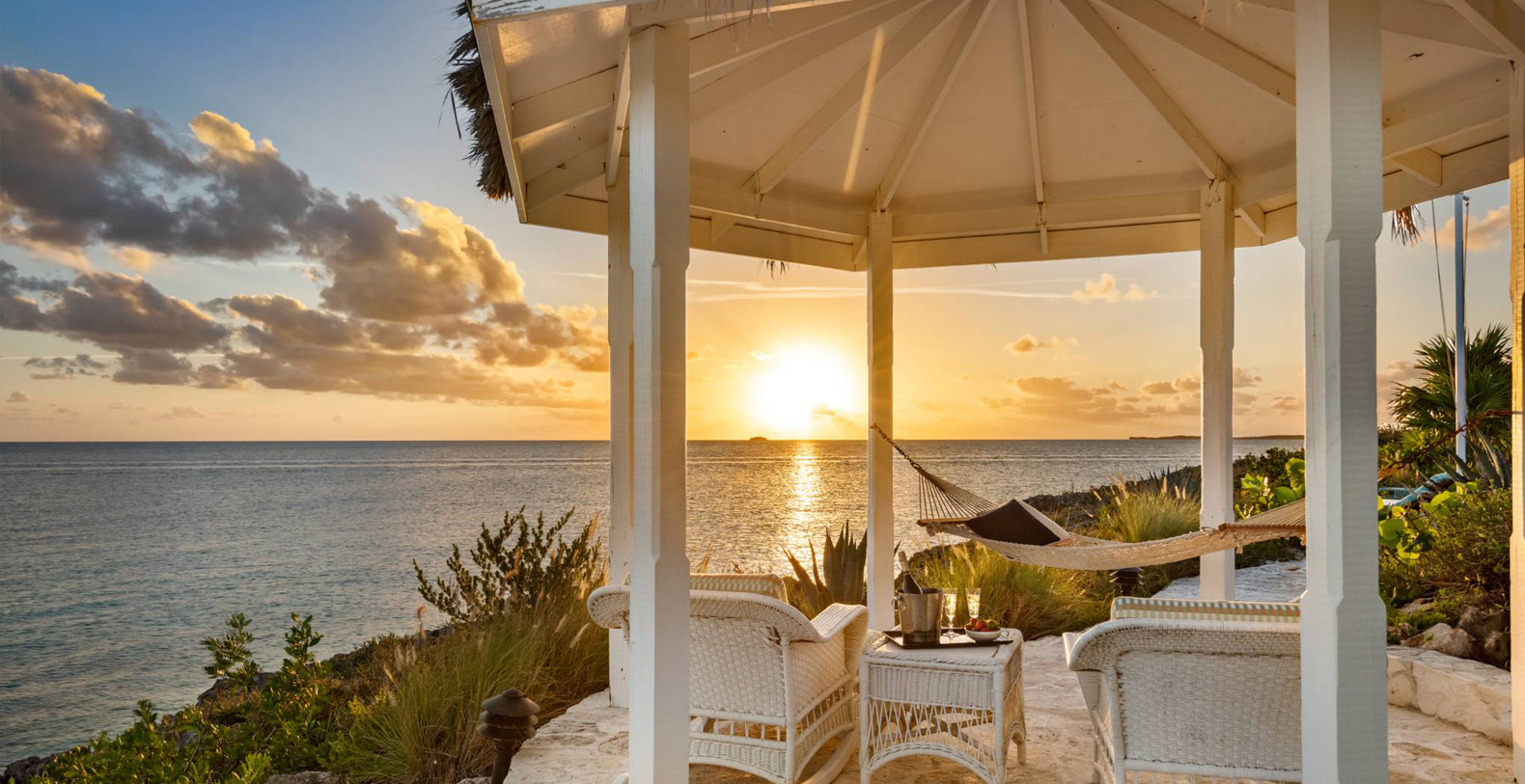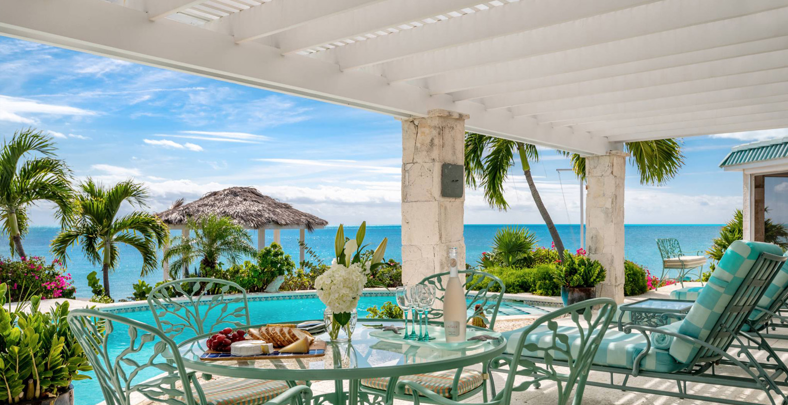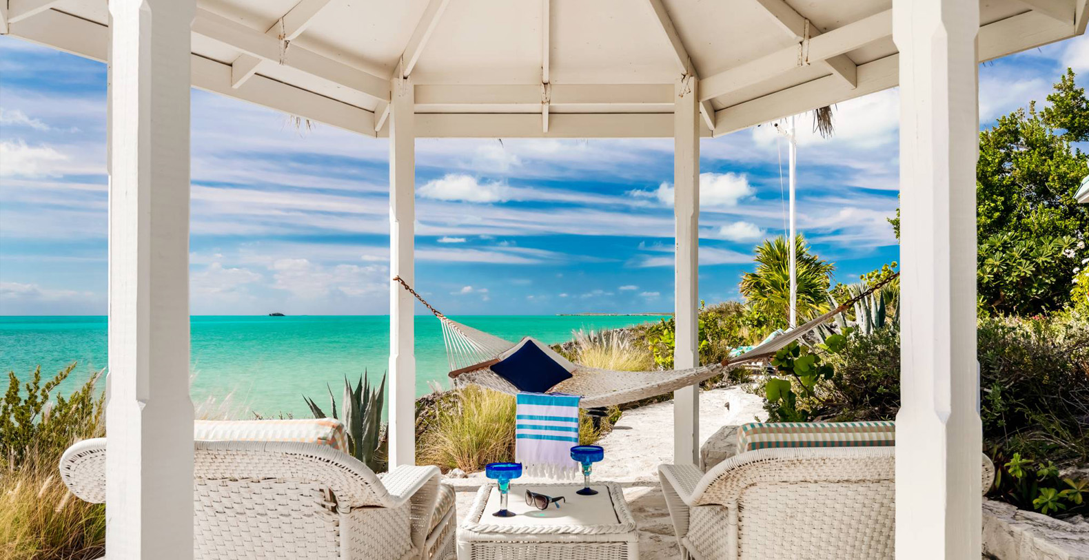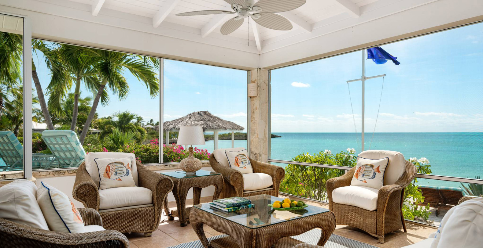 On The Rocks signifies the true Turks and Caicos lifestyle and charm. This three-bedroom luxury waterfront home was designed to be shared and enjoyed by families to relax with your shoes off and forget about time for a bit. The home is a stunning Bermudian styled residence situated on almost two acres located on the sunny southwestern shore on one of the most premiere lots in the exclusive Silly Creek Estates, a private gated community on the edge of Chalk Sound National Park. It faces south with sweeping Caribbean Sea views out to our resident Turtle Rock across the Caicos Banks to Osprey Point and West Caicos in the distance.