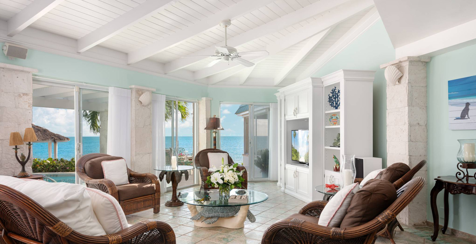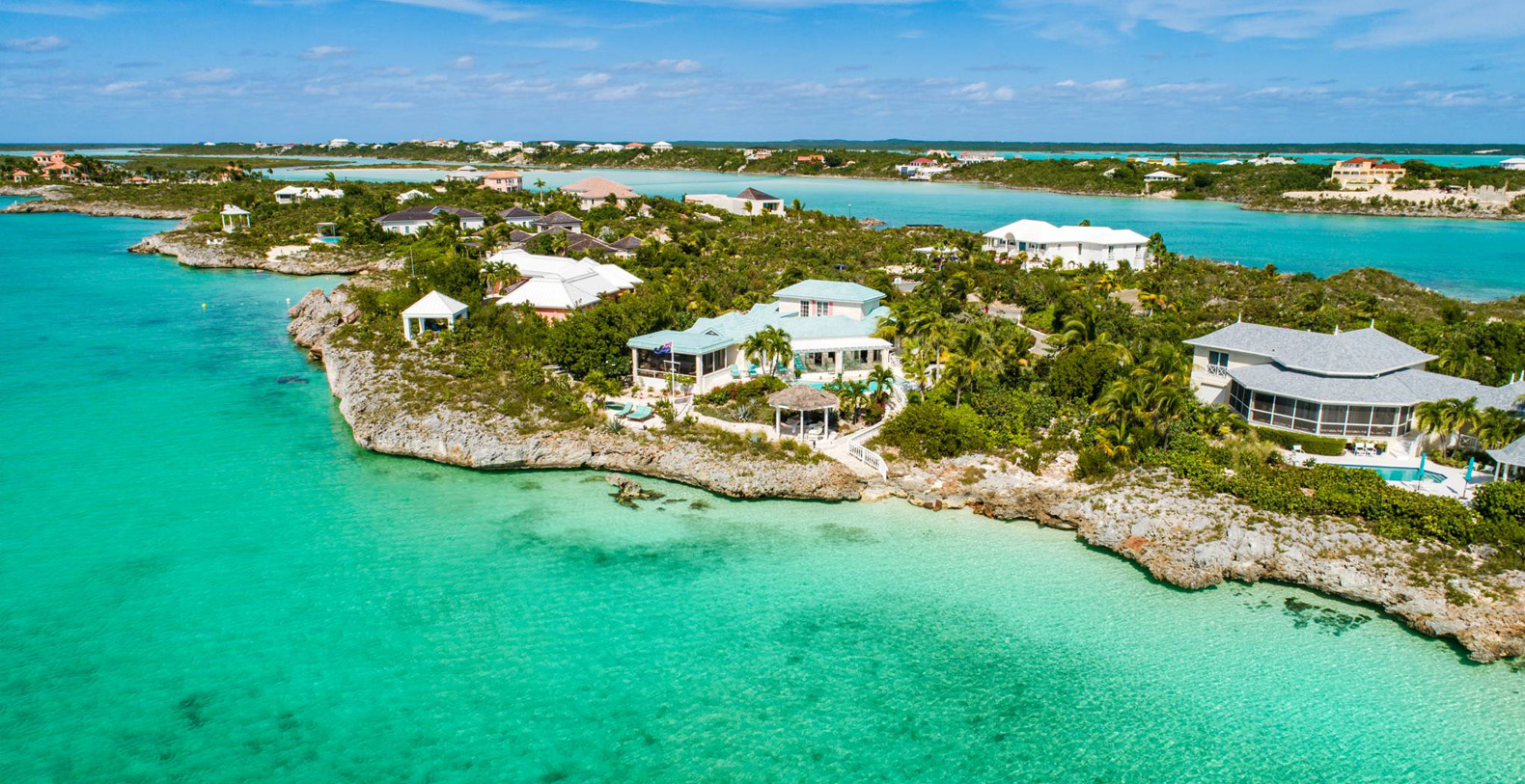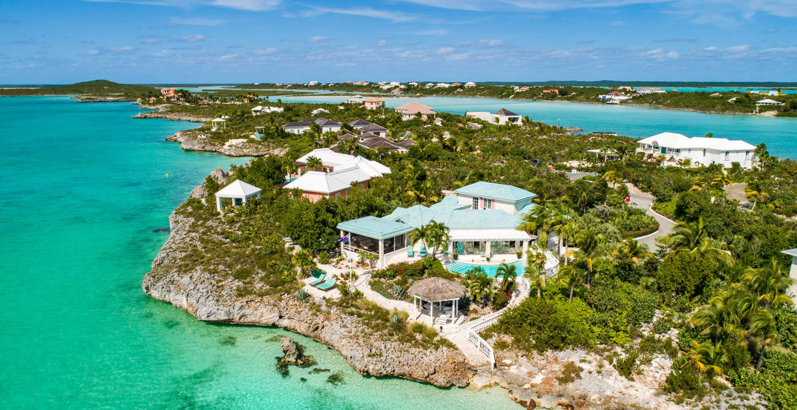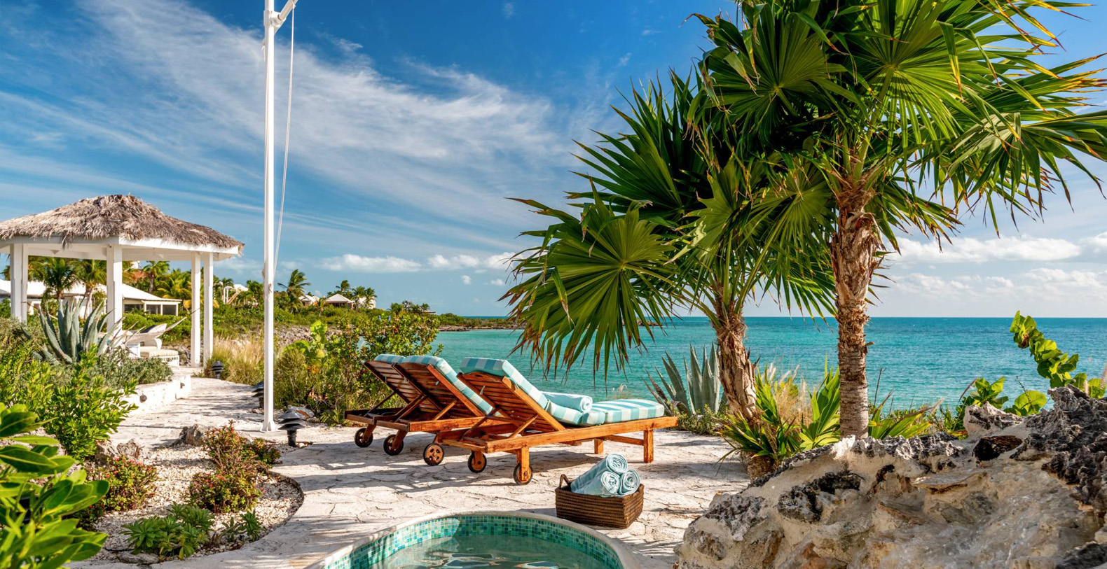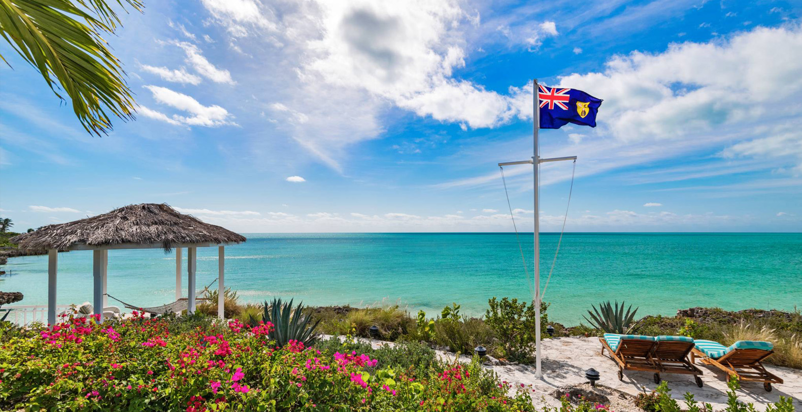 On The Rocks signifies the true Turks and Caicos lifestyle and charm. This three-bedroom luxury waterfront home was designed to be shared and enjoyed by families to relax with your shoes off and forget about time for a bit. The home is a stunning Bermudian styled residence situated on almost two acres located on the sunny southwestern shore on one of the most premiere lots in the exclusive Silly Creek Estates, a private gated community on the edge of Chalk Sound National Park. It faces south with sweeping Caribbean Sea views out to our resident Turtle Rock across the Caicos Banks to Osprey Point and West Caicos in the distance.