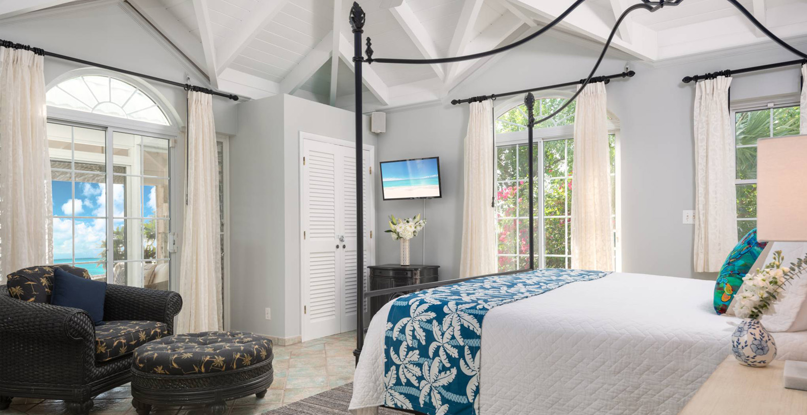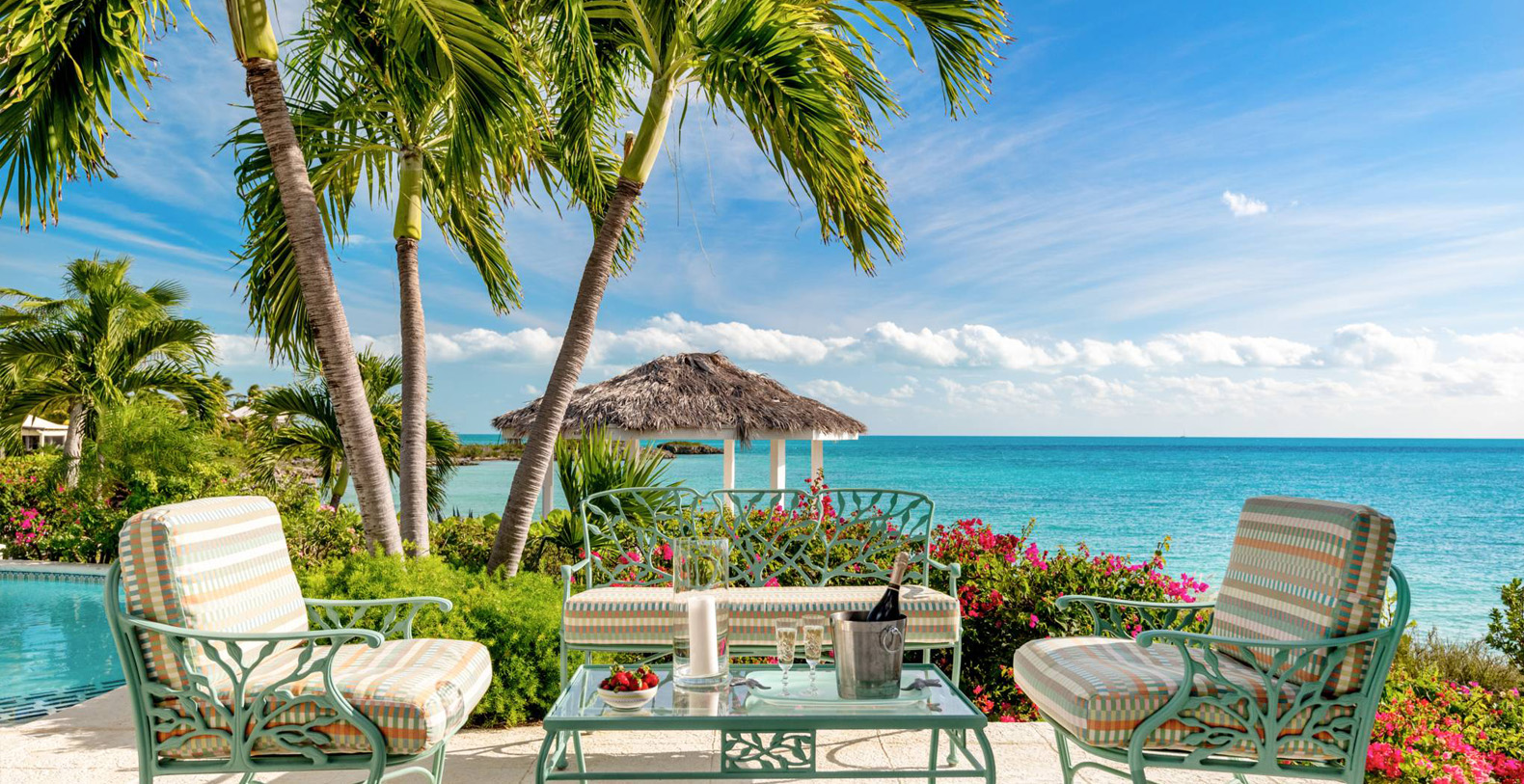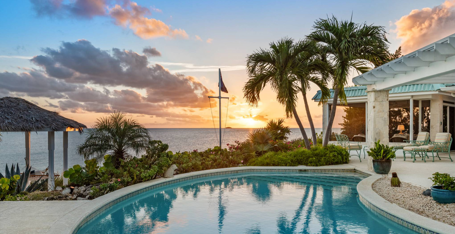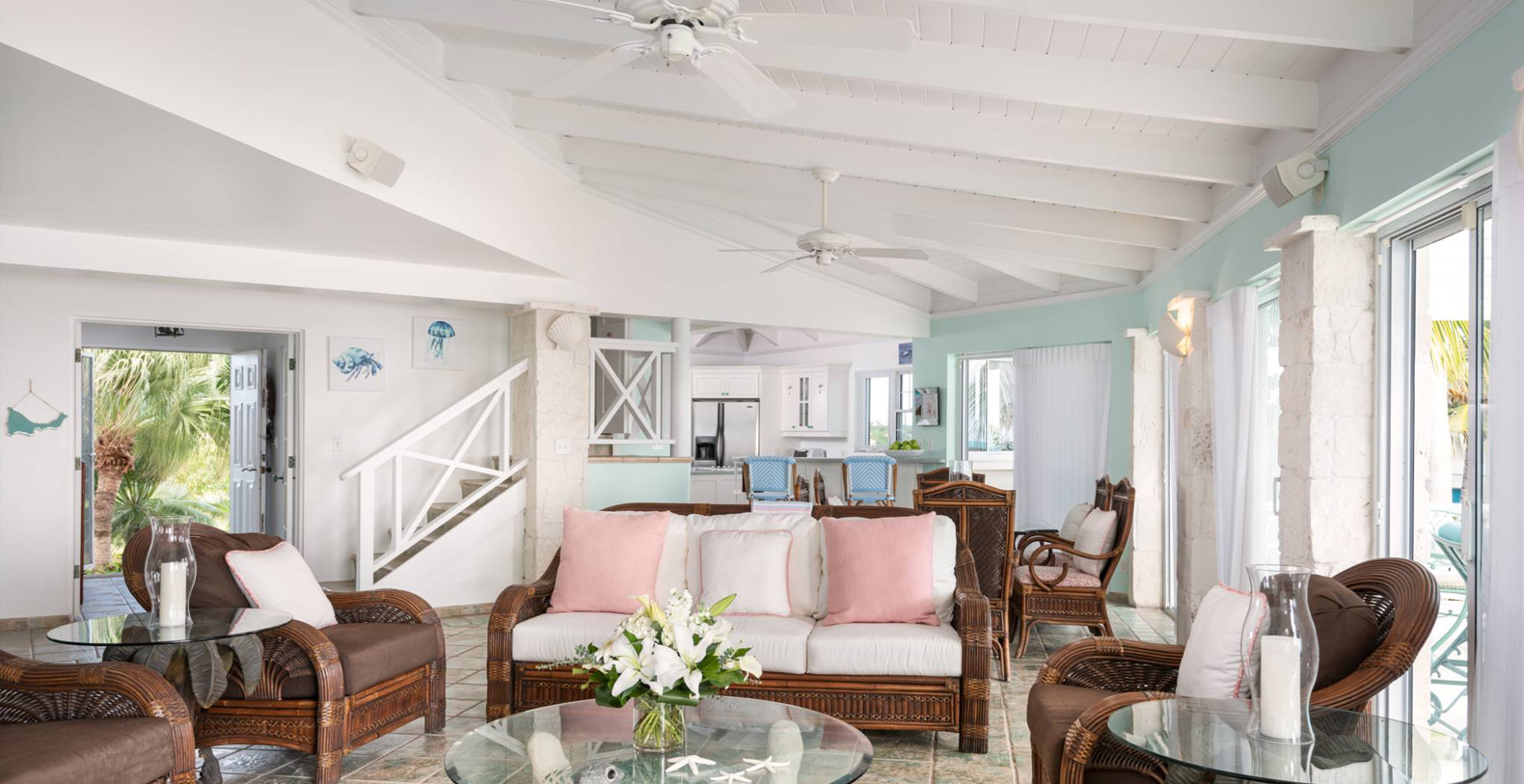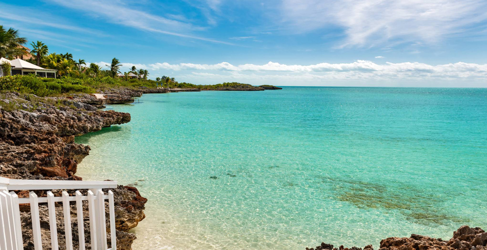 On The Rocks signifies the true Turks and Caicos lifestyle and charm. This three-bedroom luxury waterfront home was designed to be shared and enjoyed by families to relax with your shoes off and forget about time for a bit. The home is a stunning Bermudian styled residence situated on almost two acres located on the sunny southwestern shore on one of the most premiere lots in the exclusive Silly Creek Estates, a private gated community on the edge of Chalk Sound National Park. It faces south with sweeping Caribbean Sea views out to our resident Turtle Rock across the Caicos Banks to Osprey Point and West Caicos in the distance.