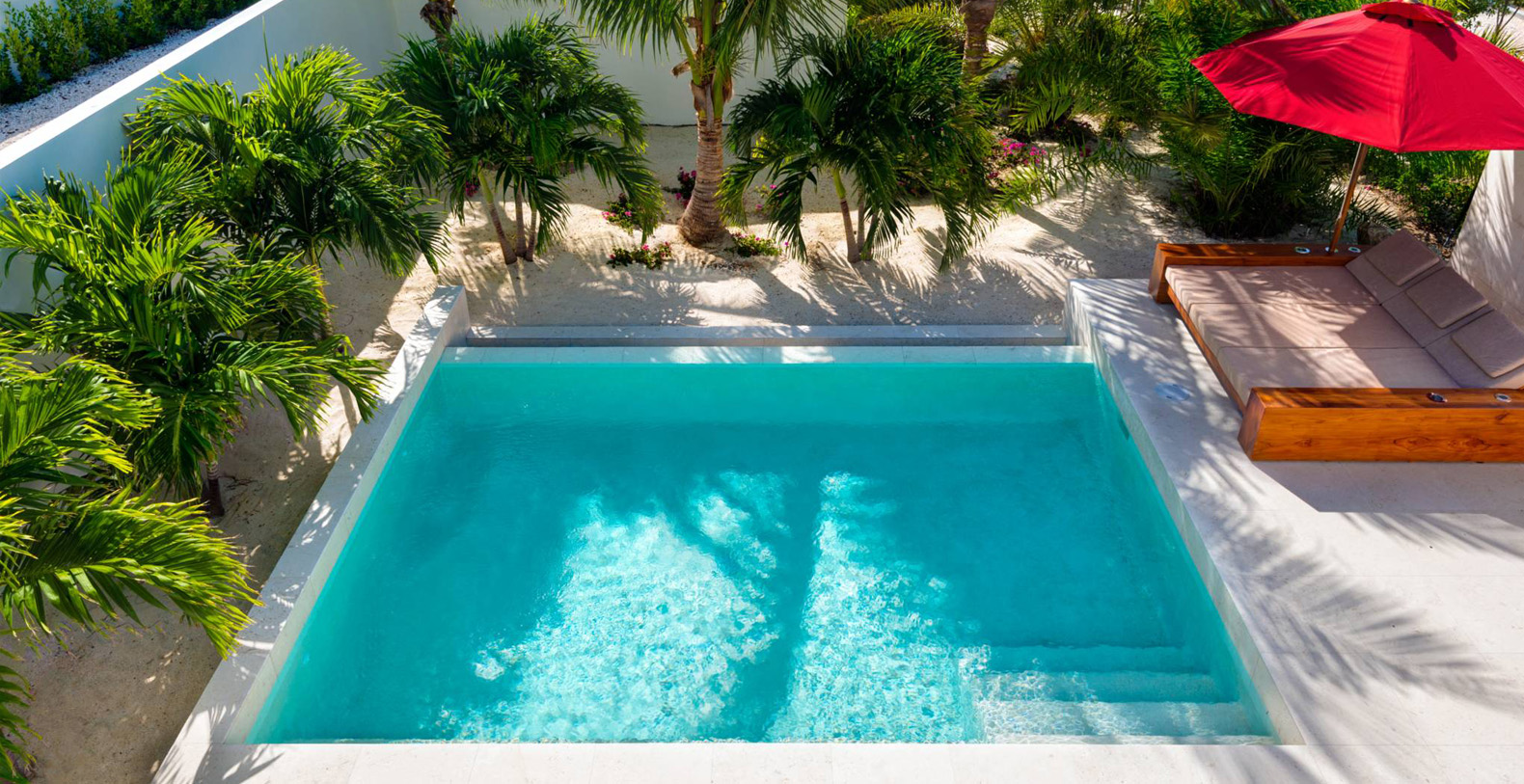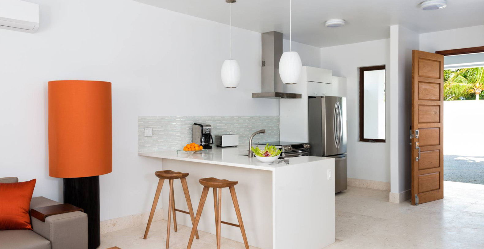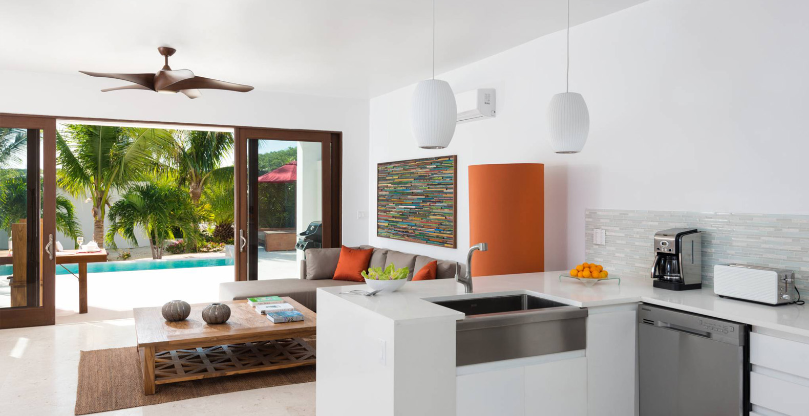 Sugar Kube offers contemporary luxury living in a private setting. This stylish one-bedroom beach villa features two levels of spacious rooms and a rooftop lounge. As soon as you step into Sugar Kube, you’ll be in an open-plan living area with sliding glass doors leading straight to your sparkling pool. The modern white kitchen is fully equipped with stainless steel appliances.