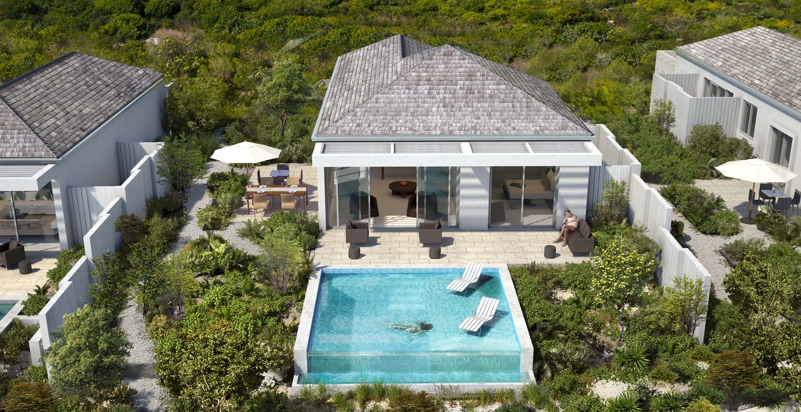 Located 20 feet above sea level with gently sloping beach access and incredible ocean views. Open-plan great room with exposed, vaulted ceiling and slider glass system opening to the private pool terrace. Infinity-edge pool with sun shelf for in-water loungers. Full-size kitchen and dining table. Spacious living area with sofa sleeper. Oceanfront master suite with open bathroom layout including large vanity, shower, soaking tub, WC and private outside shower garden. Secondary bedroom with ensuite bathroom, private entry and outdoor garden.