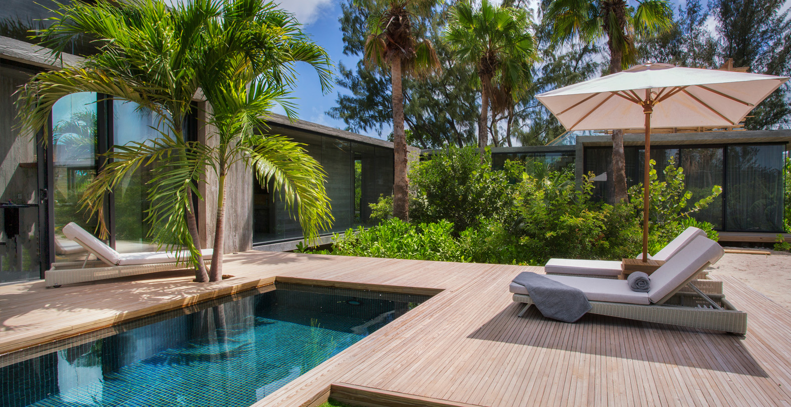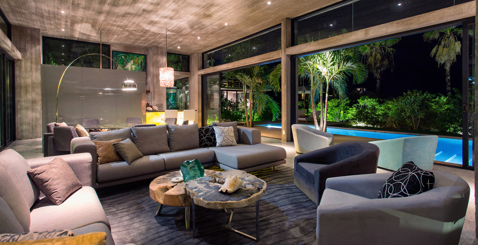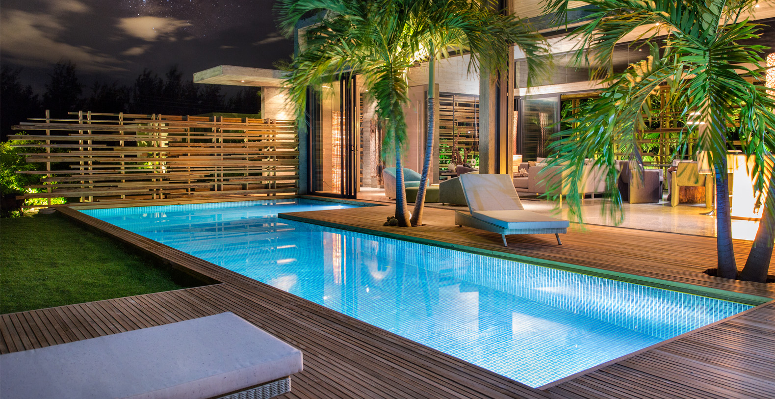 Surrounded by lush gardens abundant with palm trees and native plants, the living spaces are arranged around a sparkling mosaic clad swimming pool.