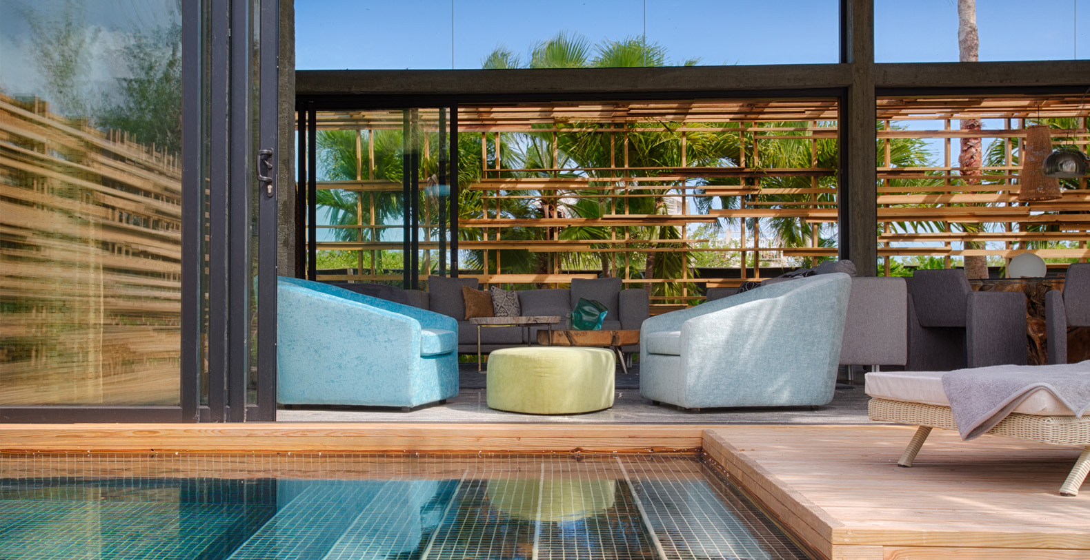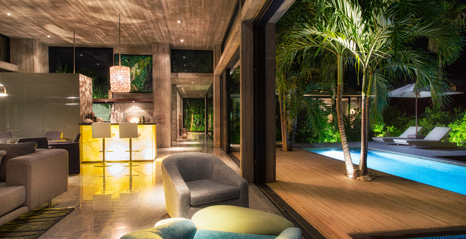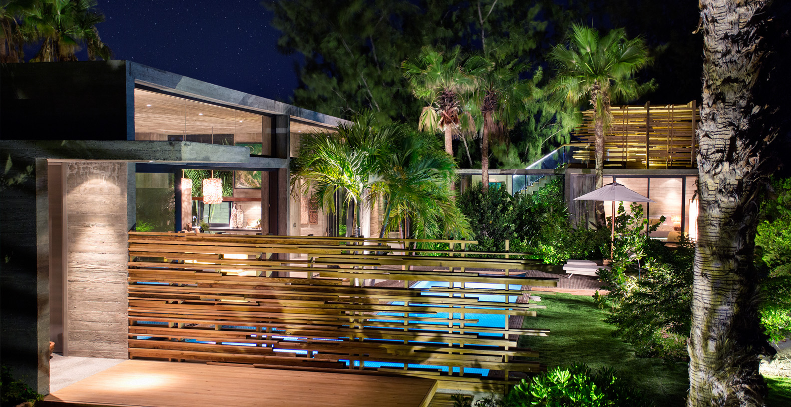 Surrounded by lush gardens abundant with palm trees and native plants, the living spaces are arranged around a sparkling mosaic clad swimming pool.