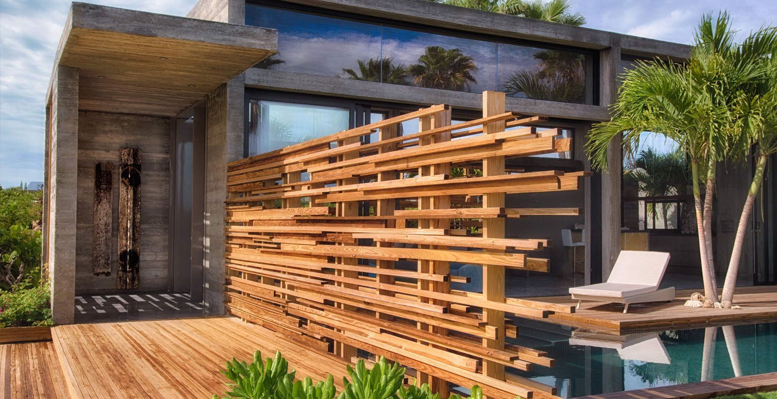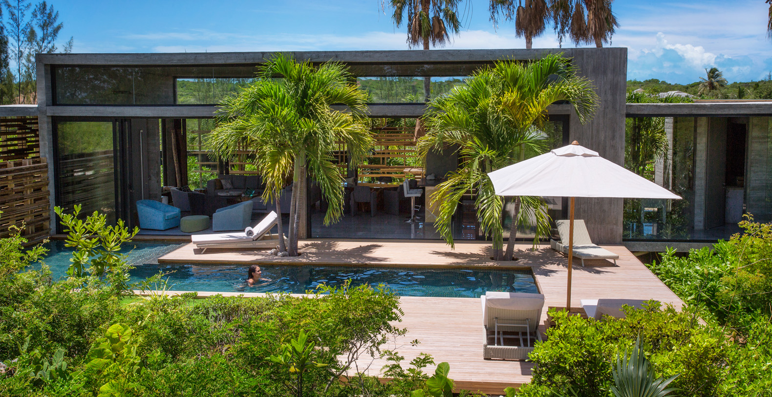 The sophisticated architecture based on a sleek palette of concrete and wood with large expanses of glass and the refined interiors make this villa a chic gateway for an island lifestyle centered on sea, sand and sunshine.