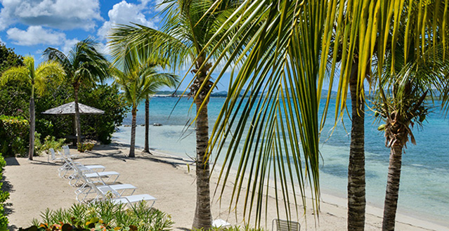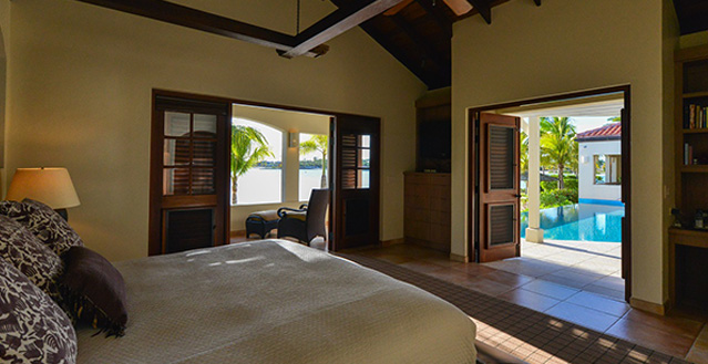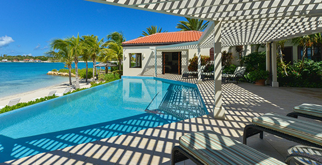 Just beyond the elegant, pergola-shaded terrace, stairs lead off from the infinity pool down to the wide palm-studded beach below. The pool area faces west towards mainland Antigua and provides captivating views of the sultry Caribbean sunsets.