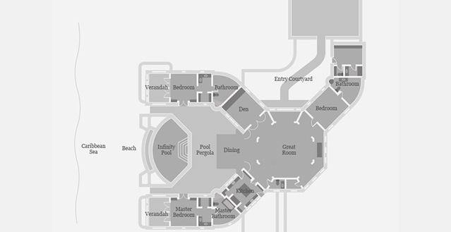Inside, timeless Mediterranean-style architecture and British Colonial furnishings are complemented by a neutral interior palette with subtle accents of pale blue which offsets the rich wood-ceilings, window casements and furniture. The home’s open floor plan features terracotta tile flooring and graceful arches throughout. Arriving at Doniford Cottage, an entry courtyard leads to a spacious octagon-shaped great room with elegant seating, a dining area for eight and a bar. This living area leads off to a covered outdoor dining area which opens to the pool and sea beyond, and to an impressive modern kitchen and an exceptionally comfortable media room with ample seating. The king-bedded master offers a terrace and a large en-suite bathroom featuring a spacious dressing area, indoor shower, bathtub and garden shower. The second bedroom has two queen beds, while the third bedroom is appointed with two doubles. Both rooms feature a bathroom with indoor and outdoor showers and a private covered veranda with seating and views of the sea.