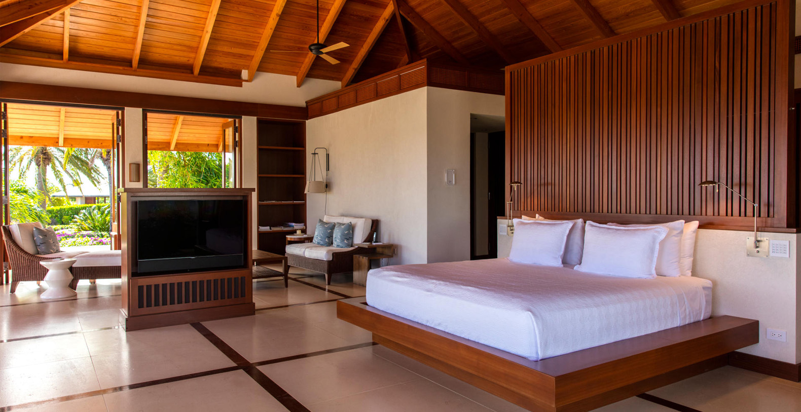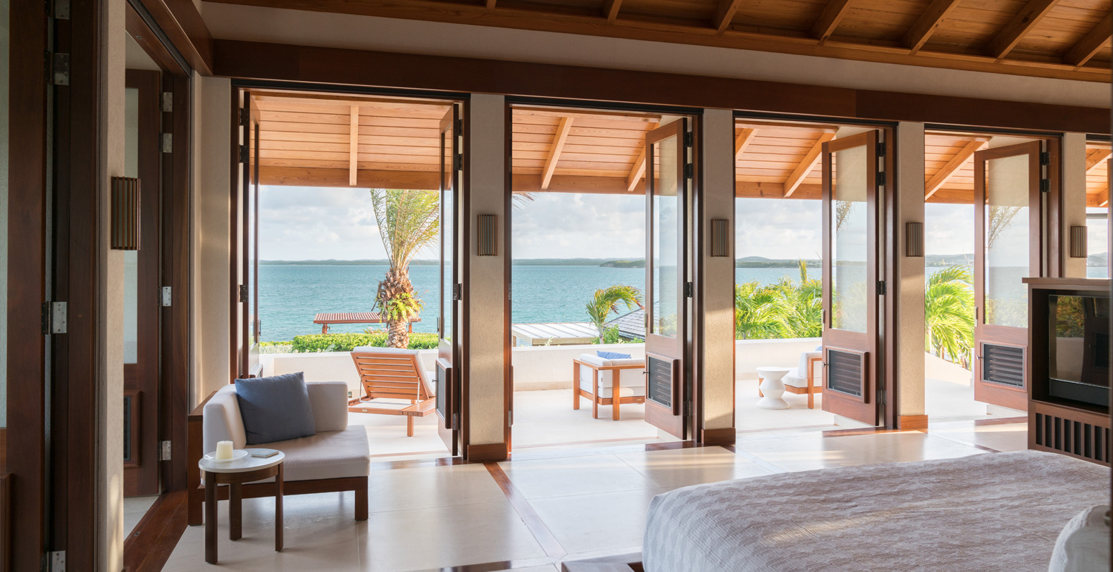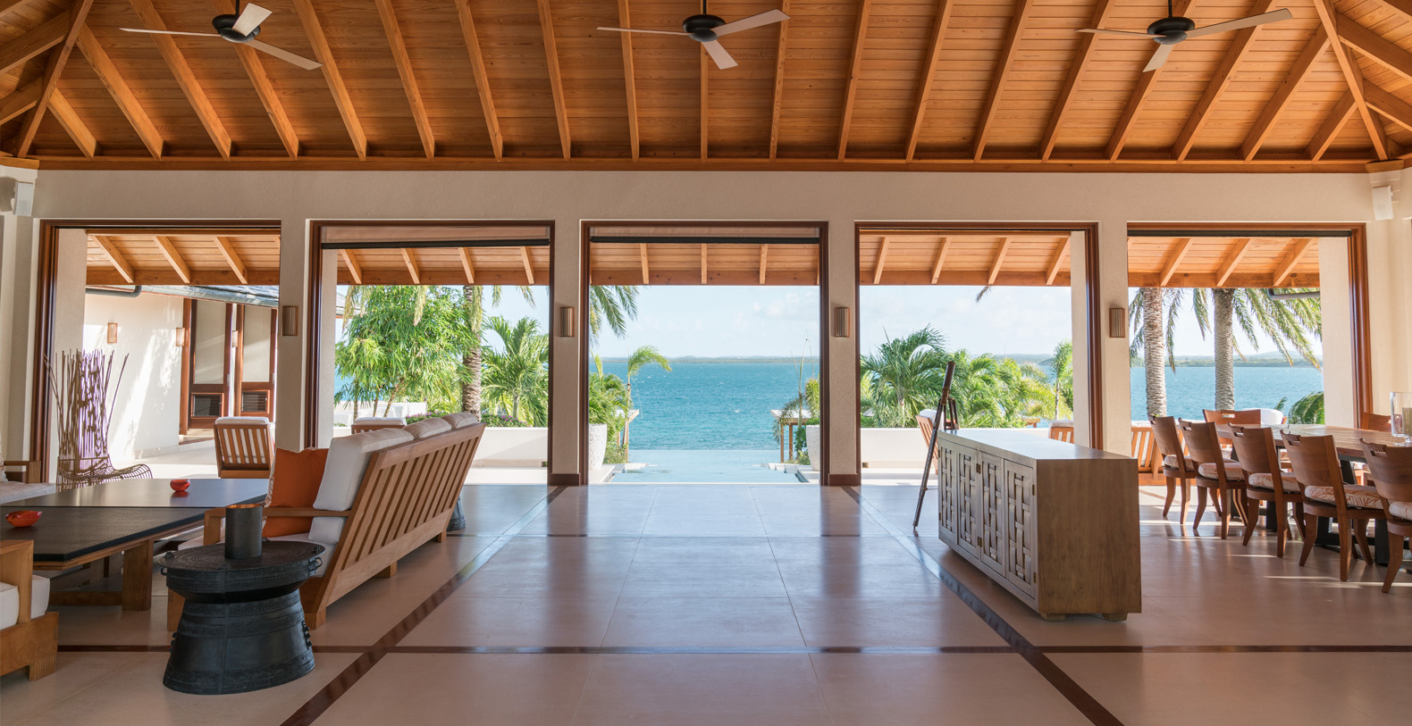 The master bedroom with its expansive open plan layout of over 1800 square feet, offers lofty ceilings and opens to incredible views of the home's gardens and the deep blue Caribbean waters just beyond the property's shoreline.