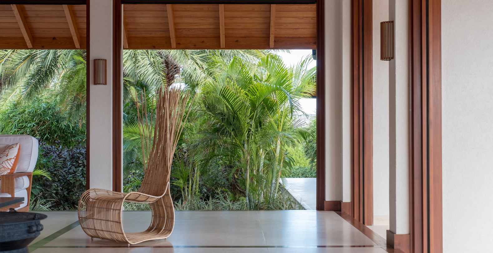 A quiet reflection pond, welcomes guests to the central open-air great room which looks out on grand cascading waterfalls and a scene of tropical gardens rolling gently toward the ocean-front.