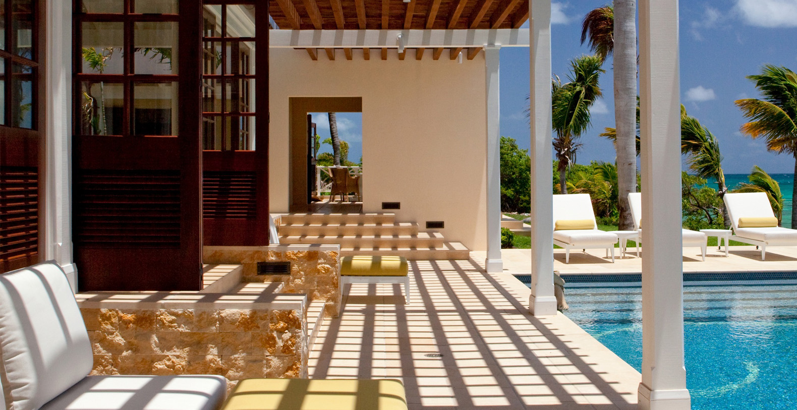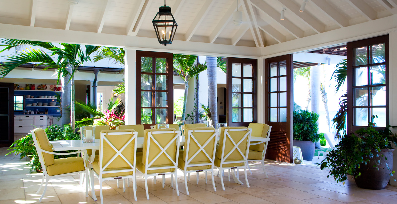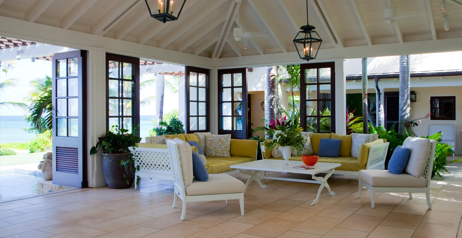 To arrive at this private, Caribbean-style estate, guests follow a long, meandering driveway through a lush tropical landscape. The six-bedroom luxury home rests on secluded, oceanfront property and is positioned to take advantage of the cooling trade winds for superior natural ventilation. The rooms of the home are oriented to face the ocean and are configured around a grand outdoor living and dining pavilion, which offer sweeping panoramic ocean views.