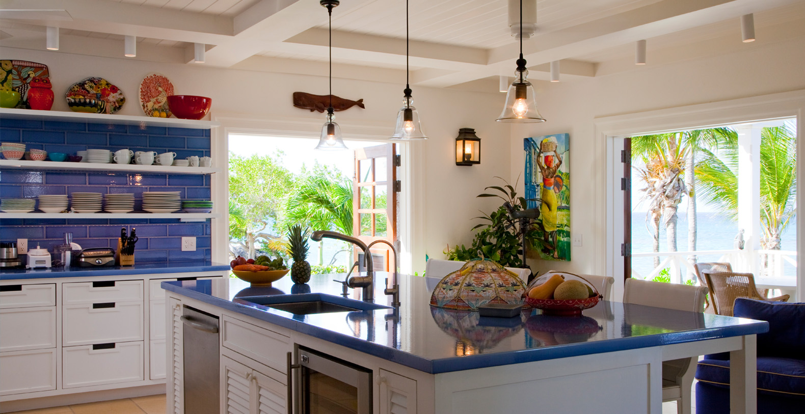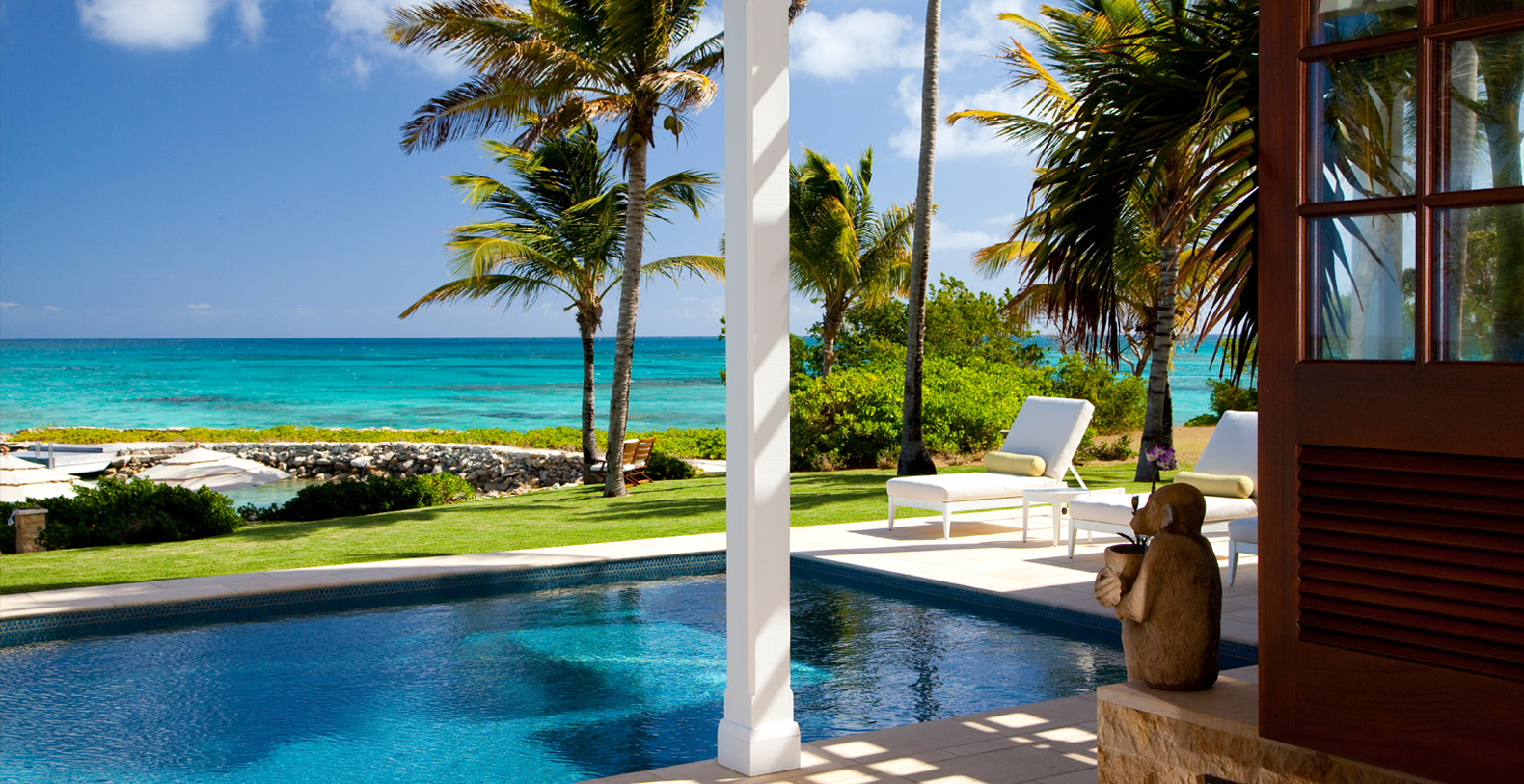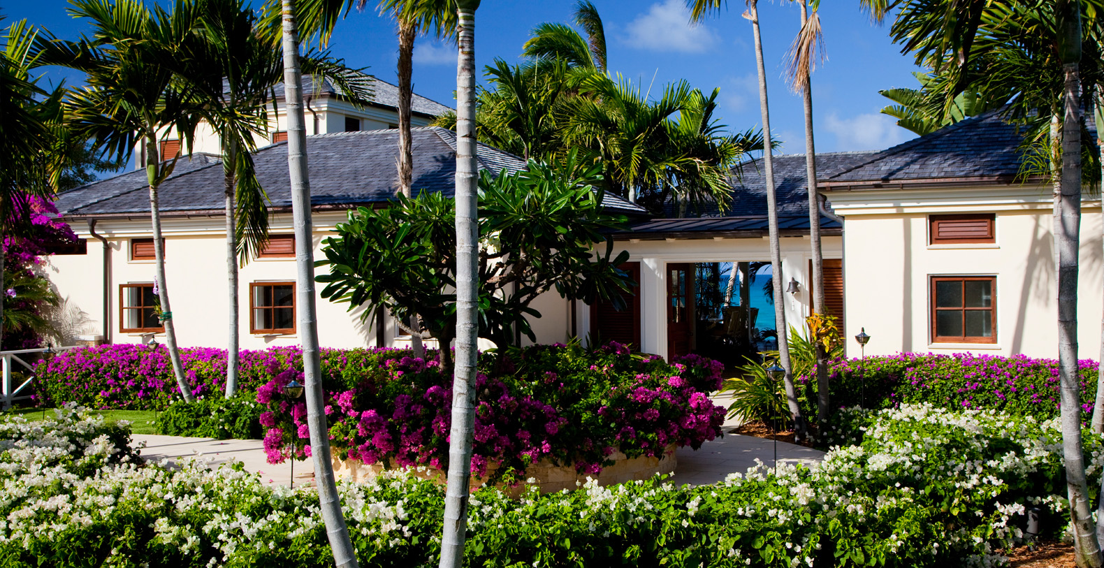 To arrive at this private, Caribbean-style estate, guests follow a long, meandering driveway through a lush tropical landscape. The six-bedroom luxury home rests on secluded, oceanfront property and is positioned to take advantage of the cooling trade winds for superior natural ventilation. The rooms of the home are oriented to face the ocean and are configured around a grand outdoor living and dining pavilion, which offer sweeping panoramic ocean views.