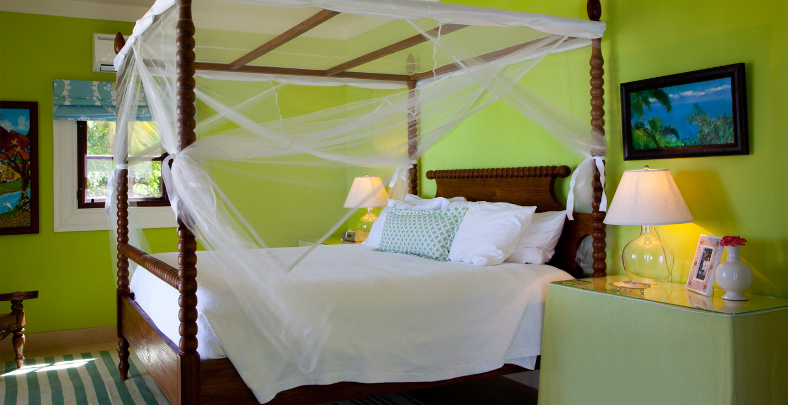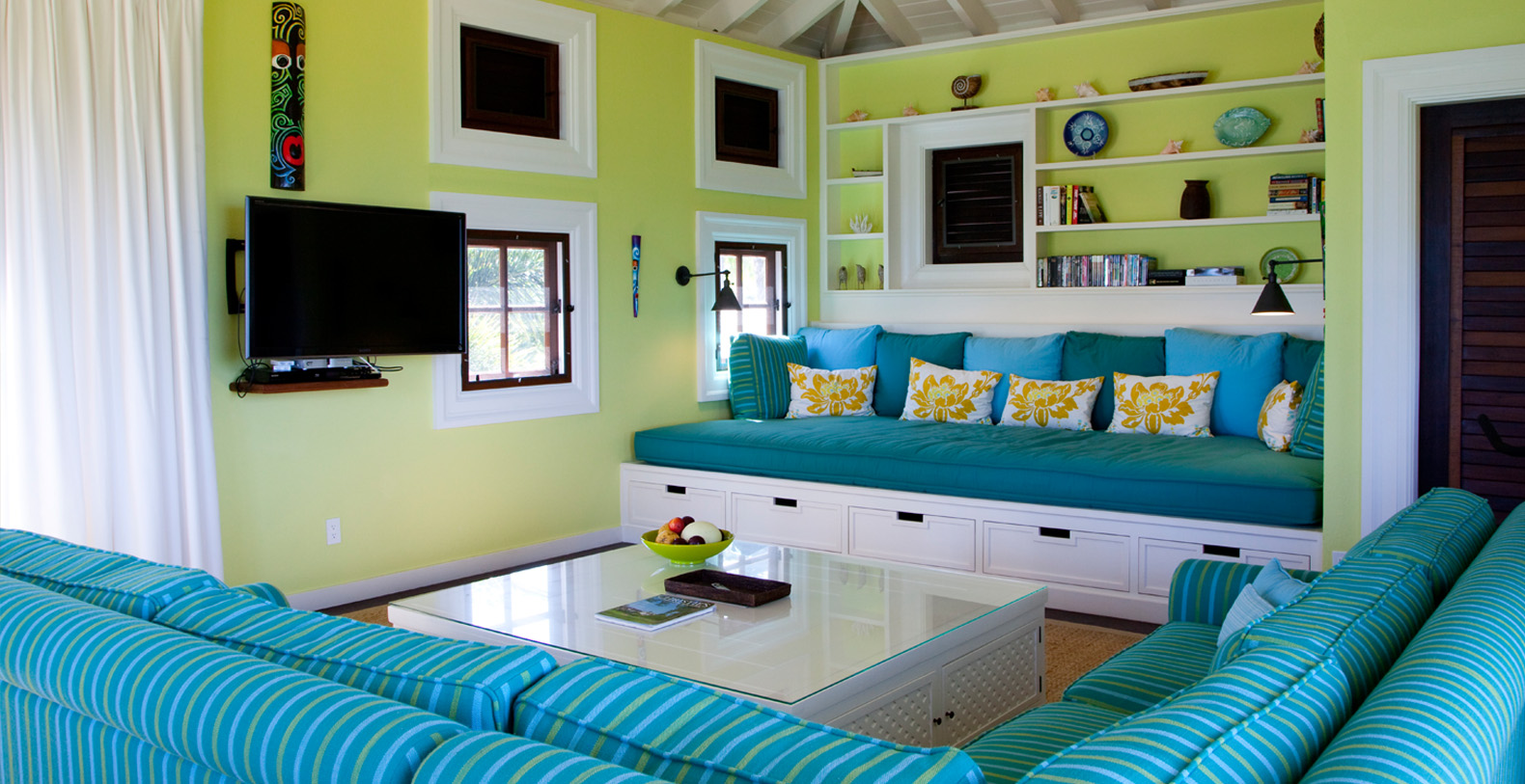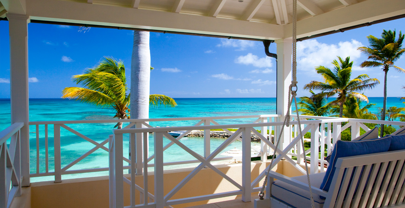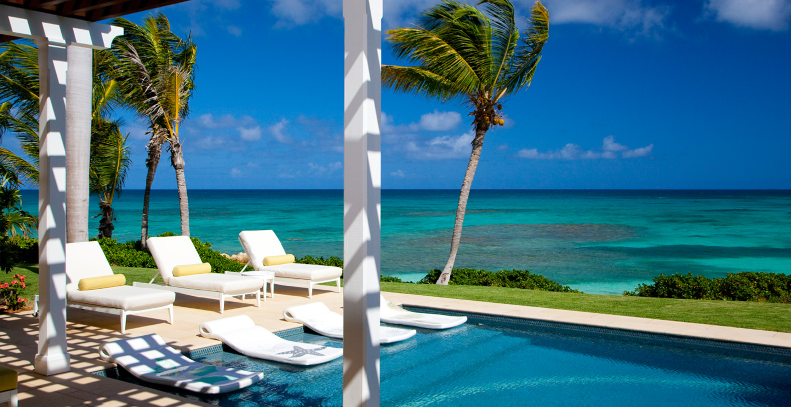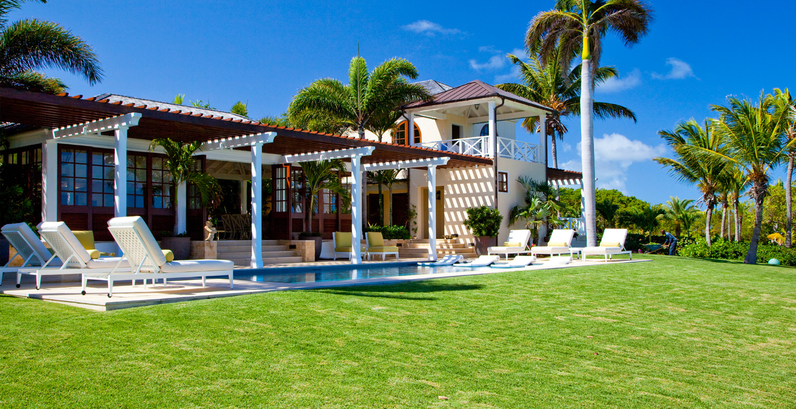 Recreation abounds with the villa's own private beach, swim dock and a freshwater swimming pool with trellised seating area. Frangipani is equipped with seven bathrooms, covered golf cart parking and cable TV, DVD player and high-speed internet access.