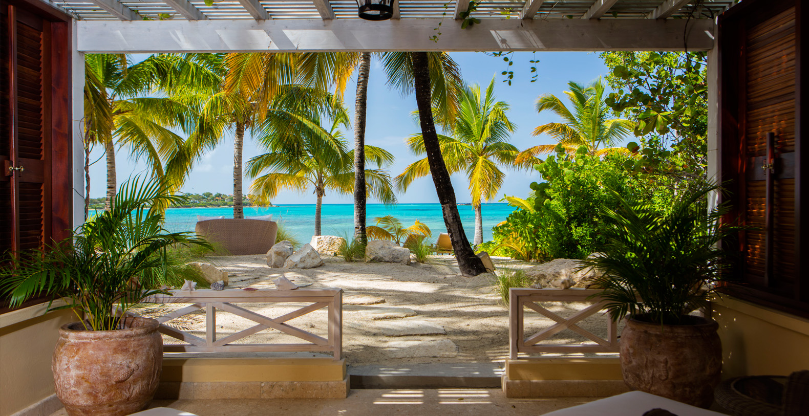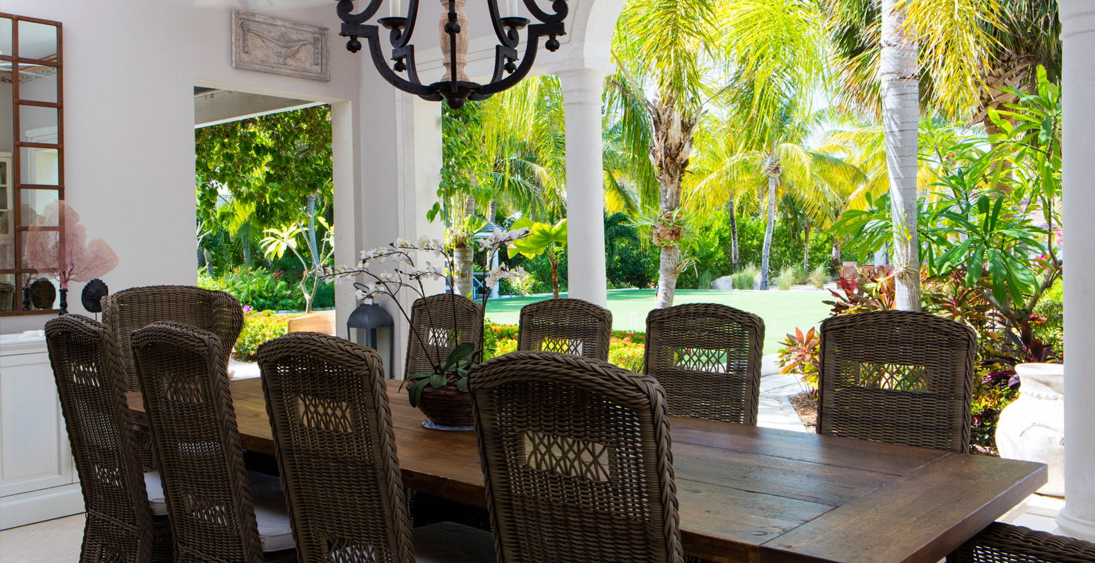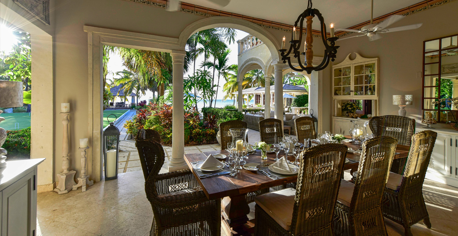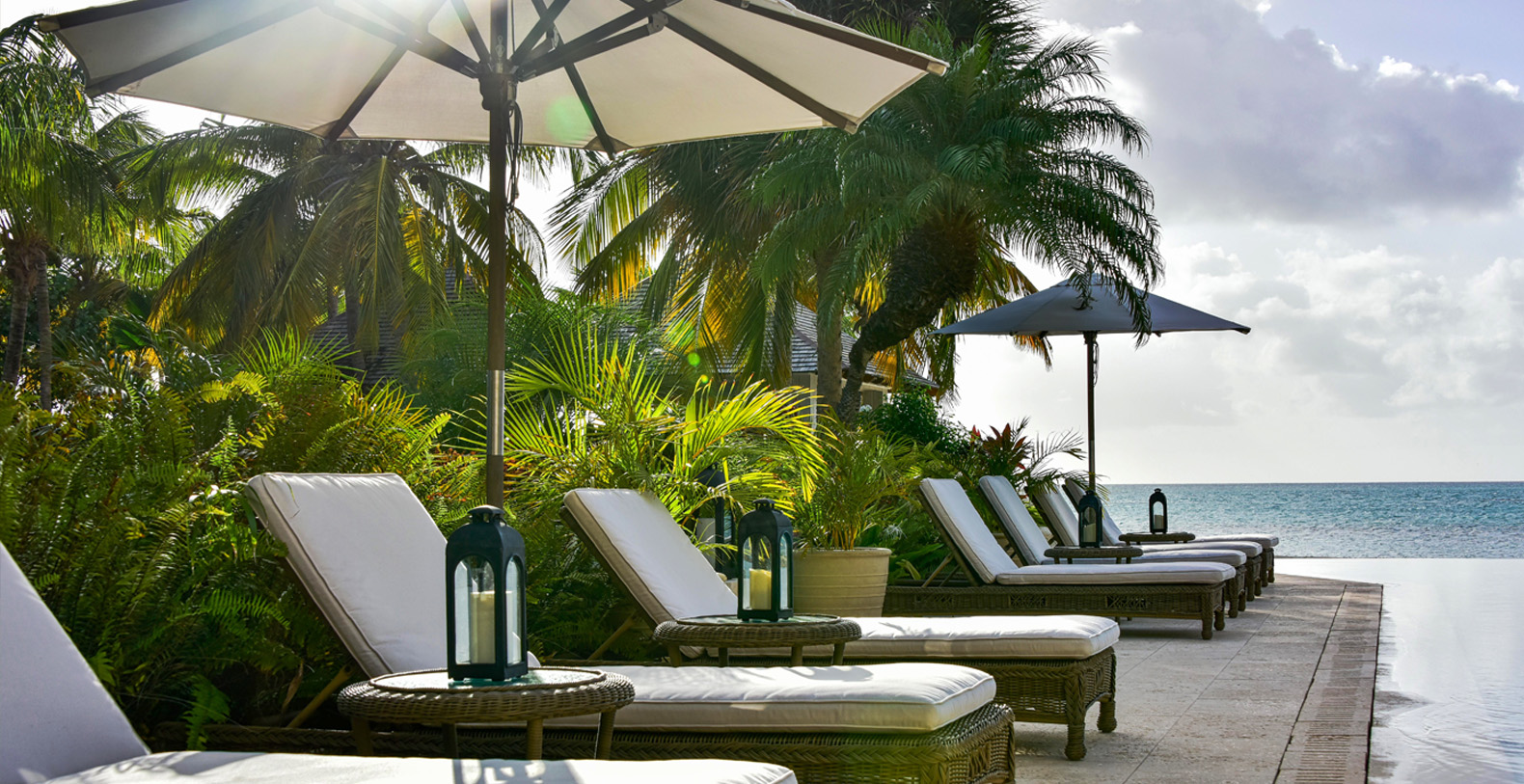 Behind the pool are covered terraces with graceful archways and beamed ceilings that provide sheltered outdoor living and dining areas. With unique furnishings and decorative touches, these spaces offer the comforts of a relaxing indoor space with uninterrupted views of the sea, and soothing trade breezes. Guests can also enjoy drinks or a meal on a dining terrace with lounge area just steps from the tranquil waters of the Caribbean.