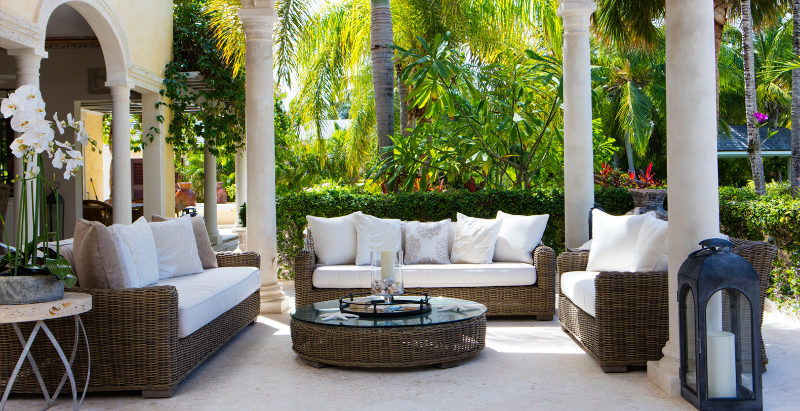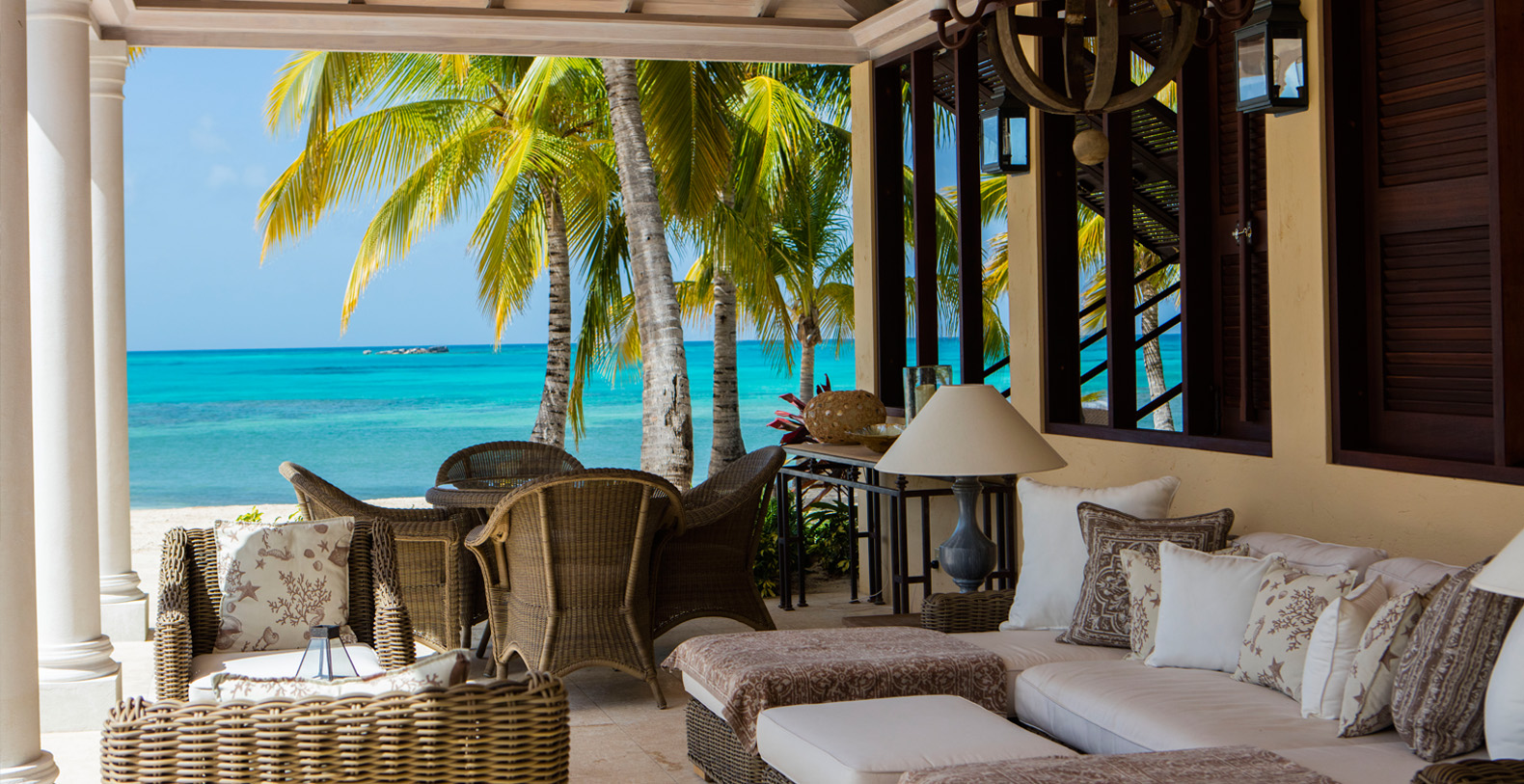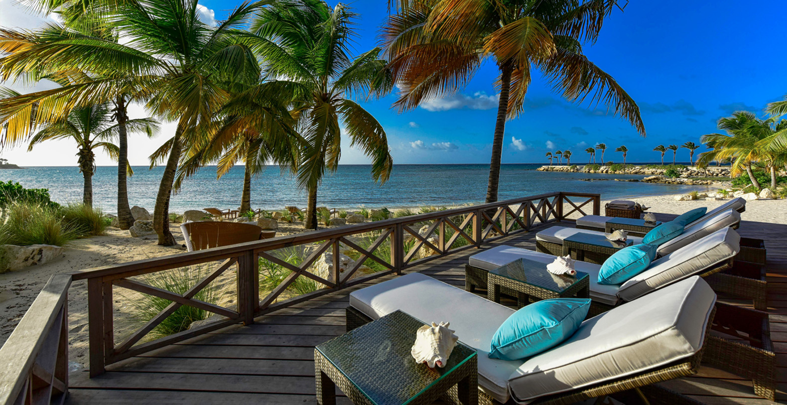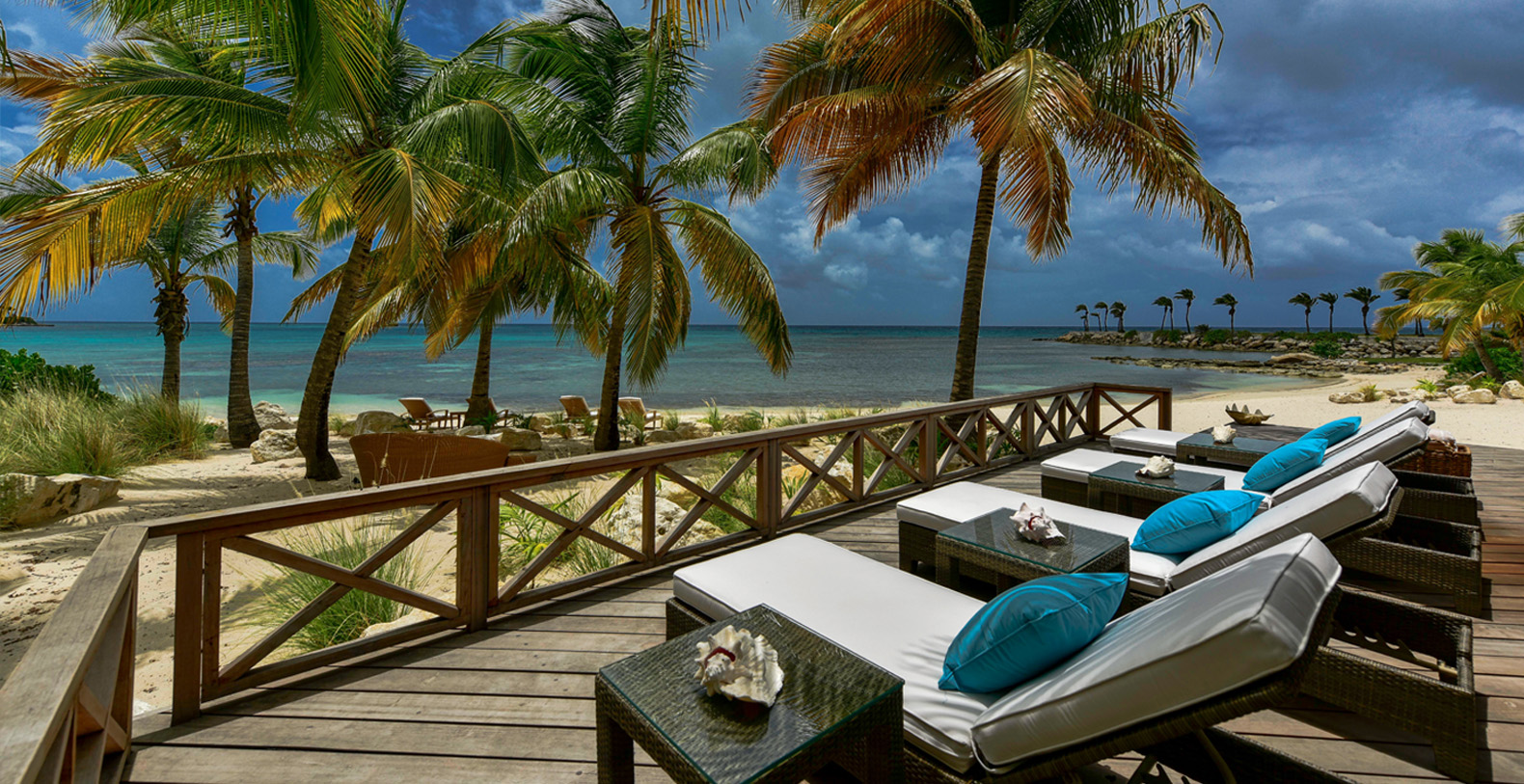 Behind the pool are covered terraces with graceful archways and beamed ceilings that provide sheltered outdoor living and dining areas. With unique furnishings and decorative touches, these spaces offer the comforts of a relaxing indoor space with uninterrupted views of the sea, and soothing trade breezes. Guests can also enjoy drinks or a meal on a dining terrace with lounge area just steps from the tranquil waters of the Caribbean.